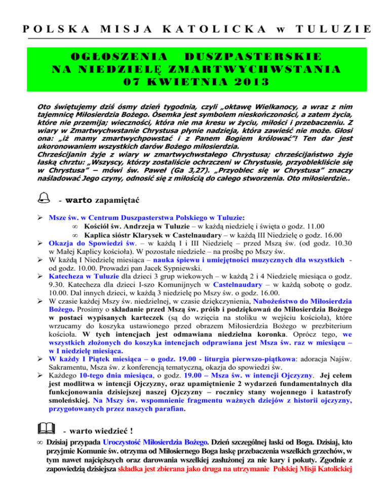 POLSKA MISJA KATOLICKA w TULUZIE OGŁOSZENIA DUSZPASTERSKIE NA NIEDZIELĘ ZMARTWYCHWSTANIA 07 KWIETNIA 2013 Oto świętujemy dziś ósmy dzień tygodnia, czyli „oktawę Wielkanocy, a wraz z nim tajemnicę Miłosierdzia Bożego. Ósemka jest symbolem nieskończoności, a zatem życia, które nie przemija; wieczności, która nie ma kresu w życiu, miłości i przebaczeniu. Z wiary w Zmartwychwstanie Chrystusa płynie nadzieja, która zawieść nie może. Głosi ona: „iż mamy zmartwychpowstać i z Panem Bogiem królować”! Ten dar jest ukoronowaniem wszystkich darów Bożego miłosierdzia. Chrześcijanin żyje z wiary w zmartwychwstałego Chrystusa; chrześcijaństwo żyje łaską chrztu: „Wszyscy, którzy zostaliście ochrzczeni w Chrystusie, przyoblekliście się w Chrystusa” – mówi św. Paweł (Ga 3,27). „Przyoblec się w Chrystusa” znaczy naśladować Jego czyny, odnosić się z miłością do całego stworzenia. Oto miłosierdzie.. ֠ - warto zapamiętać Msze św. w Centrum Duszpasterstwa Polskiego w Tuluzie: • Kościół św. Andrzeja w Tuluzie – w każdą niedzielę i święta o godz. 11.00 • Kaplica sióstr Klarysek w Castelnaudary – w każdą III Niedzielę o godz. 16.00 Okazja do Spowiedzi św. – w każdą I i III Niedzielę – przed Mszą św. (od godz. 10.30 w Małej Kaplicy kościoła). W pozostałe niedziele – na prośbę po Mszy św. W każdą I Niedzielę miesiąca – nauka śpiewu i umiejętności muzycznych dla wszystkich od godz. 10.00. Prowadzi pan Jacek Sypniewski. Katecheza w Tuluzie dla dzieci 3 grup wiekowych – w każdą 2 i 4 Niedzielę miesiąca o godz. 9.30. Katecheza dla dzieci I-szo Komunijnych w Castelnaudary – w każdą sobotę o godz. 10.00. Dal innych dzieci, w każdą 3 niedzielę po Mszy św. o godz. 16.00. W czasie każdej Mszy św. niedzielnej, w czasie dziękczynienia, Nabożeństwo do Miłosierdzia Bożego. Prosimy o składanie przed Mszą św. próśb i podziękowań do Miłosierdzia Bożego w postaci wypisanych karteczek (są do wzięcia na stoliku w wejściu kościoła), które wrzucamy do koszyka ustawionego przed obrazem Miłosierdzia Bożego w prezbiterium kościoła. W tych intencjach jest odmawiana niedzielna koronka. Oprócz tego, we wszystkich złożonych do koszyka intencjach odprawiana jest Msza św. raz w miesiącu – w I niedzielę miesiąca. W każdy I Piątek miesiąca – o godz. 19.00 - liturgia pierwszo-piątkowa: adoracja Najśw. Sakramentu, Msza św. z konferencją tematyczną, okazja do spowiedzi św. Każdego 10-tego dnia miesiąca, o godz. 19.00 – Msza św. w intencji Ojczyzny. Jej celem jest modlitwa w intencji Ojczyzny, oraz upamiętnienie 2 wydarzeń fundamentalnych dla funkcjonowania dzisiejszej naszej Ojczyzny – rocznicy stany wojennego i katastrofy smoleńskiej. Na Mszy św. wspomnienie fragmentu ważnych dziejów z historii ojczyzny, przygotowanych przez naszych parafian. - warto wiedzieć ! • Dzisiaj przypada Uroczystość Miłosierdzia Bożego. Dzień szczególnej łaski od Boga. Dzisiaj, kto przyjmie Komunie św. otrzyma od Miłosiernego Boga łaskę przebaczenia wszelkich grzechów, w tym nawet najcięższych oraz darowania wszelkiej zasłużonej za nie kary i pokuty. Zgodnie z zapowiedzią dzisiejsza składka jest zbierana jako druga na utrzymanie Polskiej Misji Katolickiej • • • • • we Francji. W niedziele 17 lutego zebraliśmy na ten cel 218,41 Euro. Do tego dołożyliśmy kwotę 26,20 która jest owocem dodatkowych ofiar z zakupu Głosu Katolickiego za ostatnie pół roku. Dzisiaj przeprowadziliśmy drugą zbiórkę na ten cel. Mam nadzieje, że uda nam się razem zebrać przynajmniej 300 Euro. To jest minimalna kwota, jaka oczekuje od naszej parafii Biuro Misji w Paryżu. Dziękuję też wszystkim, którzy wysłali na ten cel ofiary w kopertach. Zachęcam bardzo do ofiarności na ten cel. Zarząd i biura Polskiej Misji żyją i pracują jedynie z tych ofiar. Przypominam o kopertach i możliwości odliczania złożonej kwoty ofiary od podatków. W czasie ceremonii święceń pokarmów w Wielką Sobotę, zbierane były dobrowolne ofiary na organizacje tegorocznego Dnia Dziecka w naszej parafii. Wbrew oczekiwaniom zebraliśmy od uczestników kwotę 240,61 Euro. Wszystkim, którzy złożyli na ten cel swój „wdowi grosik” – bardzo serdecznie dziękuję. W rzeczywistości nie był to tylko wdowi grosik, bo były i banknoty 20 Euro. Ci z parafian, którzy byli w święta nieobecni w naszym kościele, mogą się jeszcze dołączyć do tego dzieła i złożyć swoją ofiarę w zakrystii. Jutro – tj. w poniedziałek 8 kwietnia – przypada Uroczystość Zwiastowania Pańskiego. Msza św. o godz. 19.00. W przyszłą środę – 10 kwietnia, o godz. 19.00 – kolejna Msza św. za Ojczyznę. W przyszłą sobotę, tj. 13 kwietnia o godz. 15 spotkanie dzieci I-szo Komunijnych i rodziców z katechetami. Jej celem jest przeprowadzenie 1-szej próby ceremonii w kościele oraz przygotowanie do 1-szej spowiedzi św. Obecność obowiązkowa! Zbliża się doroczna już 138 Pielgrzymka Polonijna do Lourdes (08-12.05.2013) pod przewodnictwem ks. Bpa Lechowicza. Hasło: „Lourdes Brama Wiary”. W tym samym czasie będzie miało miejsce także 5 Europejskie Spotkanie Młodzieży Polonijnej. Zarówno młodzież, jak i starsi włączą się w program Kościoła we Francji wypracowany w ramach „Diakonia 2013”. Pragnieniem Polskiej Misji we Francji jest, aby z każdego dekanatu przybył chociaż 1 autokar. Ponieważ Tuluza należy do dekanatu Lourdes, to musimy zorganizować się sami. Ponieważ nie jest daleko możemy jechać własnymi samochodami i tam się włączyć do pielgrzymki. Ale możemy też zorganizować wyjazd wspólnie busami. Jeżeli są osoby chętne pojechać razem, to od dziś proszę przesyłać do mnie emailem swoje zgłoszenia, żebyśmy wiedzieli ilu jest chętnych na taki przejazd. Osoby, które są chętne na pobyt z noclegiem, też prosimy o zgłasz