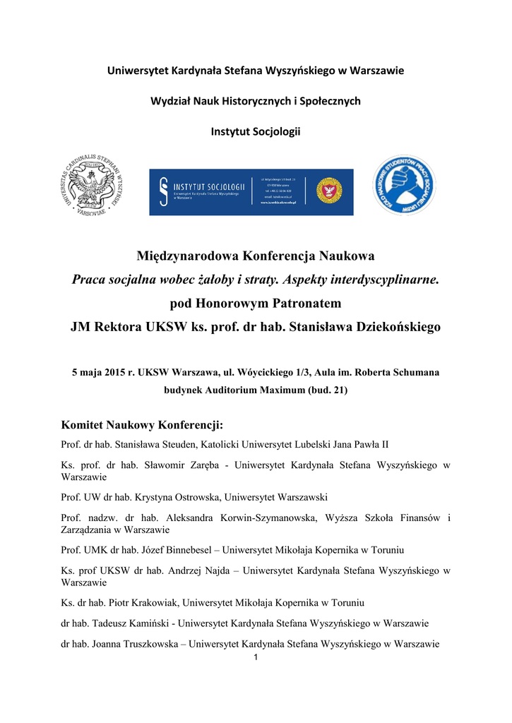 Uniwersytet Kardynała Stefana Wyszyńskiego w Warszawie Wydział Nauk Historycznych i Społecznych Instytut Socjologii Międzynarodowa Konferencja Naukowa Praca socjalna wobec żałoby i straty. Aspekty interdyscyplinarne. pod Honorowym Patronatem JM Rektora UKSW ks. prof. dr hab. Stanisława Dziekońskiego 5 maja 2015 r. UKSW Warszawa, ul. Wóycickiego 1/3, Aula im. Roberta Schumana budynek Auditorium Maximum (bud. 21) Komitet Naukowy Konferencji: Prof. dr hab. Stanisława Steuden, Katolicki Uniwersytet Lubelski Jana Pawła II Ks. prof. dr hab. Sławomir Zaręba - Uniwersytet Kardynała Stefana Wyszyńskiego w Warszawie Prof. UW dr hab. Krystyna Ostrowska, Uniwersytet Warszawski Prof. nadzw. dr hab. Aleksandra Korwin-Szymanowska, Wyższa Szkoła Finansów i Zarządzania w Warszawie Prof. UMK dr hab. Józef Binnebesel – Uniwersytet Mikołaja Kopernika w Toruniu Ks. prof UKSW dr hab. Andrzej Najda – Uniwersytet Kardynała Stefana Wyszyńskiego w Warszawie Ks. dr hab. Piotr Krakowiak, Uniwersytet Mikołaja Kopernika w Toruniu dr hab. Tadeusz Kamiński - Uniwersytet Kardynała Stefana Wyszyńskiego w Warszawie dr hab. Joanna Truszkowska – Uniwersytet Kardynała Stefana Wyszyńskiego w Warszawie 1 Komitet Organizacyjny: dr hab. Joanna Truszkowska, dr Urszula Bejma, dr Elżbieta Bojanowska, dr Martyna Kawińska, dr Justyna Kurtyka – Chałas, dr Jolanta Łodzińska Patronat: Patronat medialny: PROGRAM KONFERENCJI 8.30-9.00 Rejestracja uczestników Aula Schumana 9.00-9.30 Otwarcie Konferencji Aula Schumana Dziekan Wydziału Nauk Historycznych i Społecznych UKSW Dr hab. Tadeusz Kamiński Dyrektor Instytutu Socjologii UKSW Ks. prof. dr hab. Sławomir Zaręba 2 9.30-11.00 Sesja plenarna część I Aula Moderator: dr hab. Tadeusz Kamiński Schumana 1. Prof. UW dr hab. Krystyna Ostrowska, Uniwersytet Warszawski, Problemy współczesnego człowieka z tajemnicą śmierci 2. Prof. UMK dr hab. Józef Binnebesel – Uniwersytet Mikołaja Kopernika w Toruniu Wieloaspektowość żałoby w kontekście rozważań tanatopedagogicznych 3. Ks. dr hab. Piotr Krakowiak, Uniwersytet Mikołaja Kopernika w Toruniu, Socjalne i duchowe elementy wsparcia osób w żałobie. 4. Ks. prof UKSW dr hab. Andrzej Najda – Uniwersytet Kardynała Stefana Wyszyńskiego w Warszawie, Przeżywanie żałoby w świetle świadectw biblijnych 11.00-11.30 Przerwa kawowa 11.30-13.00 Sesja plenarna część II Aula Moderator: dr hab. Joanna Truszkowska Schumana 1. Dr hab. Maria Sroczyńska, Uniwersytet Kardynała Stefana Wyszyńskiego w Warszawie Orientacje rytualne młodzieży w kontekście żałoby - aspekty socjologiczne. 2. Dr hab. Joanna Truszkowska, Uniwersytet Kardynała Stefana Wyszyńskiego w Warszawie Nadzieja a strata 3. mgr Olga Puncewicz i dr Piotr Kiembłowski, Fundacja Nagle Sami Działania Fundacji Nagle Sami – różnorodne formy pomocy psychologicznej i oddziaływań w przestrzeni społecznej 4. mgr Anna Nita Fundacja ITAKA Zaginięcie jako strata niejednoznaczna. Doświadczenie Fundacji ITAKA w pomocy rodzinom osób zaginionych 13.00-14.00 Przerwa obiadowa 3 14.00-16.00 Obrady w sekcjach 14.00-16.00 Sekcja 1: Strata sala 024 Moderator: dr Justyna Kurtyka-Chałas 1. Prof. nadzw. dr hab. Aleksandra Korwin-Szymanowska, Wyższa Szkoła Finansów i Zarządzania w Warszawie, Postawy wobec życia osób owdowiałych 2. Dr Katarzyna Wsilewska-Ostrowska, Uniwersytet Mikołaja Kopernika w Toruniu, Samotność dziecka po stracie rodziców – wyzwania dla pracy socjalnej 3. Dr Agnieszka Wielgus, Szkoła Wyższa im.P.Włodkowica w Płocku, Sytuacja psychospołeczna i formy pomocy dla osób doświadczających żałoby po śmierci samobójczej 4. Dr Joanna Domańska, Gdańska Szkoła Wyższa w Gdańsku, Samobójstwa – charakterystyka zjawiska 5. mgr Anna Sokołowska, mgr Małgorzata Maj-Mierzejewska, Fundacja Nagle Sami, Samobójstwo jako szczególny rodzaj straty – praca z osobą w żałobie 6. mgr Ramunė Makštutytė, Vytautas Magnus University, Kaunas, Lithuania Loss nad grief within the process of relinquishing a child and motherhood 7. mgr Monika Guzewicz, Katolicki Uniwersytet Lubelski Jana Pawła II, Percepcja siebie jako matki w obliczu straty prokreacyjnej 8. Dr Justyna Kurtyka-Chałas, Uniwersytet Kardynała Stefana Wyszyńskiego w Warszawie, Rola zasobów osobistych w radzeniu sobie po stracie męża. 14.00-16.00 Sekcja 2: Zagadnienia wielodyscyplinarne sala nr 327 Moderator: dr Urszula Bejma 1. Dr Rynkowska Dorota, Uniwersytet Rzeszowski, Rola interwencji kryzysowej w systemie wsparcia klienta 2. Dr Anna Korlak-Łukasiewicz, Uniwersytet Zielonogórski, Interwencja kryzysowa po stracie 3. Dr Katarzyna Błaszczuk, Uniwersytet Rzeszowski, Żałoba jako sytuacja kryzysowa 4. Dr Ewelina Zdebska, mgr Wojciech Glac, Uniwersytet Pedagogiczny im. KEN w Krakowie, Wielowymiarowe wsparcie po stracie 4 5. Dr Urszula Bejma, Uniwersytet Kardynała Stefana Wyszyńskiego w Warszawie, Rozwód w perspektywie ponoszonych strat 6. Dr Magdalena Markocka, Uniwersytet Kardynała Stefana Wyszyńskiego w Warszawie, Żałoba a kształtowanie tożsamości człowieka 7. mgr Robert Kukowski, Uniwersytet Jana Kochanowskiego w Kielcach, Śmierć – współczesne tabu 8. Beata Czarnocka, Magda Ostrowska, Koło Naukowe Studentów Pracy Socjalnej UKSW, Strata dziadków – analiza problemu z perspektywy studentów 14.00-16.00 Sekcja 3: Praca socjalna z osobami w żałobie Aula Moderator: dr Martyna Kawińska Schumana 1. Ks dr hab. Piotr Krakowiak, Uniwersytet Mikołaja Kopernika w Toruniu, mgr Agnieszka Paczkowska Fundacja Hospicyjna, Współpraca ze szkołami w ramach programu Tumbo Pomaga jako przykład wsparcia dzieci i młodzieży w żałobie – doświadczenia gdańskie 2. Dr Aneta Jarzębińska, Uniwersytet Szczeciński, Rodzice po stracie dziecka z wadą letalną – wybrane dylematy i możliwości wsparcia 3. Dr Edyta Sielicka, Uniwersytet Szczeciński, Wsparcie społeczne w sytuacji żałoby ucznia na podstawie badań własnych 4. 