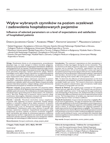 494 Hygeia Public Health 2013, 48(4): 494-499 Wpływ wybranych czynników na poziom oczekiwań i zadowolenia hospitalizowanych pacjentów Influence of selected parameters on a level of expectations and satisfaction of hospitalised patients Dorota Jachimowicz-Gaweł 1/, Agnieszka Weber 2/, Krzysztof Leksowski 3/, Małgorzata Leźnicka 1/ Zakład Organizacji i Zarządzania w Ochronie Zdrowia, Katedra Zdrowia Publicznego Wydział Nauk o Zdrowiu, Collegium Medicum w Bydgoszczy, Uniwersytet Mikołaja Kopernika w Toruniu 2/ Absolwent Uniwersytetu Mikołaja Kopernika w Toruniu, Collegium Medicum w Bydgoszczy, Wydziału Nauk o Zdrowiu, członek Koła Naukowego Organizacji i Zarządzania w Ochronie Zdrowia 3/ Katedra Zdrowia Publicznego, Wydział Nauk o Zdrowiu, Collegium Medicum w Bydgoszczy, Uniwersytet Mikołaja Kopernika w Toruniu 1/ Wstęp. Oczekiwania klienta to ich przypuszczenia, przewidywania dotyczące tego, co może nastąpić w trakcie interakcji usługowej. Budowane są one na podstawie wcześniejszych doświadczeń, działalności marketingowej firmy i jej reputacji. Oczekiwania pacjenta mogą również być definiowane jako wymagane przez pacjenta cechy usługi dostarczonej przez placówkę (dotyczące różnych wymiarów usługi). Badania pozwalające ocenić wpływ różnych czynników na oczekiwania pacjenta i tym samym na poziom jego zadowolenia czy satysfakcji pozwalają na lepsze dopasowanie oferty rynkowej do potrzeb pacjentów. Cel badań. Określenie wpływu wybranych czynników na poziom oczekiwań i zadowolenia pacjentów hospitalizowanych w wybranym niepublicznym zakładzie opieki zdrowotnej. Badano związek pomiędzy statusem materialnym pacjenta, rodzajem zabiegu, stanem zdrowia oraz częstotliwością korzystania ze świadczeń zdrowotnych. Materiał i metoda. Grupę badaną stanowiło 155 pacjentów kobiet i mężczyzn od 40 do 59 lat. Badania przeprowadzono w niepublicznym zakładzie opieki zdrowotnej. Do zrealizowania celu badań zastosowano metodę Servqual, opracowaną przez A. Parasuraman’a, V.A. Zeithaml’a oraz L. Berry’go. Polega ona na pomiarze różnicy poziomu usługi oczekiwanej i postrzeganej. Zależność zmiennych wyrażono liczbowo za pomocą współczynnika korelacji liniowej Pearsona. Wyniki i wnioski. Wysokość dochodów (status majątkowy) w sposób nikły wpływają na poziom oczekiwań. Rodzaj zabiegu wpływa w niewielkim stopniu (przy słabej istotności) na poziom oczekiwań względem dostępu do nowoczesnej aparatury medycznej i diagnostycznej oraz na dostępność oddziału szpitalnego dla odwiedzających. Subiektywna ocena stanu zdrowia w sposób nikły koreluje z poziomem oczekiwań. Częstotliwość korzystania z usług medycznych wyraźnie wpływa na poziom oczekiwań względem takich wyróżników, jak dostęp do nowoczesnej aparatury medycznej i diagnostycznej, komfort i wyposażenie sal, czystość sali i pomieszczeń sanitarnych (wysoka istotność statystyczna) oraz dostępność oddziału szpitalnego dla odwiedzających (słaba istotność statystyczna). Słowa kluczowe: Servqual, oczekiwania, usługa, pacjent, jakość Introduction. The customers’ expectations are their assumptions or predictions of what may happen during the service interaction. They are formed on the basis of previous experience, company’s marketing activities and its standing. The patients’ expectations may also be defined as parameters of a service provided by a centre and required by a patient (concerning various aspects of the service). Studies allowing assessment of various parameters influencing the patients’ expectations and, therefore, the level of their contentment or satisfaction, assist in a better tailoring of the market offer to the patients’ needs. Aim. To determine the influence of selected parameters on the level of expectations and satisfaction of patients hospitalised in the selected non-public health care centre. The research concerned a relationship between the patient’s material status, type of treatment, health status and frequency of using health care services. Material & Method. The studied group consisted of 155 patients, women and men, aged 40 to 59 years. The research was carried out in a non-public health care centre. In the study the Servqual method was used, developed by A. Parasuraman, V.A. Zeithaml and L.Berry. It is based on measuring a difference between the level of expected and perceived service. The interdependence of variables was expressed numerically, using the Pearson’s linear correlation coefficient. Results & Conclusions. Income (material status) has a negligible effect on the level of expectations. The type of treatment has a low influence (with weak significance) on the level of expectations concerning access to modern medical and diagnostic equipment, and availability of the hospital ward to visitors. A correlation between the subjective evaluation of health status and the level of expectations is negligible. The frequency of using medical services clearly influences the level of expectations towards such parameters as access to modern medical and diagnostic equipment, comfort and furnishing of rooms, room and bathroom cleanness (high statistical significance) and availability of a hospital ward to visitors (low statistical significance). Key words: Servqual, expectations, service, patient, quality © Hygeia Public Health 2013, 48(4): 494-499 Adres do korespondencji / Address for correspondence www.h-ph.pl dr n. med. Dorota Jachimowicz-Gaweł, Zakład Organizacji i Zarządzania w Ochronie Zdrowia, Katedra Zdrowia Publicznego, Wydział Nauk o Zdrowiu, Collegium Medicum w Bydgoszczy, UMK w Toruniu, ul. Sandomierska 16, 85-830 Bydgoszcz e-mail: [email protected] Nadesłano: 28.09.2013 Zakwalifikowano do druku: 23.11.2013 Jachimowicz-Gaweł D i wsp. Wpływ wybranych czynników na poziom oczekiwań i zadowolenia ... 495 Wprowadzenie Materiał i metody Jakość najprościej można zdefiniować jako spe