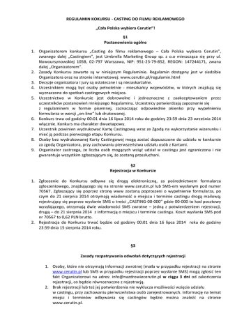 REGULAMIN KOKURSU - CASTING DO FILMU REKLAMOWEGO „Cała Polska wybiera Cerutin”! §1 Postanowienia ogólne 1. Organizatorem konkursu „Casting do filmu reklamowego – Cała Polska wybiera Cerutin”, zwanego dalej „Castingiem”, jest Umbrella Marketing Group sp. z o.o mieszcząca się przy ul. Nowoursynowskiej 105B, 02-797 Warszawa, NIP: 951-23-79-852, REGON: 147244171, zwana dalej „Organizatorem”. 2. Zasady Konkursu zawarte są w niniejszym Regulaminie. Regulamin dostępny jest w siedzibie Organizatora oraz na stronie internetowej: www.cerutin.pl/regulamin.html 3. Decyzje organizatora i jury są ostateczne i są niezaskarżalne. 4. Uczestnikiem mogą być osoby pełnoletnie - mieszkańcy województw, w których znajdują się wyznaczone do spotkań castingowych miejsca. 5. Uczestnictwo w Konkursie jest dobrowolne i jednoznaczne z zaakceptowaniem przez uczestników postanowień niniejszego Regulaminu. Uczestnicy potwierdzają zapoznanie się z regulaminem w formie pisemnej, zaznaczając odpowiednie okienko przy wypełnieniu formularza w wersji „on-line“ lub drukowanej. 6. Konkurs trwa od godziny 00:01 dnia 16 lipca 2014 roku do godziny 23:59 dnia 23 września 2014 włącznie. Konkurs ma charakter dwuetapowy. 7. Uczestnik powinien wydrukować Kartę Castingową wraz ze Zgodą na wykorzystanie wizerunku i mieć ją podczas pierwszego etapu Konkursu. 8. Osoby bez wydrukowanej Karty Castingowej mogą zostać dopuszczone do udziału w konkursie za zgodą Organizatora, przy zachowaniu pierwszeństwa udziału osób z Kartami. 9. Organizator zastrzega, że liczba osób mogących wziąć udział w castingu jest ograniczona i nie gwarantuje wszystkim zgłaszającym się, że zostaną przesłuchani. §2 Rejestracja w Konkursie 1. Zgłoszenie do Konkursu odbywa się drogą elektroniczną, za pośrednictwem formularza zgłoszeniowego, znajdującego się na stronie www.cerutin.pl lub SMS-em wysłanym pod numer 70567. Zgłaszający się poprzez stronę www zostaną poproszeni o wypełnienie formularza, po czym do 21 sierpnia 2014 otrzymają wiadomość o miejscu i terminie castingu drogą mailową; rejestrujący się poprzez wysłanie SMS o treści „CASTING-00-000” gdzie 00-000 to kod pocztowy wysyłającego, otrzymają dwie wiadomości SMS zwrotne – jedną z potwierdzeniem rejestracji, drugą – do 21 sierpnia 2014 z informacją o miejscu i terminie castingu. Koszt wysłania SMS pod nr 70567 to 0,62 PLN brutto. 2. Rejestracja do Konkursu trwać będzie od godziny 00:01 dnia 16 lipca 2014 roku do godziny 23:59 dnia 15 sierpnia 2014 roku. §3 Zasady rozpatrywania odwołań dotyczących rejestracji 1. Osoby, które nie otrzymają informacji zwrotnej (maila w przypadku rejestracji na stronie www.cerutin.pl lub SMS w przypadku rejestracji poprzez wysłanie SMS) mogą zgłosić ten fakt Organizatorowi na adres: [email protected] w ciągu 3 dni od zakończenia rejestracji, co będzie równoznaczne z rejestracją. 2. Brak rejestracji lub też jej potwierdzenia nie wyklucza możliwości wzięcia udziału w castingu, przy zachowaniu pierwszeństwa osób zarejestrowanych. Informację na temat miejsc i terminów odbywania się castingów będzie można znaleźć na stronie www.cerutin.pl. §4 Zasady pierwszego etapu Konkursu 1. Pierwszym etapem Konkursu jest casting do reklamy internetowej produktu Cerutin firmy Polfarmex. 2. Casting odbędzie się w wyznaczonych przez Organizatora 9 miastach Polski w terminach 21 – 26 sierpnia 2014 – warunkiem niezbędnym do wejścia na listę miast wyznaczonych do organizacji jest uzyskanie min. 20 ważnych rejestracji z danego miasta, przy czym ostatecznego wyboru dokonuje Organizator. 3. Podczas Castingu Uczestnik musi wykonać 2 z 4 zadań konkursowych – odegranie scenek przed kamerą: a) „Odegranie roli do reklamy [lista tekstów do wyboru z listy]” (max. 15 sek.); b) „Przedstaw w sposób kreatywny zaletę preparatu Cerutin (max. 15 sek.)”; c) „Opowiedz co jest charakterystycznego w Twoim regionie/mieście (max. 15 sek.); d) „Opowiedz jakie masz sposoby Na zdrowie” (max. 15 sek.); 4. Kryteria oceny Jury: kreatywność wypowiedzi oraz sposób osobistej ekspresji podczas wykonywania zadania konkursowego. 5. Jury składające się z 2 przedstawicieli Organizatora i 3 przedstawicieli firmy Polfarmex wybierze w drodze głosowania po 2 najciekawsze nagrania z każdego miasta, które wezmą udział w drugim etapie konkursu. 6. Osoby, które w ocenie Organizatora, najlepiej poradzą sobie z zadaniami konkursowymi zostaną nagrodzone – 10 uczestników castingu z każdego miasta otrzyma upominki od marki Cerutin. §5 Zasady drugiego etapu Konkursu 1. Drugim etapem Konkursu jest głosowanie na wybrane przez Jury 18 filmów reklamowych, zmontowanych z wypowiedzi nagranych podczas Castingu. 2. Głosowanie odbywa się poprzez aplikacje na portalu społecznościowym Facebook www.facebook.com/nazdrowiecerutin/, w terminie 15 -19 września 2014. 3. Każda osoba może zagłosować tylko raz na każdy film. 4. Z 6 filmów o największej liczbie głosów Jury składające się z 2 przedstawicieli Organizatora i 3 przedstawicieli firmy Polfarmex wybierze w drodze głosowania 3 Laureatów nagrody głównej. 5. Od decyzji Jury nie przysługuje odwołanie. 6. Wyniki zostaną ogłoszone na stronie www. cerutin.pl i Facebook do 23 września 2014 roku. §6 Nagrody w Konkursie 1. Nagrodą główną w Konkursie jest udział w reklamie internetowej „Cała Polska wybiera Cerutin!”oraz nagroda pieniężna w wysokości 1 000 zł brutto. 2. Reklama internetowa będzie zmontowana, z uzyskanych podczas castingów nagrań Laureatów. 3. Emisja reklamy będzie miała miejsce tylko w Internecie. 4. Nagroda pieniężna wydana będzie zgodnie z przepisami Ustawy z dnia 26 lipca 1991r. o podatku dochodowym od osób fizycznych (tekst jednolity: Dz. U. Z 2000r. Nr 14, poz. 176 ze zmianami). Dodatkowa kwota pieniężna równa kwocie należnego podatku dochodowego z tyt