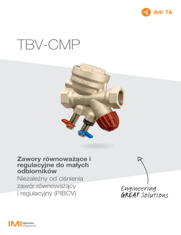 TBV-CMP Zawory równoważące i regulacyjne do małych odbiorników Niezależny od ciśnienia zawór równoważący i regulacyjny (PIBCV) IMI TA / Zawory regulacyjne / TBV-CMP TBV-CMP Zaprojektowany do regulacji płynnej lub on/off małych odbiorników końcowych w systemach grzewczych i chłodniczych. Zawór TBV-CMP z serii PIBCV zapewnia optymalną wydajność oraz długi czas bezawaryjnej pracy. Poprawna charakterystyka regulacyjna przyczynia się do dokładnej regulacji hydraulicznej. TBV-CMP wraz z naszymi urządzeniami pomiarowymi daje możliwość zaawansowanych pomiarów i diagnostyki. Wyróżniające cechy >> Pomiar ΔpL oraz ΔH Zapewnia zaprojektowany przepływ oraz łatwe rozwiązywanie problemów. >> Pokrętło nastawcze Do szybkiej i dokładnej nastawy wstępnej projektowanego przepływu. >> Przepłukanie Prosta procedura przepłukiwania zaworu zwiększa czas bezawaryjnej pracy oraz zapewnia optymalną wydajność. Dane techniczne Zastosowanie: Instalacje grzewcze i chłodnicze. Funkcje: Regulacja Nastawa wstępna (przepływu) Regulacja ciśnienia różnicowego Pomiar Odcięcie (podczas czynności konserwacyjnych) Płukanie Wymiary: DN 15-25 Klasa ciśnienia: PN 16 Ciśnienie różnicowe (ΔpV): Max. ciśnienie różnicowe: 350 kPa (ΔHmax) Min. ciśnienie różnicowe: 15 kPa (ΔHmin) (Wartości dla nastawy 10, w pełni otwartego zaworu. Inne pozycje potrzebują niższego ciśnienia różnicowego, sprawdź używając programu HySelect.) 2 Zakres przepływów: Przepływ (qmax) może być nastawiony z zakresu: DN 15 LF: 18-142 l/h DN 15 NF: 77-375 l/h DN 20 NF: 160-660 l/h DN 25 NF: 335-1330 l/h Minimalny regulowany przepływ: DN 15 LF: 3 l/h DN 15 NF: 7 l/h DN 20 NF: 10 l/h DN 25 NF: 20 l/h Temperatura: Max. temperatura pracy: 120°C Min. temperatura pracy: -20°C Skok: 4 mm Charakterystyka: Zobacz wykresy “Charakterystyka zaworu”. Nieszczelność: Pełne uszczelnienie Materiał: Korpus: AMETAL® Grzyb zaworu: PPS (polifenylosulfid) Uszczelnienie gniazda: EPDM/Stal nierdzewna (DN 15-20). EPDM/AMETAL® (DN 25). Uszczelnienie grzyba: EPDM O-ring Wkładka zaworu: AMETAL®, PPS (polifenylosulfid) Sprężyna: Stal nierdzewna Trzpień: Nedox® pokryty AMETAL®em Membrana: HNBR AMETAL® jest stopem odpornym na odcynkowanie firmy IMI Hydronic Engineering. Oznaczenia: Korpus: TA, PN 16, DN, wymiar w calach oraz strzałka kierunku przepływu. Pierścień identyfikujący na króćcu pomiarowym: Biały = Niski przepływ (LF) Czarny = Normalny przepływ (NF) Siłowniki: Patrz karta katalogowa siłownika: EMO TM Zasada działania Siła zamknięcia Siła potrzebna (F) do zamknięcia zaworu przy różnicy ciśnienia (Δp). ∆p [kPa] 450 DN 25 400 350 DN 15-20 300 250 200 150 100 50 0 85 90 95 100 105 110 115 120 125 130 F [N] 3 IMI TA / Zawory regulacyjne / TBV-CMP Charakterystyki zaworu TBV-CMP LF, DN 15 TBV-CMP NF, DN 15 q [l/h] q [l/h] 150 POS 1 400 POS 2 POS 3 100 POS 4 300 POS 5 250 POS 6 POS 2 POS 3 POS 4 POS 5 POS 6 200 POS 7 50 POS 1 350 POS 8 150 POS 9 100 POS 10 POS 7 POS 8 POS 9 POS 10 50 0 0 0 25 50 75 100 0 25 50 75 h [%] TBV-CMP NF, DN 20 TBV-CMP NF, DN 25 q [l/h] q [l/h] 700 650 600 550 500 450 400 350 300 250 200 150 100 50 0 1400 POS 1 POS 2 POS 1 POS 2 1200 POS 3 POS 3 POS 4 1000 POS 4 POS 5 POS 5 800 POS 6 POS 6 600 POS 7 POS 9 400 POS 9 POS 10 200 POS 7 POS 8 100 h [%] POS 8 POS 10 0 0 25 50 75 0 100 25 50 75 h [%] 100 h [%] Relatywne charakterystyki zaworu TBV-CMP LF, DN 15 TBV-CMP NF, DN 15 q/q max [%] q/q max [%] 100 80 60 40 POS 1 POS 2 POS 3 POS 4 POS 5 POS 6 POS 7 POS 8 POS 9 POS 10 100 80 60 40 20 POS 1 POS 2 POS 3 POS 4 POS 5 POS 6 POS 7 POS 8 POS 9 POS 10 20 0 0 0 25 50 75 100 0 25 50 75 h [%] TBV-CMP NF, DN 20 TBV-CMP NF, DN 25 q/q max [%] q/q max [%] 100 80 60 40 POS 1 POS 2 POS 3 POS 4 POS 5 POS 6 POS 7 POS 8 POS 9 POS 10 100 80 60 40 POS 1 POS 2 POS 3 POS 4 POS 5 POS 6 POS 7 POS 8 POS 9 POS 10 20 20 0 0 0 25 50 75 100 h [%] qmax = l/h dla każdej nastawy i w pełni otwartego trzpienia zaworu. h = skok 4 100 h [%] 0 25 50 75 100 h [%] Dobór Wybierz najmniejszą średnicę zaworu pozwalającą na osiągnięcie projektowanego przepływu. Nastawa wstępna powinna być jak najwyższa aby otrzymać optymalną charakterystykę obwodu regulacyjnego. Zapewnij dostępne ciśnienie różnicowe od 15-350 kPa. Rekomendowane wartości nastaw do regulacji płynnej to wartości od 3 do 10. Przy doborze najlepiej skorzystać z programu HySelect. Instalacja Przykład zastosowania TBV-CMP Montaż siłownika Wymagana wolna przestrzeń nad siłownikiem około 15 mm. TBV-CMP DN 15 = 108 mm DN 20 = 106 mm DN 25 = 115 mm TBV-CMP TBV-CMP ~15 mm TBV-CMP + EMO TM TBV-CMP TBV-CMP W przypadku instalacji chłodniczych nie zaleca się montażu siłownika do dołu z uwagi na kondensację. IP54 IP54 IP54 IP54 Kierunek przepływu Wykonanie nastawy TBV-CMP jest dostarczany z czerwonym ochronnym kapturkiem, Nr artykułu 52 143-100, który musi być używany kiedy zawór będzie zaizolowany. TBV-CMP jest dostarczany w pełni otwarty. Nastawa wstępna zgodna z wartością przepływu qmax , np. odpowiadająca wartości 5, jest wykonywana następująco: 1. Umieść pokrętło nastawcze, Nr artykułu 52 133-100, na zaworze. 2. Obróć je w taki sposób aby pozycja 5 znajdowała się naprzeciwko znaku * na korpusie zaworu. 3. Zdejmij pokrętło nastawcze. Zawór jest wstępnie nastawiony. *) Dla każdego zaworu jest tabela pokazująca przepływy maksymalne dla każdej nastawy. 5 IMI TA / Zawory regulacyjne / TBV-CMP Pomiar Pomiar i nastawa Podłącz przyrząd do równoważenia do króćców pomiarowych (5). Podaj przyrządowi typ, średnicę, rodzaj (LF/NF) i wartość nastawy wstępnej na ekranie pojawi się aktualny przepływ. 3 2 Pomiar ΔH Podłącz przyrząd do równoważenia do króćców pomiarowych (5). Zamknij zawór używając czerwonego kapturka ochronnego (1) i wykręć do końca trzpień płuczący (2). 1 4 5 Przepłukanie Przepłukanie/czyszczenie zaworu Zdejmij siłownik i nasta
