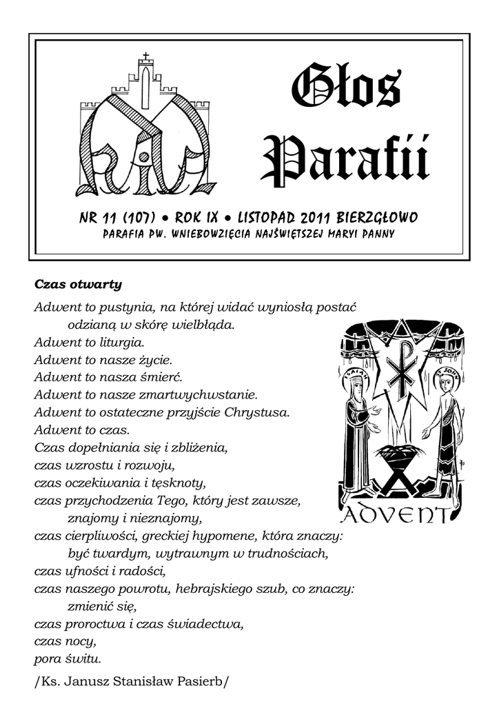 Głos Parafii NR 11 (107 ) ROK IX LISTOPAD 2011 BIERZGŁOWO PARAFIA PW. WNIEBOWZIĘCIA NAJŚWIĘTSZEJ MARYI PANNY Czas otwarty Adwent to pustynia, na której widać wyniosłą postać odzianą w skórę wielbłąda. Adwent to liturgia. Adwent to nasze życie. Adwent to nasza śmierć. Adwent to nasze zmartwychwstanie. Adwent to ostateczne przyjście Chrystusa. Adwent to czas. Czas dopełniania się i zbliżenia, czas wzrostu i rozwoju, czas oczekiwania i tęsknoty, czas przychodzenia Tego, który jest zawsze, znajomy i nieznajomy, czas cierpliwości, greckiej hypomene, która znaczy: być twardym, wytrawnym w trudnościach, czas ufności i radości, czas naszego powrotu, hebrajskiego szub, co znaczy: zmienić się, czas proroctwa i czas świadectwa, czas nocy, pora świtu. /Ks. Janusz Stanisław Pasierb/ – LISTOPADOWE KALENDARIUM – 1 listopada – Uroczystość Wszystkich Świętych (po Mszy św. o godz. 12.00 procesja za zmarłych na cmentarzu parafialnym) 2 listopada – Wspomnienie Wszystkich Wiernych Zmarłych 3 listopada – Wspomnienie św. Huberta, patrona myśliwych 4 listopada – Pierwszy piątek miesiąca – Ks. proboszcz odwiedza chorych w naszej parafii – Wspomnienie św. Karola Boromeusza 6 listopada – Liturgia niedzielna – XXXII niedziela zwykła 9 listopada – VIII Wojewódzki Festiwal Pieśni Patriotycznej „Tobie Polsko” w Diecezjalnym Centrum Kultury w Zamku Bierzgłowskim od godz. 15.00 (współorganizowany przez Akcję Katolicką z naszej parafii) 11 listopada – Święto Odzyskania Niepodległości 13 listopada – Liturgia niedzielna – XXXIII niedziela zwykła 14 listopada – Światowy Dzień Chorych na Cukrzycę 15 listopada – Światowy Dzień Rzucania Palenia – Międzynarodowy Dzień Pamięci Ofiar Wypadków Drogowych 20 listopada – Liturgia niedzielna – XXXIV niedziela zwykła – Uroczystość Jezusa Chrystusa Króla Wszechświata, święto patronalne Akcji Katolickiej 21 listopada – Wspomnienie św. Tarsycjusza, patrona Liturgicznej Służby Ołtarza – Światowy Dzień Życzliwości i Pozdrowień 22 listopada – Wspomnienie św. Cecylii, patronki muzyki kościelnej 25 listopada – Wspomnienie pierwszej błogosławionej pary małżeńskiej Marii i Alojzego Quarrrochich 27 listopada – Liturgia niedzielna – Pierwsza Niedziela Adwentu 30 listopada – Wspomnienie św. Andrzeja Apostoła – Imieniny ks. biskupa Andrzeja Suskiego, biskupa toruńskiego Adwent – czas oczekiwania, przygotowania, i… W tym roku Pierwsza Niedziela Adwentu przypada 27 listopada. Adwent rozpoczyna nowy rok kościelny i obejmuje cztery kolejne niedziele. Słowo Adwent pochodzi od łacińskiego słowa „adventus”, czyli „przyjście, przybycie, nadejście”. Dla nas chrześcijan oznacza czas przygotowujący do uczczenia narodzin Jezusa w Betlejem. Wymownym symbolem Adwentu jest wieniec i świeca adwentowa. Światło jest znakiem obecności Chrystusa – Światłości Świata. Światło -2- czterech kolejnych świec adwentowych ma nas doprowadzić stopniowo do prawdziwego Światła, wschodzącego w Boże Narodzenie. Światło wskazuje drogę, rozprasza ciemności, usuwa lęk i stwarza poczucie bezpieczeństwa i wspólnoty. Nawiązując właśnie do czasu Adwentu, czasu oczekiwania na narodziny Jezusa, jako czasu przygotowania i trwania we wspólnocie, która powinna rozwijać przede wszystkim sferę duchową, ale również mieć świadomość dbania o dar życia jakim zostaliśmy obdarowani, chciałam zwrócić uwagę na pewien problem dotyczący nas wszystkich. Otóż nocne przymrozki zmobilizowały nas do rozpoczęcia sezonu grzewczego w naszych domach. W zasadzie nic nowego, sytuacja jak co roku o tej porze. Rozmawiając o pogodzie, mówimy: jaka piękna jesień, kolory liści drzew nas rozpieszczają szczególnie, gdy świeci słońce, jesienne kwiaty czarują odcieniami żółci, brązu i fioletu w oczekiwaniu na mrozy, poranne mgły i jak to określamy „rześkie powietrze” świetnie na nas wpływają – i tu warto się chwilę zatrzymać, zastanowić. Zapewne większość z nas, wychodząc ze swoich domów popołudniu lub pod wieczór ma problem z wdychaniem powietrza, gdyż jest ono owszem chłodne, ale już zdecydowanie nie jest rześkie. Wystarczy przemierzyć nasze miejscowości pieszo, bądź rowerem, żeby zorientować się, że część z nas pali w swoich piecach śmieci. Sprzyja temu fakt, że wiele produktów sprzedawanych jest w opakowaniach z tworzyw sztucznych. Reklamówki, ogólnie folia, butelki PET po napojach albo kartoniki, pudełka po tłuszczach, środkach chemicznych, zużyte opony (są darmowe i zostawiają znikomą ilość popiołu w stosunku do drewna) oraz lakier i farba np. na porąbanej starej szafie czy przeczytane, kolorowe czasopisma – czyli plastik to śmieć, który bywa spalany w przydomowych piecach. Wiem, że dużo w tym temacie już zrobiono na naszym terenie (jest segregacja śmieci), ale jeszcze nie zmieniła się całkowicie mentalność i złe nawyki. Tylko tak trudno zrozumieć dlaczego zatruwamy sami siebie. Czy naprawdę nie zdajemy sobie sprawy, że palenie tworzyw sztucznych nas truje? Tylko, że to trucie nie jest widoczne i odczuwalne natychmiast. Silne toksycznie, czyli silnie trujące gazy, powstające podczas spalania zabijają nas i nasze rodziny powoli i cicho. Zaczyna się od alergii, później pojawia się astma, uszkodzone nerki, wątroba i droga otwarta dla nowotworu. Wiem, przedstawiłam to może zbyt dosadnie, ale jak dotrzeć do naszej świadomości, że robimy sobie krzywdę? Zastanawiające jest, że robią tak również ci, których zapewne stać na zakup opału. Ktoś powie: Ja tak nie postępuję. To świetnie, ale reagować na takie postępowanie powinniśmy wszyscy. Przecież nikt z nas nie chce wdychać śmieci, to dotyczy zdrowia naszych rodzin, a w szczególności naszych dzieci. Niech czas Adwentu przygotuje nas duchowo do powtórnego przyjścia Jezusa na ziemię, a