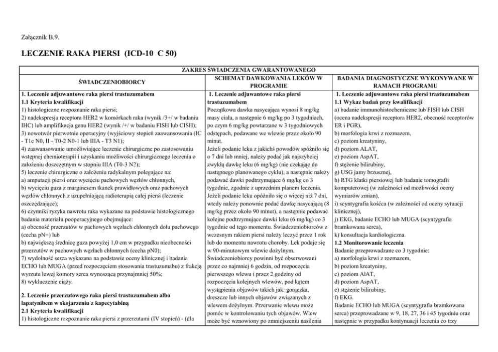Załącznik B.9. LECZENIE RAKA PIERSI (ICD-10 C 50) ZAKRES ŚWIADCZENIA GWARANTOWANEGO SCHEMAT DAWKOWANIA LEKÓW W ŚWIADCZENIOBIORCY PROGRAMIE 1. Leczenie adjuwantowe raka piersi trastuzumabem 1. Leczenie adjuwantowe raka piersi 1.1 Kryteria kwalifikacji trastuzumabem 1) histologiczne rozpoznanie raka piersi; Początkowa dawka nasycająca wynosi 8 mg/kg 2) nadekspresja receptora HER2 w komórkach raka (wynik /3+/ w badaniu masy ciała, a następnie 6 mg/kg po 3 tygodniach, IHC) lub amplifikacja genu HER2 (wynik /+/ w badaniu FISH lub CISH); po czym 6 mg/kg powtarzane w 3 tygodniowych 3) nowotwór pierwotnie operacyjny (wyjściowy stopień zaawansowania (IC odstępach, podawane we wlewie przez około 90 - T1c N0, II - T0-2 N0-1 lub IIIA - T3 N1); minut. 4) zaawansowanie umożliwiające leczenie chirurgiczne po zastosowaniu Jeżeli podanie leku z jakichś powodów spóźniło się wstępnej chemioterapii i uzyskaniu możliwości chirurgicznego leczenia o o 7 dni lub mniej, należy podać jak najszybciej założeniu doszczętnym w stopniu IIIA (T0-3 N2); zwykłą dawkę leku (6 mg/kg) (nie czekając do 5) leczenie chirurgiczne o założeniu radykalnym polegające na: następnego planowanego cyklu), a następnie należy a) amputacji piersi oraz wycięciu pachowych węzłów chłonnych, podawać dawki podtrzymujące 6 mg/kg co 3 b) wycięciu guza z marginesem tkanek prawidłowych oraz pachowych tygodnie, zgodnie z uprzednim planem leczenia. węzłów chłonnych z uzupełniającą radioterapią całej piersi (leczenie Jeżeli podanie leku opóźniło się o więcej niż 7 dni, oszczędzające); wtedy należy ponownie podać dawkę nasycającą (8 6) czynniki ryzyka nawrotu raka wykazane na podstawie histologicznego mg/kg przez około 90 minut), a następnie podawać badania materiału pooperacyjnego obejmujące: kolejne podtrzymujące dawki leku (6 mg/kg) co 3 a) obecność przerzutów w pachowych węzłach chłonnych dołu pachowego tygodnie od tego momentu. Świadczeniobiorców z (cecha pN+) lub wczesnym rakiem piersi należy leczyć przez 1 rok b) największą średnicę guza powyżej 1,0 cm w przypadku nieobecności lub do momentu nawrotu choroby. Lek podaje się przerzutów w pachowych węzłach chłonnych (cecha pN0); w 90-minutowym wlewie dożylnym. 7) wydolność serca wykazana na podstawie oceny klinicznej i badania Świadczeniobiorcy powinni być obserwowani ECHO lub MUGA (przed rozpoczęciem stosowania trastuzumabu) z frakcją przez co najmniej 6 godzin, od rozpoczęcia wyrzutu lewej komory serca wynoszącą przynajmniej 50%; pierwszego wlewu i przez 2 godziny od 8) wykluczenie ciąży. rozpoczęcia kolejnych wlewów, pod kątem wystąpienia objawów takich jak: gorączka, 2. Leczenie przerzutowego raka piersi trastuzumabem albo dreszcze lub innych objawów związanych z lapatynibem w skojarzeniu z kapecytabiną wlewem dożylnym. Przerwanie wlewu może 2.1 Kryteria kwalifikacji pomóc w kontrolowaniu tych objawów. Wlew 1) histologiczne rozpoznanie raka piersi z przerzutami (IV stopień) - (dla może być wznowiony po zmniejszeniu nasilenia BADANIA DIAGNOSTYCZNE WYKONYWANE W RAMACH PROGRAMU 1. Leczenie adjuwantowe raka piersi trastuzumabem 1.1 Wykaz badań przy kwalifikacji a) badanie immunohistochemiczne lub FISH lub CISH (ocena nadekspresji receptora HER2, obecność receptorów ER i PGR), b) morfologia krwi z rozmazem, c) poziom kreatyniny, d) poziom ALAT, e) poziom AspAT, f) stężenie bilirubiny, g) USG jamy brzusznej, h) RTG klatki piersiowej lub badanie tomografii komputerowej (w zależności od możliwości oceny wymiarów zmian), i) scyntygrafia kośćca (w zależności od oceny sytuacji klinicznej), j) EKG, badanie ECHO lub MUGA (scyntygrafia bramkowana serca), k) konsultacja kardiologiczna. 1.2 Monitorowanie leczenia Badanie przeprowadzane co 3 tygodnie: a) morfologia krwi z rozmazem, b) poziom kreatyniny, c) poziom AlAT, d) poziom AspAT, e) stężenie bilirubiny, f) EKG. Badanie ECHO lub MUGA (scyntygrafia bramkowana serca) przeprowadzane w 9, 18, 27, 36 i 45 tygodniu oraz następnie w przypadku kontynuacji leczenia co trzy trastuzumabu i lapatynibu z kapecytabiną); 2) udokumentowane niepowodzenie chemioterapii z użyciem antracyklin lub z przeciwwskazaniami do stosowania antracyklin (dla trastuzumabu stosowanego w skojarzeniu z lekiem o działaniu cytotoksycznym); 3) udokumentowane niepowodzenie leczenia z użyciem przynajmniej 2 schematów chemioterapii z użyciem antracyklin i taksanów (dla trastuzumabu stosowanego w monoterapii); 4) udokumentowana progresja po uprzednim leczeniu trastuzumabem jest kryterium włączenia do leczenia lapatynibem w skojarzeniu z kapecytabiną; 5) udokumentowana nadekspresja receptora HER2 (wynik /3+/ w badaniu IHC) lub amplifikacja genu HER2 (wynik /+/ w badaniu FISH lub CISH); 6) stan sprawności 0-2 wg WHO; 7) prawidłowe wskaźniki czynności nerek; 8) prawidłowe wskaźniki czynności wątroby (możliwość kwalifikowania chorych z umiarkowanym wzrostem aktywności transaminaz to znaczy do 3-krotnego wzrostu aktywności transaminaz w stosunku do wartości prawidłowych); 9) prawidłowe wskaźniki czynności szpiku; 10) wydolność serca wykazana na podstawie oceny klinicznej i badania ECHO lub MUGA (przed rozpoczęciem stosowania trastuzumabu) z frakcją wyrzutu lewej komory serca wynoszącą przynajmniej 50%; 11) nieobecność nasilonej duszności spoczynkowej związanej z zaawansowanym nowotworem; 12) wykluczenie ciąży. Nieuzasadnione jest włączanie do leczenia trastuzumabem w ramach leczenia przerzutowego raka piersi świadczeniobiorców, u których zastosowano ten lek w leczeniu adjuwantowym raka piersi. 3. Wyłączenie z programu: 1) Leczenie adjuwantowe raka piersi: a) rozpoznanie przewodowego raka przedinwazyjnego, b) zaawansowanie w stopniach I A oraz IIIB, IIIC i IV, c) progresja choroby w trakcie stosowania leku, d) niewydolność serca (klasa III lub IV według klasyfikacji NYHA), e) niestabilność hemodynamiczna w