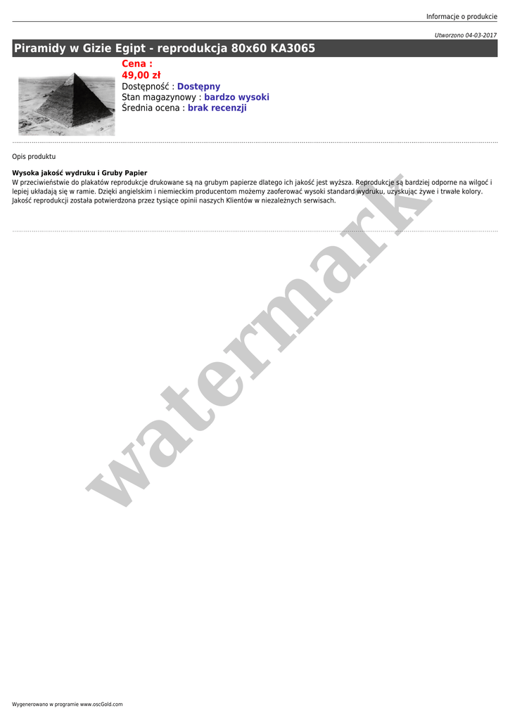 Informacje o produkcie Utworzono 04-03-2017 Piramidy w Gizie Egipt - reprodukcja 80x60 KA3065 Cena : 49,00 zł Dostępność : Dostępny Stan magazynowy : bardzo wysoki Średnia ocena : brak recenzji Opis produktu w at er m ar k Wysoka jakość wydruku i Gruby Papier W przeciwieństwie do plakatów reprodukcje drukowane są na grubym papierze dlatego ich jakość jest wyższa. Reprodukcje są bardziej odporne na wilgoć i lepiej układają się w ramie. Dzięki angielskim i niemieckim producentom możemy zaoferować wysoki standard wydruku, uzyskując żywe i trwałe kolory. Jakość reprodukcji została potwierdzona przez tysiące opinii naszych Klientów w niezależnych serwisach. Wygenerowano w programie www.oscGold.com