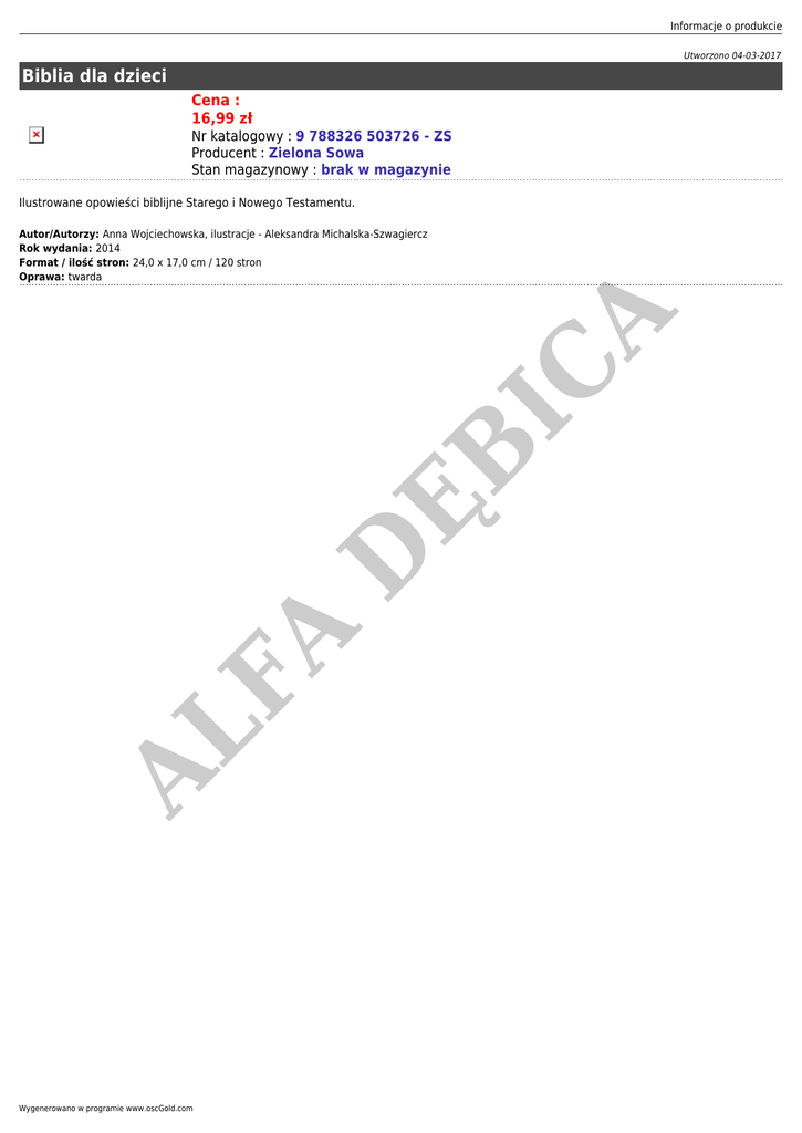 Informacje o produkcie Utworzono 04-03-2017 Biblia dla dzieci Cena : 16,99 zł Nr katalogowy : 9 788326 503726 - ZS Producent : Zielona Sowa Stan magazynowy : brak w magazynie Ilustrowane opowieści biblijne Starego i Nowego Testamentu. AL FA D ĘB IC A Autor/Autorzy: Anna Wojciechowska, ilustracje - Aleksandra Michalska-Szwagiercz Rok wydania: 2014 Format / ilość stron: 24,0 x 17,0 cm / 120 stron Oprawa: twarda Wygenerowano w programie www.oscGold.com