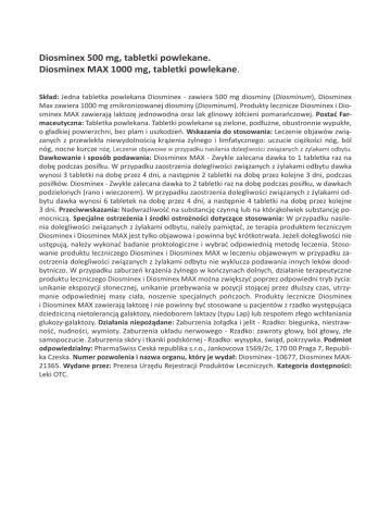 Diosminex 500 mg, tabletki powlekane. Diosminex MAX 1000 mg, tabletki powlekane. Skład: Jedna tabletka powlekana Diosminex - zawiera 500 mg diosminy (Diosminum), Diosminex Max zawiera 1000 mg zmikronizowanej diosminy (Diosminum). Produkty lecznicze Diosminex i Diosminex MAX zawierają laktozę jednowodna oraz lak glinowy żółcieni pomarańczowej. Postać Farmaceutyczna: Tabletka powlekana. Tabletki powlekane są zielone, podłużne, obustronnie wypukłe, o gładkiej powierzchni, bez plam i uszkodzeń. Wskazania do stosowania: Leczenie objawów związanych z przewlekła niewydolnością krążenia żylnego i limfatycznego: uczucie ciężkości nóg, ból nóg, nocne kurcze nóg. Leczenie objawowe w przypadku nasilenia dolegliwości związanych z żylakami odbytu. Dawkowanie i sposób podawania: Diosminex MAX - Zwykle zalecana dawka to 1 tabletka raz na dobę podczas posiłku. W przypadku zaostrzenia dolegliwości związanych z żylakami odbytu dawka wynosi 3 tabletki na dobę przez 4 dni, a następnie 2 tabletki na dobę przez kolejne 3 dni, podczas posiłków. Diosminex - Zwykle zalecana dawka to 2 tabletki raz na dobę podczas posiłku, w dawkach podzielonych (rano i wieczorem). W przypadku zaostrzenia dolegliwości związanych z żylakami odbytu dawka wynosi 6 tabletek na dobę przez 4 dni, a następnie 4 tabletki na dobę przez kolejne 3 dni. Przeciwwskazania: Nadwrażliwość na substancję czynną lub na którąkolwiek substancję pomocniczą. Specjalne ostrzeżenia i środki ostrożności dotyczące stosowania: W przypadku nasilenia dolegliwości związanych z żylakami odbytu, należy pamiętać, ze terapia produktem leczniczym Diosminex i Diosminex MAX jest tylko objawowa i powinna być krótkotrwała. Jeżeli dolegliwości nie ustępują, należy wykonać badanie proktologiczne i wybrać odpowiednią metodę leczenia. Stosowanie produktu leczniczego Diosminex i Diosminex MAX w leczeniu objawowym w przypadku zaostrzenia dolegliwości związanych z żylakami odbytu nie wyklucza podawania innych leków doodbytniczo. W przypadku zaburzeń krążenia żylnego w kończynach dolnych, działanie terapeutyczne produktu leczniczego Diosminex i Diosminex MAX można zwiększyć poprzez odpowiedni tryb życia: unikanie ekspozycji słonecznej, unikanie przebywania w pozycji stojącej przez dłuższy czas, utrzymanie odpowiedniej masy ciała, noszenie specjalnych pończoch. Produkty lecznicze Diosminex i Diosminex MAX zawierają laktozę i nie powinny być stosowane u pacjentów z rzadko występująca dziedziczną nietolerancją galaktozy, niedoborem laktazy (typu Lap) lub zespołem złego wchłaniania glukozy-galaktozy. Działania niepożądane: Zaburzenia żołądka i jelit - Rzadko: biegunka, niestrawność, nudności, wymioty. Zaburzenia układu nerwowego - Rzadko: zawroty głowy, ból głowy, złe samopoczucie. Zaburzenia skóry i tkanki podskórnej - Rzadko: wysypka, świąd, pokrzywka. Podmiot odpowiedzialny: PharmaSwiss Ceská republika s.r.o., Jankovcova 1569/2c, 170 00 Praga 7, Republika Czeska. Numer pozwolenia i nazwa organu, który je wydał: Diosminex -10677, Diosminex MAX21365. Wydane przez: Prezesa Urzędu Rejestracji Produktów Leczniczych. Kategoria dostępności: Leki OTC.