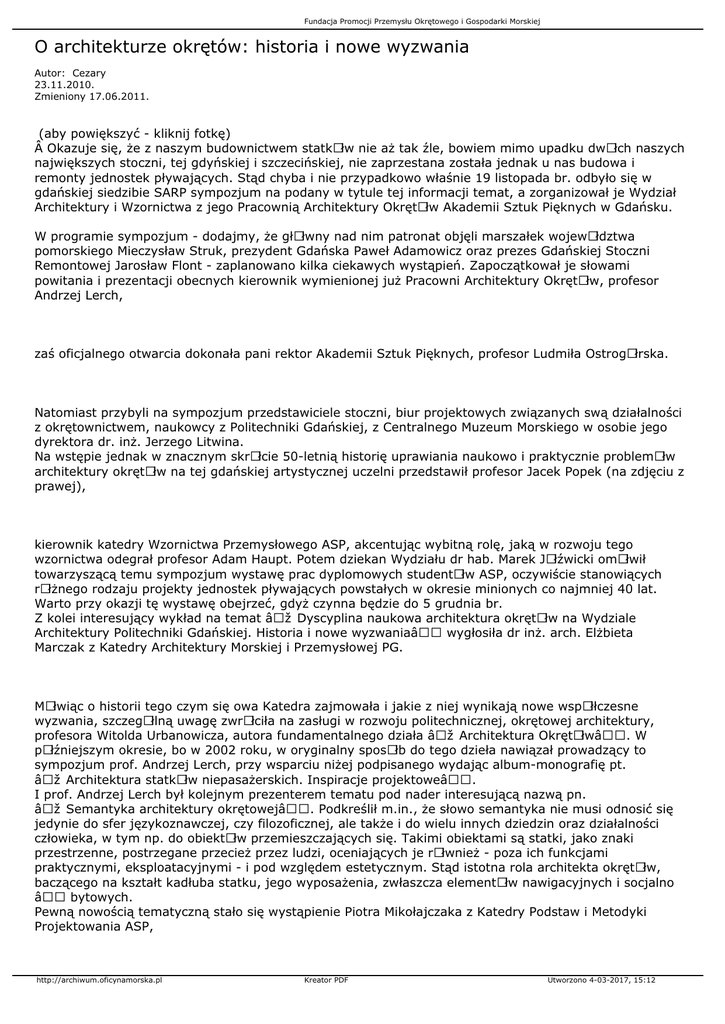 Fundacja Promocji Przemysłu Okrętowego i Gospodarki Morskiej O architekturze okrętów: historia i nowe wyzwania Autor: Cezary 23.11.2010. Zmieniony 17.06.2011. (aby powiększyć - kliknij fotkę)  Okazuje się, że z naszym budownictwem statkÃłw nie aż tak źle, bowiem mimo upadku dwÃłch naszych największych stoczni, tej gdyńskiej i szczecińskiej, nie zaprzestana została jednak u nas budowa i remonty jednostek pływających. Stąd chyba i nie przypadkowo właśnie 19 listopada br. odbyło się w gdańskiej siedzibie SARP sympozjum na podany w tytule tej informacji temat, a zorganizował je Wydział Architektury i Wzornictwa z jego Pracownią Architektury OkrętÃłw Akademii Sztuk Pięknych w Gdańsku. W programie sympozjum - dodajmy, że głÃłwny nad nim patronat objęli marszałek wojewÃłdztwa pomorskiego Mieczysław Struk, prezydent Gdańska Paweł Adamowicz oraz prezes Gdańskiej Stoczni Remontowej Jarosław Flont - zaplanowano kilka ciekawych wystąpień. Zapoczątkował je słowami powitania i prezentacji obecnych kierownik wymienionej już Pracowni Architektury OkrętÃłw, profesor Andrzej Lerch, zaś oficjalnego otwarcia dokonała pani rektor Akademii Sztuk Pięknych, profesor Ludmiła OstrogÃłrska. Natomiast przybyli na sympozjum przedstawiciele stoczni, biur projektowych związanych swą działalności z okrętownictwem, naukowcy z Politechniki Gdańskiej, z Centralnego Muzeum Morskiego w osobie jego dyrektora dr. inż. Jerzego Litwina. Na wstępie jednak w znacznym skrÃłcie 50-letnią historię uprawiania naukowo i praktycznie problemÃłw architektury okrętÃłw na tej gdańskiej artystycznej uczelni przedstawił profesor Jacek Popek (na zdjęciu z prawej), kierownik katedry Wzornictwa Przemysłowego ASP, akcentując wybitną rolę, jaką w rozwoju tego wzornictwa odegrał profesor Adam Haupt. Potem dziekan Wydziału dr hab. Marek JÃłźwicki omÃłwił towarzyszącą temu sympozjum wystawę prac dyplomowych studentÃłw ASP, oczywiście stanowiących rÃłżnego rodzaju projekty jednostek pływających powstałych w okresie minionych co najmniej 40 lat. Warto przy okazji tę wystawę obejrzeć, gdyż czynna będzie do 5 grudnia br. Z kolei interesujący wykład na temat „Dyscyplina naukowa architektura okrętÃłw na Wydziale Architektury Politechniki Gdańskiej. Historia i nowe wyzwania― wygłosiła dr inż. arch. Elżbieta Marczak z Katedry Architektury Morskiej i Przemysłowej PG. MÃłwiąc o historii tego czym się owa Katedra zajmowała i jakie z niej wynikają nowe wspÃłłczesne wyzwania, szczegÃłlną uwagę zwrÃłciła na zasługi w rozwoju politechnicznej, okrętowej architektury, profesora Witolda Urbanowicza, autora fundamentalnego działa „Architektura OkrętÃłw―. W pÃłźniejszym okresie, bo w 2002 roku, w oryginalny sposÃłb do tego dzieła nawiązał prowadzący to sympozjum prof. Andrzej Lerch, przy wsparciu niżej podpisanego wydając album-monografię pt. „Architektura statkÃłw niepasażerskich. Inspiracje projektowe―. I prof. Andrzej Lerch był kolejnym prezenterem tematu pod nader interesującą nazwą pn. „Semantyka architektury okrętowej―. Podkreślił m.in., że słowo semantyka nie musi odnosić się jedynie do sfer językoznawczej, czy filozoficznej, ale także i do wielu innych dziedzin oraz działalności człowieka, w tym np. do obiektÃłw przemieszczających się. Takimi obiektami są statki, jako znaki przestrzenne, postrzegane przecież przez ludzi, oceniających je rÃłwnież - poza ich funkcjami praktycznymi, eksploatacyjnymi - i pod względem estetycznym. Stąd istotna rola architekta okrętÃłw, baczącego na kształt kadłuba statku, jego wyposażenia, zwłaszcza elementÃłw nawigacyjnych i socjalno – bytowych. Pewną nowością tematyczną stało się wystąpienie Piotra Mikołajczaka z Katedry Podstaw i Metodyki Projektowania ASP, http://archiwum.oficynamorska.pl Kreator PDF Utworzono 4-03-2017, 15:12 Fundacja Promocji Przemysłu Okrętowego i Gospodarki Morskiej ktÃłry uwagę uczestnikÃłw sympozjum zainteresował tematem „Wpływ architektury miasta na architekturę obiektu pływającego―. Czy jest to możliwe? OtÃłż wychodzi na to, że bez wątpienia tak. Tyle, że do obiektÃłw używanych na drogach wodnych danego miasta. W przypadku Gdańska taką drogą wodną jest Motława. Dlatego architekci okrętowi tak projektują owe obiekty pływające, aby swym wyglądem i funkcjonalnością, nie zakłÃłcały rytmiki architektonicznej miasta. Na koniec relacji z sympozjum odnotujmy jeszcze, że wysłuchano nadto wykładu dr. hab. Remigiusza Grochali   z tejże samej Katedry co Piotr Mikołajczak pt. „Jachty - forma czy funkcja―, powtÃłrnego zabrania głosu przez panią Elżbietę Marczak o bezpieczeństwie człowieka na statku w kontekście wspÃłłczesnych zagrożeń na morzu, dr. inż. arch. Jana Netzela - o architekturze mostka nawigacyjnego na statku towarowym oraz mgr inż. Katarzyny Adamowicz z Biura Projektowego KADAM na temat „Drgania strukturalne i hałas powietrzny oraz sposoby ich redukcji w procesie projektowania wnętrz okrętowych―. Chcąc najkrÃłcej skomentować to sympozjum, można powiedzieć, że było potrzebne i udane. Szkoda tylko, że nie skorzystało z niego szersze grono osÃłb, choć nie koniecznie związanych z branżą okrętową. Nieobecni mogliby się dowiedzieć, o wcale niemałej roli architekta okrętowego w procesie projektowania i powstawania w stoczni określonego typu statku.  Henryk Spigarski Zdjęcia: Tadeusz Lademann i Cezary Spigarski (więcej fotek - galeria) http://archiwum.oficynamorska.pl Kreator PDF Utworzono 4-03-2017, 15:12