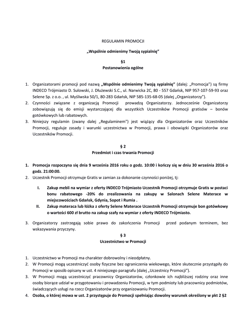 REGULAMIN PROMOCJI „Wspólnie odmienimy Twoją sypialnię” §1 Postanowienia ogólne 1. Organizatorami promocji pod nazwą „Wspólnie odmienimy Twoją sypialnię” (dalej: „Promocja”) są firmy INDECO Trójmiasto D. Sulowski, J. Dłużewski S.C., ul. Narwicka 2C, 80 - 557 Gdańsk, NIP 957-107-59-93 oraz Selene Sp. z o.o. , ul. Myśliwska 50/1, 80-283 Gdańsk, NIP 585-135-68-05 (dalej „Organizatorzy”). 2. Czynności związane z organizacją Promocji prowadzą Organizatorzy. Jednocześnie Organizatorzy zobowiązują się do emisji wystarczającej dla wszystkich Uczestników Promocji gratisów – bonów gotówkowych lub rabatowych. 3. Niniejszy regulamin (zwany dalej „Regulaminem") jest wiążący dla Organizatorów oraz Uczestników Promocji, reguluje zasady i warunki uczestnictwa w Promocji, prawa i obowiązki Organizatorów oraz Uczestników Promocji. §2 Przedmiot i czas trwania Promocji 1. Promocja rozpoczyna się dnia 9 września 2016 roku o godz. 10:00 i kończy się w dniu 30 września 2016 o godz. 21:00:00. 2. Uczestnik Promocji otrzymuje Gratis w zamian za dokonanie czynności poniżej, tj: I. II. Zakup mebli na wymiar z oferty INDECO Trójmiasto Uczestnik Promocji otrzymuje Gratis w postaci bonu rabatowego -20% do zrealizowania na zakupy w Salonach Selene Materace w miejscowościach Gdańsk, Gdynia, Sopot i Rumia . Zakup materaca lub łóżka z oferty Selene Materace Uczestnik Promocji otrzymuje bon gotówkowy o wartości 600 zł brutto na zakup szafy na wymiar z oferty INDECO Trójmiasto. 3. Organizatorzy zastrzegają sobie prawo do zakończenia Promocji wskazywania przyczyny. §3 Uczestnictwo w Promocji przed podanym terminem, bez 1. Uczestnictwo w Promocji ma charakter dobrowolny i nieodpłatny. 2. W Promocji mogą uczestniczyć osoby fizyczne bez ograniczenia wiekowego, które skutecznie przystąpiły do Promocji w sposób opisany w ust. 4 niniejszego paragrafu (dalej „Uczestnicy Promocji”). 3. W Promocji mogą uczestniczyć pracownicy Organizatorów, członkowie ich najbliższej rodziny oraz inne osoby biorące udział w przygotowaniu i prowadzeniu Promocji, w tym podmioty lub pracownicy podmiotów, świadczących usługi na rzecz Organizatorów przy organizowaniu Promocji. 4. Osoba, o której mowa w ust. 2 przystępuje do Promocji spełniając dowolny warunek określony w pkt 2 §2 5. Każdy Uczestnik Promocji może wziąć udział w Promocji wielokrotnie w czasie jej trwania, za każdym razem spełniając czynności opisane w pkt 4. 6. Wzięcie udziału w Promocji oznacza zgodę na zastosowanie się do wszystkich postanowień niniejszego regulaminu. §4 Gratisy 1. Fundatorem Gratisów w Promocji są Organizatorzy. 2. Gratisami w Promocji są: I. II. Bon rabatowy – 20% na zakup w salonach Selene Materace zlokalizowanych w miejscowościach Gdańsk, Sopot, Gdynia i Rumia . Do wykorzystania w terminie do 31.10.2016 r. Bon gotówkowy o wartości 600 zł brutto na zakup szafy na wymiar z oferty INDECO Trójmiasto. Bezterminowy. 3. Uczestnikom aktywnie przystępującym do udziału w Promocji nie przysługuje prawo zamiany nagrody, w tym jej wymiany na ekwiwalent pieniężny. 4. Liczba Gratisów przeznaczonych do przeprowadzenia Promocji przez Organizatorów jest ograniczona. §5 Reklamacje 1. Wszelkie reklamacje dotyczące sposobu przeprowadzania Promocji, w szczególności sposobu przyznawania Gratisów Uczestnicy Promocji winni zgłaszać na piśmie w terminie nie późniejszym niż 7 dni od zakończenia Promocji. 2. Reklamacja zgłoszona po wyznaczonym terminie nie wywołuje skutków prawnych. 3. Dla oceny zachowania terminu złożenia reklamacji miarodajna jest data nadania przesyłki zawierającą reklamacje listem poleconym w placówce Poczty Polskiej. 4. Pisemna reklamacja powinna zawierać imię, nazwisko, dokładny adres Uczestnika Promocji oraz dokładny opis i uzasadnienie reklamacji. Reklamacja powinna być przesłana listem poleconym na adres jednego z Organizatorów: INDECO Trójmiasto D. Sulowski, J. Dłużewski S.C., ul. Narwicka 2C, 80 - 557 Gdańsk lub Selene Sp. z o.o. , ul. Myśliwska 50/1, 80-283 Gdańsk. 5. Reklamacje rozpatrywane będą przez Organizatorów, w terminie 7 dni roboczych od daty ich otrzymania. §6 Postanowienia końcowe 1. Niniejszy Regulamin jest dostępny do wglądu w siedzibie Organizatorów oraz w ich salonach sprzedaży na terenie województwa pomorskiego.