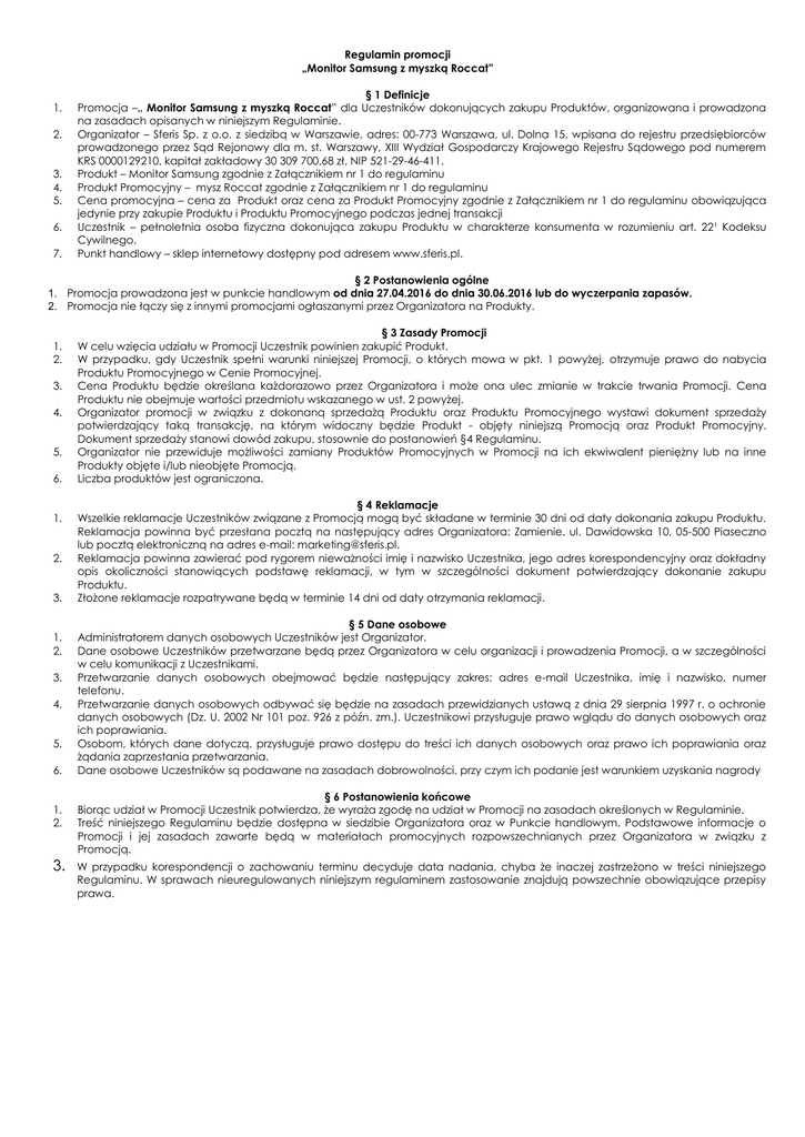 Regulamin promocji „Monitor Samsung z myszką Roccat” 1. 2. 3. 4. 5. 6. 7. § 1 Definicje Promocja –„ Monitor Samsung z myszką Roccat” dla Uczestników dokonujących zakupu Produktów, organizowana i prowadzona na zasadach opisanych w niniejszym Regulaminie. Organizator – Sferis Sp. z o.o. z siedzibą w Warszawie, adres: 00-773 Warszawa, ul. Dolna 15, wpisana do rejestru przedsiębiorców prowadzonego przez Sąd Rejonowy dla m. st. Warszawy, XIII Wydział Gospodarczy Krajowego Rejestru Sądowego pod numerem KRS 0000129210, kapitał zakładowy 30 309 700,68 zł, NIP 521-29-46-411. Produkt – Monitor Samsung zgodnie z Załącznikiem nr 1 do regulaminu Produkt Promocyjny – mysz Roccat zgodnie z Załącznikiem nr 1 do regulaminu Cena promocyjna – cena za Produkt oraz cena za Produkt Promocyjny zgodnie z Załącznikiem nr 1 do regulaminu obowiązująca jedynie przy zakupie Produktu i Produktu Promocyjnego podczas jednej transakcji Uczestnik – pełnoletnia osoba fizyczna dokonująca zakupu Produktu w charakterze konsumenta w rozumieniu art. 22¹ Kodeksu Cywilnego. Punkt handlowy – sklep internetowy dostępny pod adresem www.sferis.pl. § 2 Postanowienia ogólne 1. Promocja prowadzona jest w punkcie handlowym od dnia 27.04.2016 do dnia 30.06.2016 lub do wyczerpania zapasów. 2. Promocja nie łączy się z innymi promocjami ogłaszanymi przez Organizatora na Produkty. 1. 2. 3. 4. 5. 6. 1. 2. 3. 1. 2. 3. 4. 5. 6. 1. 2. 3. § 3 Zasady Promocji W celu wzięcia udziału w Promocji Uczestnik powinien zakupić Produkt. W przypadku, gdy Uczestnik spełni warunki niniejszej Promocji, o których mowa w pkt. 1 powyżej, otrzymuje prawo do nabycia Produktu Promocyjnego w Cenie Promocyjnej. Cena Produktu będzie określana każdorazowo przez Organizatora i może ona ulec zmianie w trakcie trwania Promocji. Cena Produktu nie obejmuje wartości przedmiotu wskazanego w ust. 2 powyżej. Organizator promocji w związku z dokonaną sprzedażą Produktu oraz Produktu Promocyjnego wystawi dokument sprzedaży potwierdzający taką transakcję, na którym widoczny będzie Produkt - objęty niniejszą Promocją oraz Produkt Promocyjny. Dokument sprzedaży stanowi dowód zakupu, stosownie do postanowień §4 Regulaminu. Organizator nie przewiduje możliwości zamiany Produktów Promocyjnych w Promocji na ich ekwiwalent pieniężny lub na inne Produkty objęte i/lub nieobjęte Promocją. Liczba produktów jest ograniczona. § 4 Reklamacje Wszelkie reklamacje Uczestników związane z Promocją mogą być składane w terminie 30 dni od daty dokonania zakupu Produktu. Reklamacja powinna być przesłana pocztą na następujący adres Organizatora: Zamienie, ul. Dawidowska 10, 05-500 Piaseczno lub pocztą elektroniczną na adres e-mail: [email protected]. Reklamacja powinna zawierać pod rygorem nieważności imię i nazwisko Uczestnika, jego adres korespondencyjny oraz dokładny opis okoliczności stanowiących podstawę reklamacji, w tym w szczególności dokument potwierdzający dokonanie zakupu Produktu. Złożone reklamacje rozpatrywane będą w terminie 14 dni od daty otrzymania reklamacji. § 5 Dane osobowe Administratorem danych osobowych Uczestników jest Organizator. Dane osobowe Uczestników przetwarzane będą przez Organizatora w celu organizacji i prowadzenia Promocji, a w szczególności w celu komunikacji z Uczestnikami. Przetwarzanie danych osobowych obejmować będzie następujący zakres: adres e-mail Uczestnika, imię i nazwisko, numer telefonu. Przetwarzanie danych osobowych odbywać się będzie na zasadach przewidzianych ustawą z dnia 29 sierpnia 1997 r. o ochronie danych osobowych (Dz. U. 2002 Nr 101 poz. 926 z późn. zm.). Uczestnikowi przysługuje prawo wglądu do danych osobowych oraz ich poprawiania. Osobom, których dane dotyczą, przysługuje prawo dostępu do treści ich danych osobowych oraz prawo ich poprawiania oraz żądania zaprzestania przetwarzania. Dane osobowe Uczestników są podawane na zasadach dobrowolności, przy czym ich podanie jest warunkiem uzyskania nagrody § 6 Postanowienia końcowe Biorąc udział w Promocji Uczestnik potwierdza, że wyraża zgodę na udział w Promocji na zasadach określonych w Regulaminie. Treść niniejszego Regulaminu będzie dostępna w siedzibie Organizatora oraz w Punkcie handlowym. Podstawowe informacje o Promocji i jej zasadach zawarte będą w materiałach promocyjnych rozpowszechnianych przez Organizatora w związku z Promocją. W przypadku korespondencji o zachowaniu terminu decyduje data nadania, chyba że inaczej zastrzeżono w treści niniejszego Regulaminu. W sprawach nieuregulowanych niniejszym regulaminem zastosowanie znajdują powszechnie obowiązujące przepisy prawa. Załącznik nr 1 – Lista Produktów oraz Produktów Promocyjnych Nazwa produktu LS22E391HS/EN Cena Promocyjna brutto 420,00 zł MCID 400891 LS27E370DS/EN 960,00 zł 378419 LS24E370DL/EN 660,00 zł 378418 LT27D590CW/EN 1 260,00 zł 376997 LT24E390EW/EN 660,00 zł 374324 LS27E591CS/EN 1 160,00 zł 369038 LS27E510CS/EN 860,00 zł 357180 LS27D590CS/EN 1 160,00 zł 347091 LS24D590PLX/EN Nazwa Produktu Promocyjnego Mysz gamingowa ROCCAT KOVA[+] OPTYCZNA 3200DPI 600,00 zł Cena Promocyjna brutto 1,00 zł 339356 MCID 269983