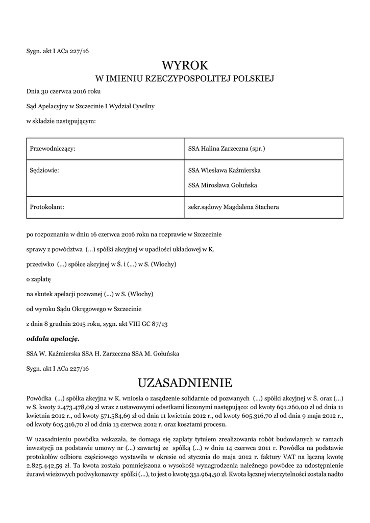 Wyrokiem z 8 grudnia 2015 r. Sąd Okręgowy w Szczecinie zasądził od pozwanych (...) Spółki Akcyjnej z siedzibą w Ś.