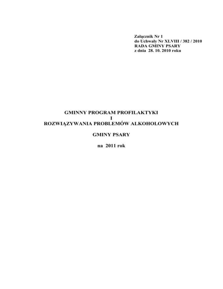 Załącznik Nr 1 do Uchwały Nr XLVIII / 382 / 2010 RADA GMINY PSARY z dnia 28. 10. 2010 roku GMINNY PROGRAM PROFILAKTYKI I ROZWIĄZYWANIA PROBLEMÓW ALKOHOLOWYCH GMINY PSARY na 2011 rok SPIS TREŚCI GMINNY PROGRAM PROFILAKTYKI I ROZWIĄZYWANIA PROBLEMÓW ALKOHOLOWYCH Strony Wstęp................................................................................................................................... 4 Rozdział I 1.1. Diagnoza........................................................................................................... 6 1.2. Zasoby gminy................................................................................................... 8 1.3. Zadania gminnego programu profilaktyki i rozwiązywania problemów alkoholowych................................................................................................... 9 Rozdział II Cele, zadania, realizatorzy programu. 2.1. Cele programu...................................................................................................12 2.2. Zadania programu............................................................................................. 12 2.3. Realizatorzy programu......................................................................................18 Rozdział III 3.1. Zasady wynagradzania członków G.K.R.P.Al……........................................ 22 Rozdział IV 4.1. Źródła finansowania ……………………………………………………….... 23 4.2. Zakończenie …………………………………...………………………..…… 23 WSTĘP Profilaktyka jest to szereg działań mających na celu zapobieganie chorobie bądź innemu niekorzystnemu zjawisku zdrowotnemu przed jej rozwinięciem się, poprzez kontrolowanie przyczyn i czynników ryzyka. Polega ona na zapobieganiu poważniejszym konsekwencjom choroby poprzez jej wczesne wykrycie i leczenie. Celem profilaktyki jest podjęcie szybkich i skutecznych działań przywracających zdrowie, ma ona również na celu zahamowanie postępu lub powikłań już istniejącej choroby. Dzięki temu prowadzi do ograniczenia nieprawidłowości i inwalidztwa. Istotnym elementem profilaktyki jest także zapobieganie powstawaniu niekorzystnych wzorów zachowań społecznych, które przyczynia się do podwyższenia ryzyka choroby. Wyróżniamy trzy fazy profilaktyki : . Profilaktyka wczesna – mająca na celu utrwalenie prawidłowych wzorców zdrowego stylu życia i zapobieganie szerzeniu się niekorzystnych wzorców zachowań w odniesieniu do osób zdrowych. . Profilaktyka pierwotna (I fazy) – mająca na celu zapobieganie chorobie poprzez kontrolowanie czynników ryzyka, w odniesieniu do osób narażonych na czynniki ryzyka. . Profilaktyka wtórna (II fazy) – zapobieganie konsekwencjom choroby poprzez jej wczesne wykrycie i leczenie. . Profilaktyka III fazy, której działania zmierzają w kierunku zahamowania postępu choroby oraz ograniczeniu powikłań. W zakresie profilaktyki wtórnej rolę odgrywają przesiewowe badania skriningowe. Są to zorganizowane działania polegające na wczesnym wykryciu w populacji chorób lub stanów patologicznych za pomocą stosownych badań i wiarygodnych testów diagnostycznych. Prowadzone szeroko zakrojonych działań profilaktycznych przynosi w krótszej lub dłuższej perspektywie czasowej wymierne korzyści dla społeczeństwa w postaci : - poprawy świadomości zdrowotnej populacji; - poprawy stanu zdrowia ludności; - zmniejszenia ilości osób z powikłaniami chorób i trwałym inwalidztwem; - zmniejszenia liczby zachorowań i zgonów; - zwiększenia wykrywalności chorób we wczesnym stadium rozwoju; - zwiększenia odsetka wyleczeń; - zmniejszenia abstynencji chorobowej; - obniżenia kosztów leczenia; - mniejszych strat finansowych( zasiłki chorobowe, straty produkcyjne). Na każdym etapie działań profilaktycznych znaczącą rolę odgrywa EDUKACJA ZDROWOTNA proces w trakcie którego ludzie uczą się dbać o zdrowie własne i innych osób. Koncentruje się ona na uświadomieniu związków między zdrowiem człowieka a jego stylem życia oraz środowiskiem fizycznym i społecznym. Edukacja zdrowotna obejmuje główne działania informacyjne, których bezpośrednim celem jest ukształtowanie sprzyjających zdrowiu przekonań motywacji i umiejętności, a co za tym idzie postaw zdrowotnych jednostki, które powinny prowadzić do realizacji zachowań służących zdrowiu. Polskie prawodawstwo zobowiązuje określone przedmioty do realizacji zadań profilaktycznych. Tymi podmiotami przede wszystkim są organy administracji publicznej, tak rządowej, jak i samorządu terytorialnego. Program przedstawia zadania własne gminy wynikające z art. 4ˡ ustawy o wychowaniu w trzeźwości i przeciwdziałaniu alkoholizmowi z dnia 26 października 1982 roku z późniejszymi zmianami, tekst jednolity Dz. U. z 2007 roku Nr 70 poz.473 a poszerzone są Europejskim Planem Działań Wobec Alkoholu, Wojewódzką Strategią Polityki Społecznej na lata 2006 – 2020 ( dział 6.3), w oparciu o Gminną Strategię Polityki Społecznej na lata 2006 – 2013 w Psarach ( rozdział 2.3.4). Zgodnie z treścią ustawy o wychowaniu w trzeźwości zadania w zakresie przeciwdziałania alkoholizmowi, wykonuje się poprzez odpowiednie kształtowanie polityki społecznej w szczególności tworzenie warunków sprzyjających realizacji potrzeb, których zaspokajanie motywuje powstrzymywanie się od alkoholu: działalność wychowawczą i informacyjną; ograniczenie dostępności alkoholu: leczenie, rehabilitacja i reintegrację osób uzależnionych od alkoholu, zapobieganie negatywnych następstw nadużywania alkoholu i ich usuwanie oraz przeciwdziałanie przemocy. Zgodnie z zapisem w art. 11ˡ ustawy na wydatki związane z realizacją gminnych programów profilaktycznych gminy pozyskują dodatkowe środki z opłat za korzystanie z zezwoleń na sprzedaż napojów alkoholowych i zobowiązane są do wykorzystania ich 