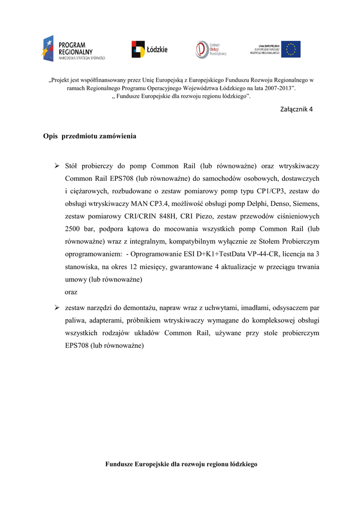 „Projekt jest współfinansowany przez Unię Europejską z Europejskiego Funduszu Rozwoju Regionalnego w ramach Regionalnego Programu Operacyjnego Województwa Łódzkiego na lata 2007-2013”. ,, Fundusze Europejskie dla rozwoju regionu łódzkiego”. Załącznik 4 Opis przedmiotu zamówienia Stół probierczy do pomp Common Rail (lub równoważne) oraz wtryskiwaczy Common Rail EPS708 (lub równoważne) do samochodów osobowych, dostawczych i ciężarowych, rozbudowane o zestaw pomiarowy pomp typu CP1/CP3, zestaw do obsługi wtryskiwaczy MAN CP3.4, możliwość obsługi pomp Delphi, Denso, Siemens, zestaw pomiarowy CRI/CRIN 848H, CRI Piezo, zestaw przewodów ciśnieniowych 2500 bar, podpora kątowa do mocowania wszystkich pomp Common Rail (lub równoważne) wraz z integralnym, kompatybilnym wyłącznie ze Stołem Probierczym oprogramowaniem: - Oprogramowanie ESI D+K1+TestData VP-44-CR, licencja na 3 stanowiska, na okres 12 miesięcy, gwarantowane 4 aktualizacje w przeciągu trwania umowy (lub równoważne) oraz zestaw narzędzi do demontażu, napraw wraz z uchwytami, imadłami, odsysaczem par paliwa, adapterami, próbnikiem wtryskiwaczy wymagane do kompleksowej obsługi wszystkich rodzajów układów Common Rail, używane przy stole probierczym EPS708 (lub równoważne) Fundusze Europejskie dla rozwoju regionu łódzkiego
