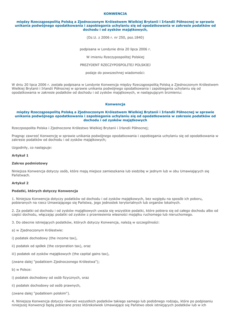 KONWENCJA między Rzecząpospolitą Polską a Zjednoczonym Królestwem Wielkiej Brytanii i Irlandii Północnej w sprawie unikania podwójnego opodatkowania i zapobiegania uchylaniu się od opodatkowania w zakresie podatków od dochodu i od zysków majątkowych, (Dz.U. z 2006 r. nr 250, poz.1840) podpisana w Londynie dnia 20 lipca 2006 r. W imieniu Rzeczypospolitej Polskiej PREZYDENT RZECZYPOSPOLITEJ POLSKIEJ podaje do powszechnej wiadomości: W dniu 20 lipca 2006 r. została podpisana w Londynie Konwencja między Rzecząpospolitą Polską a Zjednoczonym Królestwem Wielkiej Brytanii i Irlandii Północnej w sprawie unikania podwójnego opodatkowania i zapobiegania uchylaniu się od opodatkowania w zakresie podatków od dochodu i od zysków majątkowych, w następującym brzmieniu: Konwencja między Rzecząpospolitą Polską a Zjednoczonym Królestwem Wielkiej Brytanii i Irlandii Północnej w sprawie unikania podwójnego opodatkowania i zapobiegania uchylaniu się od opodatkowania w zakresie podatków od dochodu i od zysków majątkowych Rzeczpospolita Polska i Zjednoczone Królestwo Wielkiej Brytanii i Irlandii Północnej; Pragnąc zawrzeć Konwencję w sprawie unikania podwójnego opodatkowania i zapobiegania uchylaniu się od opodatkowania w zakresie podatków od dochodu i od zysków majątkowych; Uzgodniły, co następuje: Artykuł 1 Zakres podmiotowy Niniejsza Konwencja dotyczy osób, które mają miejsce zamieszkania lub siedzibę w jednym lub w obu Umawiających się Państwach. Artykuł 2 Podatki, których dotyczy Konwencja 1. Niniejsza Konwencja dotyczy podatków od dochodu i od zysków majątkowych, bez względu na sposób ich poboru, pobieranych na rzecz Umawiającego się Państwa, jego jednostek terytorialnych lub organów lokalnych. 2. Za podatki od dochodu i od zysków majątkowych uważa się wszystkie podatki, które pobiera się od całego dochodu albo od części dochodu, włączając podatki od zysków z przeniesienia własności majątku ruchomego lub nieruchomego. 3. Do obecnie istniejących podatków, których dotyczy Konwencja, należą w szczególności: a) w Zjednoczonym Królestwie: i) podatek dochodowy (the income tax), ii) podatek od spółek (the corporation tax), oraz iii) podatek od zysków majątkowych (the capital gains tax), (zwane dalej "podatkiem Zjednoczonego Królestwa"); b) w Polsce: i) podatek dochodowy od osób fizycznych, oraz ii) podatek dochodowy od osób prawnych, (zwane dalej "podatkiem polskim"). 4. Niniejsza Konwencja dotyczy również wszystkich podatków takiego samego lub podobnego rodzaju, które po podpisaniu niniejszej Konwencji będą pobierane przez którekolwiek Umawiające się Państwo obok istniejących podatków lub w ich miejsce. Właściwe organy Umawiających się Państw poinformują się wzajemnie o zasadniczych zmianach, jakie zaszły w ich ustawodawstwach podatkowych. Artykuł 3 Ogólne definicje 1. W rozumieniu niniejszej Konwencji, jeżeli z kontekstu nie wynika inaczej: a) określenie "Zjednoczone Królestwo" oznacza Wielką Brytanię i Irlandię Północną, włącznie z jakimkolwiek obszarem poza wodami terytorialnymi Zjednoczonego Królestwa, na których na mocy jego prawa dotyczącego Szelfu Kontynentalnego i zgodnie z prawem międzynarodowym, Zjednoczone Królestwo może sprawować suwerenne prawa w odniesieniu do dna morskiego i podglebia oraz ich zasobów naturalnych; b) określenie "Polska" oznacza Rzeczpospolitą Polską, włącznie z jakimkolwiek obszarem poza jej wodami terytorialnymi, na których na mocy jej prawa i zgodnie z prawem międzynarodowym, Polska może sprawować suwerenne prawa w odniesieniu do dna morskiego i podglebia oraz ich zasobów naturalnych; c) określenia "Umawiające się Państwo" i "drugie Umawiające się Państwo" oznaczają w zależności od kontekstu odpowiednio Polskę lub Zjednoczone Królestwo; d) określenie "osoba" obejmuje osobę fizyczną, spółkę oraz każde inne zrzeszenie osób i nie obejmuje spółek osobowych; e) określenie "spółka" oznacza jakąkolwiek osobę prawną lub jakikolwiek podmiot, który traktowany jest jako osoba prawna dla celów podatkowych; f) określenie "przedsiębiorstwo" ma zastosowanie do prowadzenia jakiejkolwiek działalności gospodarczej; g) określenia "przedsiębiorstwo Umawiającego się Państwa" i "przedsiębiorstwo drugiego Umawiającego się Państwa" oznaczają odpowiednio przedsiębiorstwo prowadzone przez osobę mającą miejsce zamieszkania lub siedzibę w jednym Umawiającym się Państwie i przedsiębiorstwo prowadzone przez osobę mającą miejsce zamieszkania lub siedzibę w drugim Umawiającym się Państwie; h) określenie "transport międzynarodowy" oznacza wszelki transport statkiem morskim lub statkiem powietrznym, eksploatowanym przez przedsiębiorstwo Umawiającego się Państwa, z wyjątkiem przypadku, kiedy statek morski lub statek powietrzny eksploatowany jest wyłącznie między miejscami położonymi w drugim Umawiającym się Państwie; i) określenie "właściwy organ" oznacza: i) w przypadku Zjednoczonego Królestwa, Komisarzy Przychodów i Cel Jej Wysokości lub ich upoważnionego przedstawiciela; ii) w przypadku Polski, Ministra Finansów lub jego upoważnionego przedstawiciela; j) określenie "obywatel" oznacza: i) w odniesieniu do Zjednoczonego Królestwa, każdą brytyjską osobę mającą miejsce zamieszkania lub siedzibę lub inny podmiot brytyjski niemający miejsca zamieszkania lub siedziby w jakimkolwiek innym państwie lub terytorium Commonwealth, pod warunkiem, że posiada prawo pobytu w Zjednoczonym Królestwie; oraz każdą osobę prawną, spółkę osobową, stowarzyszenie lub inny podmiot utworzony na podstawie ustawodawstwa obowiązującego w Zjednoczonym Królestwie; ii) w odniesieniu do Polski, każdą osobę fizyczną posiadającą obywatelstwo polskie oraz każdą osobę prawną, spółkę osobową lub stowarzyszenie utworzone na podstawie ustawodawstwa obowiązującego w Polsce; k) 