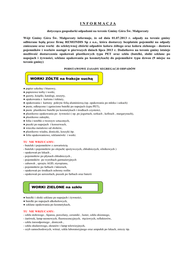 INFORMACJA dotycząca gospodarki odpadami na terenie Gminy Góra Św. Małgorzaty Wójt Gminy Góra Św. Małgorzaty informuje, że od dnia 01.07.2013 r. odpady na terenie gminy odbierane będą przez firmę REMONDIS Sp z o.o., która dostarczy bezpłatnie pojemniki na odpady zmieszane oraz worki do selektywnej zbiórki odpadów koloru żółtego oraz koloru zielonego - dostawa pojemników i worków nastąpi w pierwszych dniach lipca 2013 r. Dodatkowo na terenie gminy istnieje możliwość dostarczenia opakowań plastikowych typu PET oraz szkła (butelki, słoiki szklane po napojach i żywności, szklane opakowania po kosmetykach) do pojemników typu dzwon (9 miejsc na terenie gminy) PODSTAWOWE ZASADY SEGREGACJI ODPADÓW WORKI ZÓŁTE na frakcje suchą ● papier szkolny i biurowy, ● papierowe torby i worki, ● gazety, książki, katalogi, zeszyty, ● opakowania z kartonu i tektury, ● opakowania i kartony pokryte folią aluminiową (np. opakowania po mleku i sokach) ● puste, odkręcone i zgniecione butelki po napojach (typu PET), ● puste plastikowe butelki po kosmetykach i środkach czystości, ● plastikowe opakowania po żywności ( np. po jogurtach, serkach , kefirach , margarynach), ● plastikowe zakrętki, ● folia i torebki z tworzyw sztucznych, ● puszki po napojach i konserwach, ● wieczka metalowe od słoików, ● plastikowe wiadra, doniczki, koszyki itp. ● folie opakowaniowe, reklamówki i worki. TU NIE WRZUCAMY: - butelek i pojemników z zawartością - butelek i pojemników po olejach( spożywczych, chłodniczych, silnikowych ) - opakowań po lekach , - pojemników po płynach chłodniczych , - pojemników po wyrobach garmażeryjnych - zabawek , sprzętu AGD, styropianu, - pojemników po farbach i lakierach, - opakowań po środkach ochrony roślin - opakowań po aerozolach, puszek po farbach oraz baterii WORKI ZIELONE na szkło ● butelki i słoiki szklane po napojach i żywności, ● butelki po napojach alkoholowych, ● szklane opakowania po kosmetykach, TU NIE WRZUCAMY: - szkła stołowego , fajansu, porcelany, ceramiki , luster, szkła okiennego, - żarówek, lamp neonowych, fluorescencyjnych, rtęciowych, reflektorów, - szkła żaroodpornego , doniczek , - szkła okularowego, ekranów i lamp telewizyjnych, - szyb samochodowych, witraż, szkła laboratoryjnego oraz ampułek po lekach, zniczy itp. POJEMNIKI na pozostałe odpady zmieszane ● pozostałe odpady z sortowania ● tłusty i zabrudzony papier (np. opakowania maśle margarynie, serach itp.) ● odpady higieniczne (np. waciki, podpaski, pieluchy) ● butelki i opakowania po olejach spożywczych i samochodowych, ● guma, butelki z jakąkolwiek zawartością, ● puszki po farbach, opakowania po aerozolach, lekach, ● drewno, piasek, ● porcelana, ceramika, fajans, doniczki, ● szkło stołowe ,szkło okularowe, szkło żaroodporne, ● tapety, ● popiół ( zimny) KOMPOSTOWNIK ● łupiny, obierki z owoców i warzyw, ● resztki żywności, ● skorupki od jaj, ● stare pieczywo, ● fusy po kawie i herbacie, ● kwiaty i rośliny doniczkowe, ● odpady z ogródków( trawa, liście, gałęzie itp.) NIGDY NIE WRZUCAMY DO KOSZA !!!! ● zużytych baterii akumulatorów, ● sprzętu elektrycznego i elektronicznego, ● zużytych opon, ● świetlówek, żarówek itp. to oddajemy do Gminnego Punktu Selektywnej Zbiórki ( Góra Św. Małgorzaty 44) ● wielkogabarytowe (lodówki pralki itp.) to oddajemy do mobilnego punkt zbiórki ( dwa razy w roku) ● leki do specjalnego pojemnika usytuowanego na terenie Ośrodka Zdrowia w Górze Św. Małgorzaty