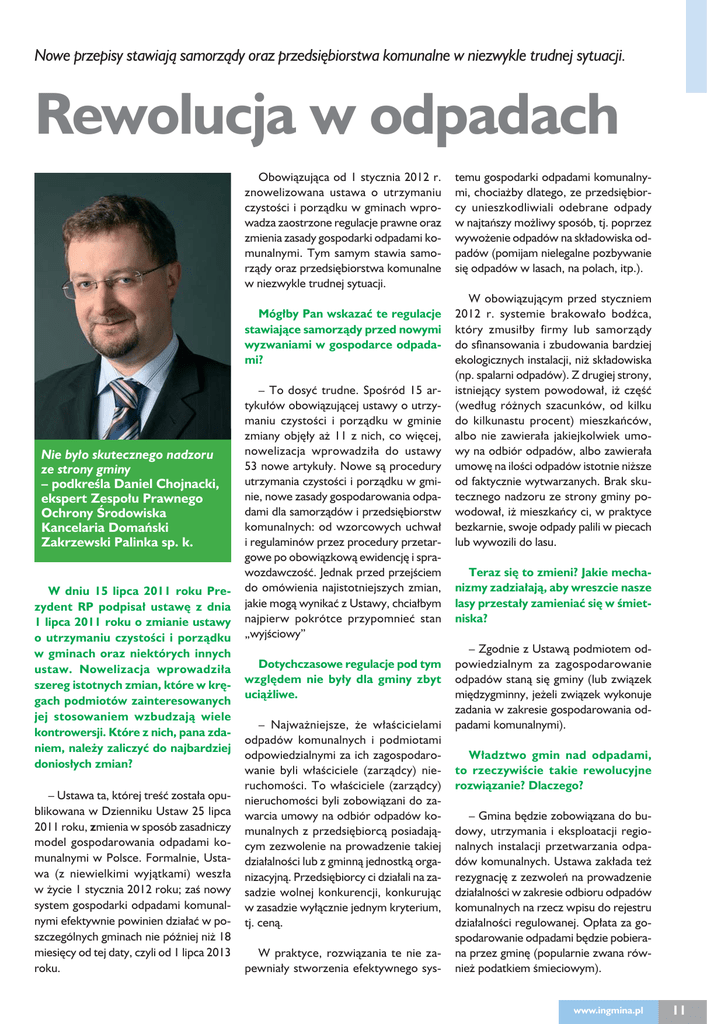Nowe przepisy stawiają samorządy oraz przedsiębiorstwa komunalne w niezwykle trudnej sytuacji. Rewolucja w odpadach Obowiązująca od 1 stycznia 2012 r. znowelizowana ustawa o utrzymaniu czystości i porządku w gminach wprowadza zaostrzone regulacje prawne oraz zmienia zasady gospodarki odpadami komunalnymi. Tym samym stawia samorządy oraz przedsiębiorstwa komunalne w niezwykle trudnej sytuacji. Mógłby Pan wskazać te regulacje stawiające samorządy przed nowymi wyzwaniami w gospodarce odpadami? Nie było skutecznego nadzoru ze strony gminy – podkreśla Daniel Chojnacki, ekspert Zespołu Prawnego Ochrony Środowiska Kancelaria Domański Zakrzewski Palinka sp. k. W dniu 15 lipca 2011 roku Prezydent RP podpisał ustawę z dnia 1 lipca 2011 roku o zmianie ustawy o utrzymaniu czystości i porządku w gminach oraz niektórych innych ustaw. Nowelizacja wprowadziła szereg istotnych zmian, które w kręgach podmiotów zainteresowanych jej stosowaniem wzbudzają wiele kontrowersji. Które z nich, pana zdaniem, należy zaliczyć do najbardziej doniosłych zmian? – Ustawa ta, której treść została opublikowana w Dzienniku Ustaw 25 lipca 2011 roku, zmienia w sposób zasadniczy model gospodarowania odpadami komunalnymi w Polsce. Formalnie, Ustawa (z niewielkimi wyjątkami) weszła w życie 1 stycznia 2012 roku; zaś nowy system gospodarki odpadami komunalnymi efektywnie powinien działać w poszczególnych gminach nie później niż 18 miesięcy od tej daty, czyli od 1 lipca 2013 roku. – To dosyć trudne. Spośród 15 artykułów obowiązującej ustawy o utrzymaniu czystości i porządku w gminie zmiany objęły aż 11 z nich, co więcej, nowelizacja wprowadziła do ustawy 53 nowe artykuły. Nowe są procedury utrzymania czystości i porządku w gminie, nowe zasady gospodarowania odpadami dla samorządów i przedsiębiorstw komunalnych: od wzorcowych uchwał i regulaminów przez procedury przetargowe po obowiązkową ewidencję i sprawozdawczość. Jednak przed przejściem do omówienia najistotniejszych zmian, jakie mogą wynikać z Ustawy, chciałbym najpierw pokrótce przypomnieć stan „wyjściowy” Dotychczasowe regulacje pod tym względem nie były dla gminy zbyt uciążliwe. – Najważniejsze, że właścicielami odpadów komunalnych i podmiotami odpowiedzialnymi za ich zagospodarowanie byli właściciele (zarządcy) nieruchomości. To właściciele (zarządcy) nieruchomości byli zobowiązani do zawarcia umowy na odbiór odpadów komunalnych z przedsiębiorcą posiadającym zezwolenie na prowadzenie takiej działalności lub z gminną jednostką organizacyjną. Przedsiębiorcy ci działali na zasadzie wolnej konkurencji, konkurując w zasadzie wyłącznie jednym kryterium, tj. ceną. W praktyce, rozwiązania te nie zapewniały stworzenia efektywnego sys- temu gospodarki odpadami komunalnymi, chociażby dlatego, ze przedsiębiorcy unieszkodliwiali odebrane odpady w najtańszy możliwy sposób, tj. poprzez wywożenie odpadów na składowiska odpadów (pomijam nielegalne pozbywanie się odpadów w lasach, na polach, itp.). W obowiązującym przed styczniem 2012 r. systemie brakowało bodźca, który zmusiłby firmy lub samorządy do sfinansowania i zbudowania bardziej ekologicznych instalacji, niż składowiska (np. spalarni odpadów). Z drugiej strony, istniejący system powodował, iż część (według różnych szacunków, od kilku do kilkunastu procent) mieszkańców, albo nie zawierała jakiejkolwiek umowy na odbiór odpadów, albo zawierała umowę na ilości odpadów istotnie niższe od faktycznie wytwarzanych. Brak skutecznego nadzoru ze strony gminy powodował, iż mieszkańcy ci, w praktyce bezkarnie, swoje odpady palili w piecach lub wywozili do lasu. Teraz się to zmieni? Jakie mechanizmy zadziałają, aby wreszcie nasze lasy przestały zamieniać się w śmietniska? – Zgodnie z Ustawą podmiotem odpowiedzialnym za zagospodarowanie odpadów staną się gminy (lub związek międzygminny, jeżeli związek wykonuje zadania w zakresie gospodarowania odpadami komunalnymi). Władztwo gmin nad odpadami, to rzeczywiście takie rewolucyjne rozwiązanie? Dlaczego? – Gmina będzie zobowiązana do budowy, utrzymania i eksploatacji regionalnych instalacji przetwarzania odpadów komunalnych. Ustawa zakłada też rezygnację z zezwoleń na prowadzenie działalności w zakresie odbioru odpadów komunalnych na rzecz wpisu do rejestru działalności regulowanej. Opłata za gospodarowanie odpadami będzie pobierana przez gminę (popularnie zwana również podatkiem śmieciowym). www.ingmina.pl 11 Nowy system gospodarki odpadami komunalnymi, z mocy ustawy, obejmie odpady komunalne wytwarzane na nieruchomościach zamieszkałych przez mieszkańców, przy czym rada gminy będzie uprawniona do objęcia systemem odpadów wytwarzanych na nieruchomościach niezamieszkałych przez mieszkańców poprzez przyjęcie stosownej uchwały. Skuteczność takiej uchwały nie będzie uzależniona od przeprowadzenia referendum lokalnego. Inaczej niż przed 2012 r. przedstawiają się obecnie obowiązki mieszkańców dotyczące pozbywania się zebranych na terenie nieruchomości nieczystości ciekłych. Dotychczas właściciel nieruchomości był zobowiązany do posiadania odpowiedniej umowy cywilnoprawnej z podmiotem zajmującym się wywozem nieczystości ciekłych, a wyjątkiem była możliwość przejęcia tego obowiązku przez gminę, do czego jednak wymagana była stosowna uchwała gminy poprzedzona wyrażeniem zgody na jej uchwalenie przez mieszkańców gminy w drodze referendum. Obowiązki związane z zawieraniem wskazanych wyżej umów gmina może obecnie przejąć w drodze zwykłej uchwały stanowiącej akt prawa miejscowego. Tym samym zamiast świadczenia ponoszonego w związku z realizacją umowy cywilnoprawnej, właściciel nieruchomości będzie ponosił na rzecz gminy opłatę, której wysokość określi rada gminy. Wysokość opłaty będzie uzależniona od faktycznych kosztów po