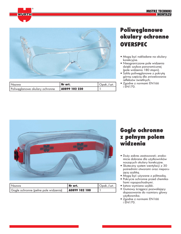 Poliwęglanowe okulary ochronne OVERSPEC Nazwa Nr art. Opak./szt. Poliwęglanowe okulary ochronne A0899 102 230 1 • Mogą być nakładane na okulary korekcyjne. • Nieograniczone pole widzenia dzięki szybce panoramicznej (pole widzenia 180 stopni). • Szkła poliwęglanowe z pokrytą górną częścią dla zniwelowania refleksów świetlnych. • Zgodne z normami EN166 i EN170. Gogle ochronne z pełnym polem widzenia Nazwa Nr art. Opak./szt. Gogle ochronne (pełne pole widzenia) A0899 102 100 1 • Duży zakres zastosowań; znakomicie dobrane dla użytkowników noszących okulary korekcyjne. • Skuteczny system wentylacji z 30 pośrednimi otworami oraz nieparującą szybką. • Mogą być używane z półmaską. • Pokrycie ochronne przed chemikaliami ropopochodnymi. • Łatwa wymiana szybki. • Gumowy ściągacz pozwalający dopasowanie do rozmiaru głowy użytkownika. • Zgodne z normami EN166 i EN170.