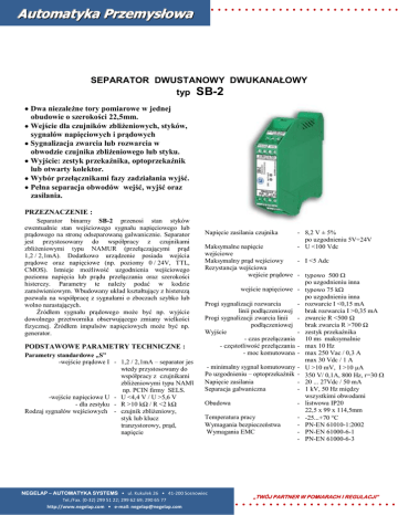 ............................ . Automatyka Przemysłowa SEPARATOR DWUSTANOWY DWUKANAŁOWY typ SB-2 Dwa niezależne tory pomiarowe w jednej obudowie o szerokości 22,5mm. Wejście dla czujników zbliżeniowych, styków, sygnałów napięciowych i prądowych Sygnalizacja zwarcia lub rozwarcia w obwodzie czujnika zbliżeniowego lub styku. Wyjście: zestyk przekaźnika, optoprzekaźnik lub otwarty kolektor. Wybór przełącznikami fazy zadziałania wyjść. Pełna separacja obwodów wejść, wyjść oraz zasilania. PRZEZNACZENIE : Separator binarny SB-2 przenosi stan styków ewentualnie stan wejściowego sygnału napięciowego lub prądowego na stronę odseparowaną galwanicznie. Separator jest przystosowany do współpracy z czujnikami zbliżeniowymi typu NAMUR (przełączającymi prąd 1,2 / 2,1mA). Dodatkowo urządzenie posiada wejścia prądowe oraz napięciowe (np. poziomy 0 / 24V, TTL, CMOS). Istnieje możliwość uzgodnienia wejściowego poziomu napięcia lub prądu przełączania oraz szerokości histerezy. Parametry te należy podać w kodzie zamówieniowym. Wbudowany układ kształtujący z histerezą pozwala na współpracę z sygnałami o zboczach szybko lub wolno narastających. Źródłem sygnału prądowego może być np. wyjście dowolnego przetwornika obserwującego zmiany wielkości fizycznej. Źródłem impulsów napięciowych może być np. generator. Napięcie zasilania czujnika - 8,2 V ± 5% po uzgodnieniu 5V÷24V - U <100 Vdc Maksymalne napięcie wejściowe Maksymalny prąd wejściowy - I <5 Adc Rezystancja wejściowa wejście prądowe - typowo 500 po uzgodnieniu inna wejście napięciowe - typowo 75 k po uzgodnieniu inna Progi sygnalizacji rozwarcia - rozwarcie I <0,15 mA linii podłączeniowej brak rozwarcia I >0,35 mA Progi sygnalizacji zwarcia linii - zwarcie R <500 Ω brak zwarcia R >700 Ω podłączeniowej - zestyk przekaźnika Wyjście - czas przełączania 10 ms maksymalnie - częstotliwość przełączania - max 10 Hz PODSTAWOWE PARAMETRY TECHNICZNE : - moc komutowana - max 250 Vac / 0,3 A Parametry standardowe „S” max 30 Vdc / 1 A -wejście prądowe I - 1,2 / 2,1mA – separator jest - minimalny sygnał komutowany - U >10 mV, I >10 A wtedy przystosowany do Po uzgodnieniu – optoprzekaźnik - 350 V/ 0,1A, 800 Hz, r=30 współpracy z czujnikami - 20 ... 27Vdc / 50 mA zbliżeniowymi typu NAMUR Napięcie zasilania Separacja galwaniczna - 1 kV, 50 Hz między np. PCIN firmy SELS. wszystkimi obwodami -wejście napięciowe U - U <4,4 V / U >5,6 V listwowa IP20 Obudowa - dla zestyku - R >10 kΩ / R <2 kΩ 22,5 x 99 x 114,5mm Rodzaj sygnałów wejściowych - czujnik zbliżeniowy, Temperatura pracy - -25...+70 C styk lub klucz Wymagania bezpieczeństwa - PN-EN 61010-1:2002 tranzystorowy, prąd, Wymagania EMC - PN-EN 61000-6-1 napięcie - PN-EN 61000-6-3 NEGELAP – AUTOMATYKA SYSTEMS • ul. Kukułek 26 • 41-200 Sosnowiec Tel./Fax. (0-32) 299 51 22; 299 62 69; 290 65 77 http://www.negelap.com • e-mail: [email protected] „TWÓJ PARTNER W POMIARACH I REGULACJI” ........................ ............................ . Automatyka Przemysłowa ZASADA DZIAŁANIA : sygnalizacja zwarcia lub rozwarcia podłączenia czujnika zbliżeniowego OC Na zaciskach nr 1 i 5 typowo panuje napięcie 8,2V względem odpowiednio zacisków nr 4 i 8 (po uzgodnieniu 010V). W przypadku sterowania separatora z tranzystora „otwarty kolektor” zacisk nr 1 i 5 należy łączyć z kolektorem. Źródłem sygnału prądowego może być np. wyjście dowolnego przetwornika obserwującego znaczne zmiany wielkości fizycznej. Źródłem impulsów napięciowych może być np. generator. Wzrost sygnału wejściowego powyżej wartości (poziom przełączania + histereza) spowoduje zwarcie styku przekaźnika wyjściowego i zaświecenie się zielonej diody LED odpowiedniej dla toru 1 lub toru 2. Zaświecenie się na czerwono diody ALARM oznacza awarię linii podłączeniowej (zwarcie lub rozwarcie) – następuje zwarcie styku przekaźnika. Przy współpracy z czujnikami typu NAMUR np. dwuprzewodowymi indukcyjnymi czujnikami zbliżeniowymi typu PCIN firmy SELS separator sygnalizuje zwarcie lub rozwarcie linii podłączeniowych. Zapala się wtedy czerwona dioda LED opisana jako „ALARM” i zwierają się styki wewnętrznego przekaźnika alarmowego wyprowadzone do zacisków „13, 14” separatora. Jest to wspólna sygnalizacja dla obu torów – użytkownik powinien sprawdzić, którego toru dotyczy sygnalizacja awarii. Świecenie się diody ALARM (niezależnie od koloru) wskazuje na obecność napięcia 24Vdc zasilającego separator. Użytkownik za pomocą przełączników umieszczonych na bocznej ścianie obudowy może odwrócić fazę zadziałania wszystkich przekaźników i diod LED. Uwaga: aby poprawnie pracowała „sygnalizacja zwarcia/rozwarcia w torze czujnika” w przypadku współpracy z zestykiem lub tranzystorem należy do zacisków tego czujnika dołączyć równolegle rezystor 1316k oraz szeregowo 0,911k (zaciski 1-2 tor 1 ilustruje to rys.1. Przy braku zasilania separatora, wyjścia są w stanie logicznym „0” – styki przekaźnika są rozwarte. Ze względu na poprawną pracę sygnalizacji „ALARM” wejście niewykorzystywanego toru pomiarowego należy zewrzeć rezystorem 6k >R > 4k. Wejście1 - styk +8,2V zasilanie zwierny 1 pomocnicze - czujnik zbliżeniowy +I 2 U I 3 +U 4 OC - zasilanie Wejście2 - styk +8,2V zasilanie zwierny 5 pomocnicze - czujnik zbliżeniowy +I 6 I 7 8 +U - 14 9 10 Wyjście 1 1k tor 1 U 13 16 + 24Vdc 15 - 11 12 Wyjście 2 1k zasilanie tor 2 Rys.1 Opis zacisków podłączeniowych separatora SB-2. 8,2V We1 +U +I - 1 3 2 4 5 7 6 8 +U +I 8,2V - We 2 Alarm Wy1 Wy2 SB-2 Wy 2 Wy 1 12 11 10 9 13 14 15 16 Alarm -24V+ SPOSÓB ZAMAWIANIA: SB-2- / Rys.2 Szkic obudowy. Widok strony czołowej Parametry toru 1 S - parametry standardowe (X ; H) - X - poziom przełączania H - szerokość histerezy PRZYKŁAD ZAMÓWIENIA : Parametry toru 2 S - parametry standardowe (X ; H