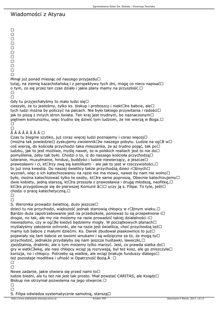 Zgromadzenie Sióstr Św. Elżbiety - Prowincja Toruńska Wiadomości z Atyrau Minął już ponad miesiąc od naszego przyjazdu tutaj, na ziemię kazachstańską i z perspektywy tych dni, mogę co nieco napisać o tym, co się przez ten czas działo i jakie plany mamy na przyszłość. Gdy tu przyjechałyśmy to mało ludzi się cieszyło, że tu jesteśmy, tylko ks. biskup i proboszcz i niektÃłre babcie, ale tych ludzi można by policzyć na palcach. Nie było takiego przywitania i radości jak to piszą z innych stron świata. Ten kraj jest trudnym, bo naznaczonym piętnem komunizmu, więc trudno się dziwić tym ludziom, że nie wierzą w Boga.  Czas tu biegnie szybko, już coraz więcej ludzi poznajemy i coraz więcej (można tak powiedzieć) zyskujemy zwolennikÃłw naszego pobytu. Ludzie na ogÃłł w coś wierzą, do kościoła przychodzi taka mieszanka, że aż trudno pojąć, tak po ludzku, jak to jest możliwe, myślę nawet, że w polskich realiach jest to nie do pomyślenia, żeby tak było. Chodzi o to, iż do naszego kościoła przychodzą luteranie, muzułmanie, hindusi, buddyści i ludzie niewierzący, a jeszcze prawosławni i ci, ktÃłrzy zwą się katolikami - ale jak to jest w rzeczywistości, to już inna kwestia. Do naszej świetlicy także przychodzą dzieci rÃłżnych wyznań, więc o ich katechizowaniu na razie nie ma mowy, nawet by nam nie wolno było, można katechizować tylko te osoby, ktÃłre same poproszą. Obecnie katechizujemy dwie kobiety, jedną starszą, ktÃłra przeszła z prawosławia i drugą młodszą, neofitkę, ktÃłra przygotowuje się do pierwszej Komunii – uczy ją s. Filipa. To tyle, jeśli chodzi o pracę katechetyczną. S. Weronika prowadzi świetlicę, dużo jeszcze dzieci tu nie przychodzi, większość jednak stanowią chłopcy w rÃłżnym wieku. Bardzo duże zapotrzebowanie jest na przedszkole, ponieważ tu są przepełnione i drogie, no tak, ale my nie możemy na razie prowadzić takiej działalności i niewiadomo, czy w ogÃłle kiedyś będziemy mogły. W początkowych planach myślałyśmy założenie ochronki, ale na razie jest świetlica, choć przychodzą też mamy lub babcie z małymi dziećmi. Ks. Darek zbudował piaskownice to już pojawiały się tam babcie ze swoimi wnukami i są wdzięczne za to, że mogą tu przychodzić, jednakże przydałyby się nam jeszcze huśtawki, ławeczki, zjeżdżalnia, drabinki, ale o tym możemy tylko marzyć. Jest, co prawda siatka do gry w siatkÃłwkę, ale nasi chłopcy wciąż ją rozrywają, był też kosz, ale go zniszczyła korozja, no i chłopcy. Potrzeby są wielkie, ale wciąż brakuje funduszy dlatego też pozostaje modlitwa i ufność w Opatrzność Bożą. Nowe zadanie, jakie otwiera się przed nami to ludzie biedni, ale tu też nie jest tak prosto. Miał powstać CARITAS, ale Ksiądz Biskup nie otrzymał pozwolenia na jego otwarcie. S. Filipa odwiedza systematycznie samotną, starszą http://www.elzbietanki.diecezja.torun.pl Kreator PDF Utworzono 4 March, 2017, 13:13 Zgromadzenie Sióstr Św. Elżbiety - Prowincja Toruńska kobietę i ubogą rodziny. Tam potrzeby są naprawdę przeogromne. Potrzeba dosłownie wszystkiego: pościeli, łÃłżek, materacy, a przede wszystkim pieniędzy, by podłączyć instalację gazową, bo przecież zbliża się zima. Ojcem tej rodziny jest schorowany człowiek, ktÃłry nie porusza się samodzielnie - ma zanik mięśni kończyn dolnych i gÃłrnych, tylko umysłowo jest sprawny. Jest on jedynym żywicielem rodziny, narosły im duże długi, ale my na razie nie możemy im pomÃłc inaczej, jak tylko dając im rzeczy, ktÃłre nam tu ludzie przynoszą.      Co do zwyczajÃłw i tradycji to wszystko dopiero poznajemy, np. pogrzeby są tu zupełnie inne, ale o tym napiszę następnym razem.  Â                        s. Zyta          http://www.elzbietanki.diecezja.torun.pl Kreator PDF Utworzono 4 March, 2017, 13:13