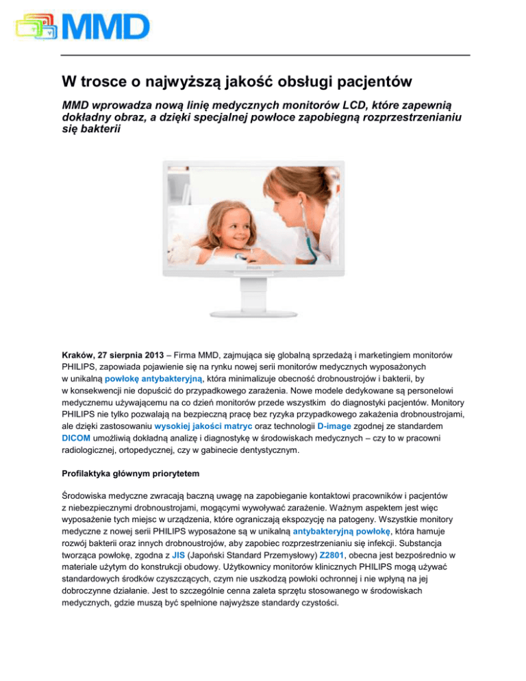 W trosce o najwyższą jakość obsługi pacjentów MMD wprowadza nową linię medycznych monitorów LCD, które zapewnią dokładny obraz, a dzięki specjalnej powłoce zapobiegną rozprzestrzenianiu się bakterii Kraków, 27 sierpnia 2013 – Firma MMD, zajmująca się globalną sprzedażą i marketingiem monitorów PHILIPS, zapowiada pojawienie się na rynku nowej serii monitorów medycznych wyposażonych w unikalną powłokę antybakteryjną, która minimalizuje obecność drobnoustrojów i bakterii, by w konsekwencji nie dopuścić do przypadkowego zarażenia. Nowe modele dedykowane są personelowi medycznemu używającemu na co dzień monitorów przede wszystkim do diagnostyki pacjentów. Monitory PHILIPS nie tylko pozwalają na bezpieczną pracę bez ryzyka przypadkowego zakażenia drobnoustrojami, ale dzięki zastosowaniu wysokiej jakości matryc oraz technologii D-image zgodnej ze standardem DICOM umożliwią dokładną analizę i diagnostykę w środowiskach medycznych – czy to w pracowni radiologicznej, ortopedycznej, czy w gabinecie dentystycznym. Profilaktyka głównym priorytetem Środowiska medyczne zwracają baczną uwagę na zapobieganie kontaktowi pracowników i pacjentów z niebezpiecznymi drobnoustrojami, mogącymi wywoływać zarażenie. Ważnym aspektem jest więc wyposażenie tych miejsc w urządzenia, które ograniczają ekspozycję na patogeny. Wszystkie monitory medyczne z nowej serii PHILIPS wyposażone są w unikalną antybakteryjną powłokę, która hamuje rozwój bakterii oraz innych drobnoustrojów, aby zapobiec rozprzestrzenianiu się infekcji. Substancja tworząca powłokę, zgodna z JIS (Japoński Standard Przemysłowy) Z2801, obecna jest bezpośrednio w materiale użytym do konstrukcji obudowy. Użytkownicy monitorów klinicznych PHILIPS mogą używać standardowych środków czyszczących, czym nie uszkodzą powłoki ochronnej i nie wpłyną na jej dobroczynne działanie. Jest to szczególnie cenna zaleta sprzętu stosowanego w środowiskach medycznych, gdzie muszą być spełnione najwyższe standardy czystości. Dobre odwzorowanie obrazu wspierające trafną diagnostykę Trzy monitory medyczne dostępne w nowej linii charakteryzują się ostrym i wyraźnym obrazem oraz największymi możliwymi kątami widzenia dzięki zastosowaniu najlepszej jakości matryc. Monitory te otrzymały międzynarodowe certyfikaty potwierdzające ich przeznaczenie do użytku diagnostycznego w placówkach medycznych. 24-calowy monitor z matrycą IPS (PHILIPS C240P4QPYEW) oraz 27-calowy model z matrycą AMVA (C271P4QPJEW) obsługują technologię Clinical-D wyświetlania obrazu, która zapewnia precyzję w czasie diagnostyki. Zgodne z DICOM – międzynarodowym standardem tworzenia, przechowywania i wyświetlania klinicznych obrazów i zdjęć – nowe modele monitorów medycznych gwarantują wierne odwzorowanie skali szarości dzięki kalibracji według standardu DICOM Part 14, co skutkuje widocznością nawet 2 najdrobniejszych detali. Oba modele charakteryzują się maksymalną jasnością na poziomie 300 cd/m , dzięki czemu obraz na ekranie jest widoczny również w mocno oświetlonych pomieszczeniach. Zaprezentowana linia nowych monitorów medycznych obejmuje również 21,5-calowy model Philips C221S3UCW zasilany przez USB, który znajdzie zastosowanie tam, gdzie konieczna jest mobilność urządzenia wyświetlającego obraz. Sprawdzi się w miejscu, gdzie nie będzie łatwego dostępu do gniazdka elektrycznego, bo do zasilania ekranu wystarczy podłączenie go do komputera lub notebooka za pomocą jednego kabla USB. Dodatkowe wsparcie każdego dnia Wszystkie modele monitorów medycznych wyposażone są w dodatkowe funkcje usprawniające pracę w środowiskach medycznych. Przykładami mogą być specjalne zasilacze dostosowane do wymogów klinicznych, możliwość montażu na ścianie oraz regulacja pozycji monitora (wysokości, pochylenia w pionie, przechylenia w poziomie). Zapewni to prawidłową postawę w czasie pracy, zapobiegając zmęczeniu i dolegliwościom związanym z długim przebywaniem przed komputerem. Aby zaoszczędzić energię elektryczną, 24 i 27-calowy monitor używa czujnika PowerSensor, by w razie nieobecności użytkownika przed ekranem zmniejszyć swoją jasność, a więc i pobór energii elektrycznej. Dedykowane tryby wyświetlania obrazu SmartTxt oraz SmartImage Clinic umożliwiają łatwe dostosowanie parametrów wyświetlania obrazu (takich jak kontrast czy temperatura kolorów) w zależności od uruchomionej w danym momencie aplikacji medycznej lub biurowej. Do zmiany trybów służy menu ekranowe OSD, które użytkownik może dostosowywać do swoich potrzeb. Specyfikacja techniczna Rodzaj panelu LCD, przekątna i format Technologia podświetlenia Natywna rozdzielczość Kąty widzenia 21,5 cali / 54,6 cm: TFT-LCD (TN)16:9 24 cali / 61 cm: IPS LCD 16:10 27 cali / 68,6 cm: AMVA LCD 16:9 W-LED Modele 21,5-calowy i 27-calowy: 1920 x 1080 @ 60 Hz 24-calowy model: 1920 x 1200 @ 60Hz Model 21,5-calowy: 160º (H) / 150º (V), @ C/R > 10 Jasność maksymalna Współczynnik kontrastu Wielkość plamki Wyświetlane kolory Łączność Podstawa Zrównoważona konstrukcja Zgodność ze standardami i certyfikatami Modele 24-calowy i 27-calowy: 178º (H) / 178º (V), @ C/R > 10 Model 21,5-calowy: 150 cd/m² Modele 24-calowy i 27-calowy: 300 cd/m² Modele 21,5-calowy i 24-calowy: 1000:1 27-calowy: 5000:1 21.5-calowy: 0.248 x 0.248 mm 24-calowy: 0.270 x 0.270 mm 27-calowy: 0.311 x 0.311 mm 16.7 M 21,5-calowy: Wejście obrazu: USB 2.0 24-calowy: Wejście sygnału: DisplayPort 1.2, DVI-D (cyfrowy, HDCP), VGA (analogowy), USB 2.0 x 4 27-calowy: tak jak 24-calowy, dodatkowo HDMI) 21,5-calowy: Regulacja wysokości: do 70 mm Przechylenie: -65/65 stopni Pochylenie: -5/20 stopni 24-calowy: Regulacja wysokości: 130 mm Pivot: 90 stopni Przechylenie: -65/65 stopni Pochylenie: -5/20 stopni 27-calowy: Regulacja wysokości: 150 mm Pivot: 90 stopni Przechylenie: -65