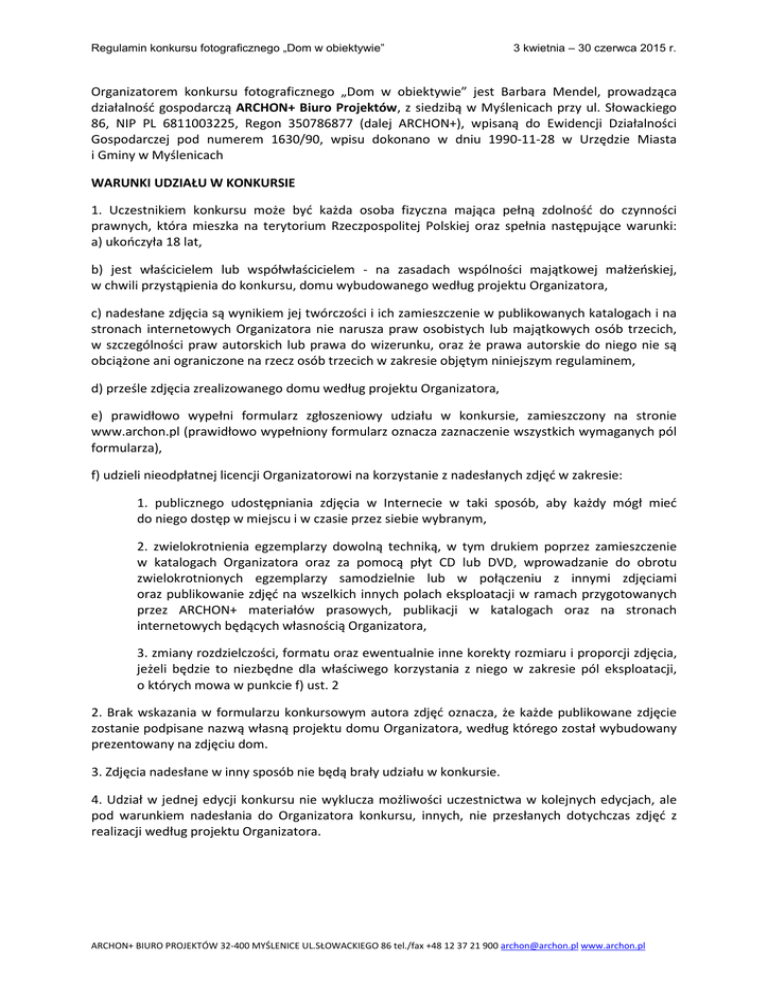 Regulamin konkursu fotograficznego „Dom w obiektywie” 3 kwietnia – 30 czerwca 2015 r. Organizatorem konkursu fotograficznego „Dom w obiektywie” jest Barbara Mendel, prowadząca działalność gospodarczą ARCHON+ Biuro Projektów, z siedzibą w Myślenicach przy ul. Słowackiego 86, NIP PL 6811003225, Regon 350786877 (dalej ARCHON+), wpisaną do Ewidencji Działalności Gospodarczej pod numerem 1630/90, wpisu dokonano w dniu 1990-11-28 w Urzędzie Miasta i Gminy w Myślenicach WARUNKI UDZIAŁU W KONKURSIE 1. Uczestnikiem konkursu może być każda osoba fizyczna mająca pełną zdolność do czynności prawnych, która mieszka na terytorium Rzeczpospolitej Polskiej oraz spełnia następujące warunki: a) ukończyła 18 lat, b) jest właścicielem lub współwłaścicielem - na zasadach wspólności majątkowej małżeńskiej, w chwili przystąpienia do konkursu, domu wybudowanego według projektu Organizatora, c) nadesłane zdjęcia są wynikiem jej twórczości i ich zamieszczenie w publikowanych katalogach i na stronach internetowych Organizatora nie narusza praw osobistych lub majątkowych osób trzecich, w szczególności praw autorskich lub prawa do wizerunku, oraz że prawa autorskie do niego nie są obciążone ani ograniczone na rzecz osób trzecich w zakresie objętym niniejszym regulaminem, d) prześle zdjęcia zrealizowanego domu według projektu Organizatora, e) prawidłowo wypełni formularz zgłoszeniowy udziału w konkursie, zamieszczony na stronie www.archon.pl (prawidłowo wypełniony formularz oznacza zaznaczenie wszystkich wymaganych pól formularza), f) udzieli nieodpłatnej licencji Organizatorowi na korzystanie z nadesłanych zdjęć w zakresie: 1. publicznego udostępniania zdjęcia w Internecie w taki sposób, aby każdy mógł mieć do niego dostęp w miejscu i w czasie przez siebie wybranym, 2. zwielokrotnienia egzemplarzy dowolną techniką, w tym drukiem poprzez zamieszczenie w katalogach Organizatora oraz za pomocą płyt CD lub DVD, wprowadzanie do obrotu zwielokrotnionych egzemplarzy samodzielnie lub w połączeniu z innymi zdjęciami oraz publikowanie zdjęć na wszelkich innych polach eksploatacji w ramach przygotowanych przez ARCHON+ materiałów prasowych, publikacji w katalogach oraz na stronach internetowych będących własnością Organizatora, 3. zmiany rozdzielczości, formatu oraz ewentualnie inne korekty rozmiaru i proporcji zdjęcia, jeżeli będzie to niezbędne dla właściwego korzystania z niego w zakresie pól eksploatacji, o których mowa w punkcie f) ust. 2 2. Brak wskazania w formularzu konkursowym autora zdjęć oznacza, że każde publikowane zdjęcie zostanie podpisane nazwą własną projektu domu Organizatora, według którego został wybudowany prezentowany na zdjęciu dom. 3. Zdjęcia nadesłane w inny sposób nie będą brały udziału w konkursie. 4. Udział w jednej edycji konkursu nie wyklucza możliwości uczestnictwa w kolejnych edycjach, ale pod warunkiem nadesłania do Organizatora konkursu, innych, nie przesłanych dotychczas zdjęć z realizacji według projektu Organizatora. ARCHON+ BIURO PROJEKTÓW 32-400 MYŚLENICE UL.SŁOWACKIEGO 86 tel./fax +48 12 37 21 900 [email protected] www.archon.pl Regulamin konkursu fotograficznego „Dom w obiektywie” 3 kwietnia – 30 czerwca 2015 r. ZASADY I SPOSÓB PRZEPROWADZANIA KONKURSU 1. Edycja konkursu trwa 3 miesiące od 3.04-30.06.2015 r. 2. Komisja konkursowa spośród nadesłanych zdjęć z realizacji wybierze najlepsze, które zostaną nagrodzone. 3. Nagroda nie podlega wymianie na inną, ani jej wartość nie może stanowić ekwiwalentu pieniężnego. 4. Rozstrzygniecie każdej z edycji konkursu zostanie ogłoszone nie później niż 14 dni od daty zakończenia danej edycji. 5. Informacje o wynikach konkursu zostaną zamieszczone na stronie internetowej www.archon.pl. 6. Laureaci kolejnych edycji zostaną powiadomieni o wygranej telefonicznie oraz listem poleconym w terminie do 14 dni od daty rozstrzygnięcia konkursu. 7. Nagroda zostanie przesłana do Laureata w ciągu 14 dni roboczych. 8. Nagroda nieodebrana w ciągu 6 tygodniu od dnia ogłoszenia wyników, ulega przepadkowi i pozostaje własnością Organizatora. NAGRODY W KONKURSIE 1. Nagrodą w konkursie jest atrakcyjny tablet Apple iPad mini 16GB Wi-Fi2. o wartości 1099 zł. 2. Poza nagrodą rzeczową Laureat otrzyma dodatkowo nagrodę pieniężną w wysokości 11,11% wartości nagrody rzeczowej w zaokrągleniu do pełnych złotych. Organizator zgodnie z obowiązującymi przepisami podatkowymi pobierze od Uczestnika, który uzyskał prawo do nagrody, podatek dochodowy od osób fizycznych i przekaże go do właściwego Urzędu Skarbowego. Potrącenie podatku dochodowego oznacza, iż nagroda pieniężna nie zostanie wydana Zwycięzcy. POSTANOWIENIA KOŃCOWE 1. Nadesłane zdjęcia stają się własnością Organizatora i nie podlegają zwrotowi. 2. Decyzje komisji są ostateczne dla wszystkich uczestników i nie przysługuje od nich odwołanie. 3. Organizator nie ponosi odpowiedzialności z tytułu rękojmi za wady nagrody. 4. Przetwarzanie danych osobowych uczestników konkursu następuje zgodnie z ustawą o ochronie danych osobowych. ARCHON+ BIURO PROJEKTÓW 32-400 MYŚLENICE UL.SŁOWACKIEGO 86 tel./fax +48 12 37 21 900 [email protected] www.archon.pl