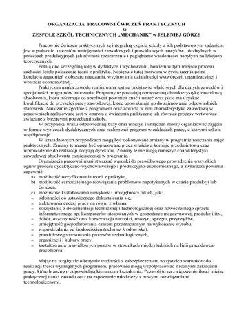 ORGANIZACJA PRACOWNI ĆWICZEŃ PRAKTYCZNYCH W ZESPOLE SZKÓŁ TECHNICZNYCH „MECHANIK” w JELENIEJ GÓRZE Pracownie ćwiczeń praktycznych są integralną częścią szkoły a ich podstawowym zadaniem jest wyrobienie u uczniów umiejętności zawodowych i prawidłowych nawyków, niezbędnych w procesach produkcyjnych jak również rozszerzenie i pogłębianie wiadomości nabytych na lekcjach teoretycznych. Pełnią one szczególną rolę w dydaktyce i wychowaniu, bowiem w tym miejscu procesu zachodzi ścisłe połączenie teorii z praktyką. Następuje tutaj pierwsza w życiu ucznia pełna korelacja zagadnień z obszaru nauczania, wychowania działalności wytwórczej, organizacyjnej i wreszcie ekonomicznej. Praktyczna nauka zawodu realizowana jest na podstawie właściwych dla danych zawodów i specjalności programów nauczania. Programy te posiadają opracowaną charakterystykę zawodową absolwenta, która informuje co absolwent powinien znać i umieć oraz jakie ma uzyskać kwalifikacje do przyszłej pracy zawodowej, które upoważniają go do zajmowania odpowiednich stanowisk. Nauczanie zgodnie z programem oraz zawartą w nim charakterystyką zawodową w pracowniach realizowane jest w oparciu o ćwiczenia praktyczne jak również procesy wytwórcze związane z bieżącymi potrzebami szkoły. W przypadku braku odpowiedniej bazy oraz maszyn i urządzeń należy organizować zajęcia w formie wycieczek dydaktycznych oraz realizować program w zakładach pracy, z którymi szkoła współpracuje. W uzasadnionych przypadkach mogą być dokonywane zmiany w programie nauczania zajęć praktycznych. Zmiany te muszą być opiniowane przez właściwą komisję przedmiotową oraz wprowadzone do realizacji decyzją dyrektora. Zmiany te nie mogą naruszyć charakterystyki zawodowej absolwenta zamieszczonej w programie. Organizacja pracowni musi stwarzać warunki do prawidłowego prowadzenia wszystkich ogniw procesu dydaktyczno-wychowawczego i produkcyjno-ekonomicznego, a zwłaszcza powinna zapewnić: a) możliwość weryfikowania teorii z praktyką, b) możliwość samodzielnego rozwiązania problemów napotykanych w czasie produkcji lub ćwiczeń, c) możliwość kształtowania nawyków i umiejętności takich, jak: • skłonności do ustawicznego dokształcania się, • traktowania cudzej pracy na równi z własną, • korzystania z dokumentacji technicznej i technologicznej oraz nowoczesnego sprzętu informatycznego np. komputerów stosowanych w gospodarce magazynowej, produkcji itp., • dobór, oszczędność oraz konserwacja narzędzi, maszyn, sprzętu, przyrządów, • umiejętność gospodarowania czasem przeznaczonym na wykonanie wyrobu, • współdziałania ze środowiskiem(ochrona środowiska), • prawidłowego stosowania procesów technologicznych, • organizacji i kultury pracy, • kształtowania prawidłowych postaw w stosunkach międzyludzkich na linii pracodawcapracobiorca. Mając na względzie olbrzymie trudności z zabezpieczeniem wszystkich warunków do realizacji treści wymaganych programem, pracownie mogą współpracować z różnymi zakładami pracy, które branżowo odpowiadają kierunkom kształcenia. Pozwoli to na zwiększenie ilości miejsc praktycznej nauki zawodu oraz na zapoznanie młodzieży z nowymi rozwiązaniami technologicznymi. II. PODZIAŁ KLAS NA GRUPY Przy realizacji praktycznej nauki zawodu stosuje się podział klas na grupy. Ilość grup oraz ich liczebność zależy od: • wymogów programowych, • ilości młodzieży w klasie, • ilości stanowisk szkoleniowo-produkcyjnych, • ograniczeń warunkami bhp. Ponadto przy ustaleniu liczebności grup należy kierować się optymalnością uzyskiwania efektów dydaktyczno-wychowawczych, produkcyjno-ekonomicznych oraz aktualnie istniejącymi warunkami w pracowniach ćwiczeń praktycznych dla zapewnienia przede wszystkim bezpiecznych warunków pracy. III. CZAS TRWANIA ZAJĘĆ PRAKTYCZNYCH Kierownik w porozumieniu z Dyrektorem Szkoły ustala godziny rozpoczęcia i zakończenia zajęć w pracowniach ćwiczeń praktycznych. Zajęcia praktyczne mogą odbywać się na dwie zmiany. Zakończenie zajęć na drugiej zmianie powinno nastąpić najpóźniej o godzinie 19.00. Celem umożliwienia młodzieży korzystania z wypoczynku w czasie zajęć praktycznych w pracowniach należy stosować w czasie trwania zajęć przerwę. Przerwę w zajęciach praktycznych wlicza się do ogólnego czasu trwania zajęć. Przerwa nie może powodować podwyższenia czasu trwania zajęć praktycznych. Sposób organizowania przerwy w zajęciach praktycznych ustala kierownik szkolenia praktycznego. IV. DOKUMENTACJA PEDAGOGICZNA I WARSZTATOWA Działalność dydaktyczna i produkcyjna podlega dokumentowaniu. Dokumentacja pedagogiczna bez względu na rodzaj, typ i kierunek kształcenia jest taka sama. Natomiast w części produkcyjno-ekonomicznej dokumentacja warsztatowa uzależniona jest od typu i kierunku kształcenia. WYKAZ DOKUMENTÓW DOKUMENTACJA PEDAGOGICZNA: • programy nauczania i wynikowe plany nauczania, • dziennik lekcyjny, • zeszyt zajęć praktycznych, • plan przejść uczniów przez działy szkoleniowe, • wykazy ćwiczeń, DOKUMENTACJA WARSZTATOWA: • regulamin pracowni • instrukcje bhp i p.poż. • instrukcje obsługi maszyn i urządzeń • karty ćwiczeń V. USTALENIA PORZĄDKOWE 1. Nauczyciele pełnią dyżury zgodnie z obowiązującym harmonogramem i ustalonym 2. 3. 4. 5. 6. 7. 8. zakresem obowiązków. Nauczyciel zobowiązany jest do przestrzegania przepisów bhp i p.poż. oraz przekazywać instrukcję bhp i p.poż. na stanowiska pracy uczniom. Wymagany jest zapis w zeszycie zajęć praktycznych o realizacji w/w tematów. Przed rozpoczęciem zajęć w pracowniach na początku roku szkolnego opiekun klasy przeprowadza dla całej klasy ogólne szkolenie bhp i p.poż. Fakt ten należy odnotować w zeszycie zajęć praktycznych – wymagany jest podpis ucznia. Uczeń zobowiązany jest do przestrzegania