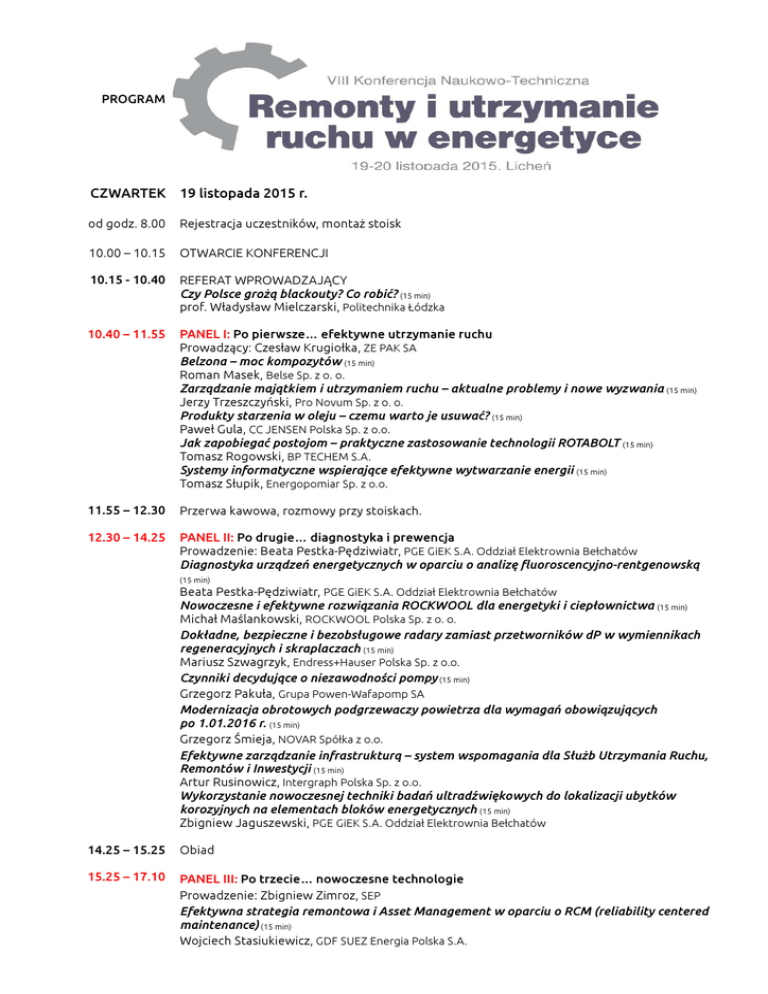 PROGRAM CZWARTEK 19 listopada 2015 r. od godz. 8.00 Rejestracja uczestników, montaż stoisk 10.00 – 10.15 OTWARCIE KONFERENCJI 10.15 - 10.40 REFERAT WPROWADZAJĄCY Czy Polsce grożą blackouty? Co robić? (15 min) prof. Władysław Mielczarski, Politechnika Łódzka 10.40 – 11.55 PANEL I: Po pierwsze… efektywne utrzymanie ruchu Prowadzący: Czesław Krugiołka, ZE PAK SA Belzona – moc kompozytów (15 min) Roman Masek, Belse Sp. z o. o. Zarządzanie majątkiem i utrzymaniem ruchu – aktualne problemy i nowe wyzwania (15 min) Jerzy Trzeszczyński, Pro Novum Sp. z o. o. Produkty starzenia w oleju – czemu warto je usuwać? (15 min) Paweł Gula, CC JENSEN Polska Sp. z o.o. Jak zapobiegać postojom – praktyczne zastosowanie technologii ROTABOLT (15 min) Tomasz Rogowski, BP TECHEM S.A. Systemy informatyczne wspierające efektywne wytwarzanie energii (15 min) Tomasz Słupik, Energopomiar Sp. z o.o. 11.55 – 12.30 Przerwa kawowa, rozmowy przy stoiskach. 12.30 – 14.25 PANEL II: Po drugie… diagnostyka i prewencja Prowadzenie: Beata Pestka-Pędziwiatr, PGE GiEK S.A. Oddział Elektrownia Bełchatów Diagnostyka urządzeń energetycznych w oparciu o analizę fluoroscencyjno-rentgenowską (15 min) Beata Pestka-Pędziwiatr, PGE GiEK S.A. Oddział Elektrownia Bełchatów Nowoczesne i efektywne rozwiązania ROCKWOOL dla energetyki i ciepłownictwa (15 min) Michał Maślankowski, ROCKWOOL Polska Sp. z o. o. Dokładne, bezpieczne i bezobsługowe radary zamiast przetworników dP w wymiennikach regeneracyjnych i skraplaczach (15 min) Mariusz Szwagrzyk, Endress+Hauser Polska Sp. z o.o. Czynniki decydujące o niezawodności pompy (15 min) Grzegorz Pakuła, Grupa Powen-Wafapomp SA Modernizacja obrotowych podgrzewaczy powietrza dla wymagań obowiązujących po 1.01.2016 r. (15 min) Grzegorz Śmieja, NOVAR Spółka z o.o. Efektywne zarządzanie infrastrukturą – system wspomagania dla Służb Utrzymania Ruchu, Remontów i Inwestycji (15 min) Artur Rusinowicz, Intergraph Polska Sp. z o.o. Wykorzystanie nowoczesnej techniki badań ultradźwiękowych do lokalizacji ubytków korozyjnych na elementach bloków energetycznych (15 min) Zbigniew Jaguszewski, PGE GiEK S.A. Oddział Elektrownia Bełchatów 14.25 – 15.25 Obiad 15.25 – 17.10 PANEL III: Po trzecie… nowoczesne technologie Prowadzenie: Zbigniew Zimroz, SEP Efektywna strategia remontowa i Asset Management w oparciu o RCM (reliability centered maintenance) (15 min) Wojciech Stasiukiewicz, GDF SUEZ Energia Polska S.A. Innowacyjne produkty dla energetyki (15 min) Czesław Walencki, KRAJ Sp. z o.o. Rozwiązania uszczelnieniowe ANGA dla energetyki (15 min) Jacek Weigel, ANGA Uszczelnienia Mechaniczne Sp. z o.o. Wysokojakościowe syntetyczne oleje smarne, a ograniczenie zużycia energii (15 min) Bogdan Miśta, FUCHS OIL CORPORATION (PL) Sp. z o.o. Wpływ konstrukcji i stanu technicznego połączeń kołnierzowych na niezawodność pracy urządzeń ciśnieniowych Elektrowni (15 min) Jan Kasprzyk, Spetech Sp. z o.o. Środki smarne w energetyce. Korzyści. Możliwości. Zastosowania. (15 min) Cezary Wyszecki, SHELL Polska Sp. z o. o. 17.10 – 17.40 Przerwa kawowa, rozmowy przy stoiskach 17.40 – 19.10 PANEL DYSKUSYJNY: Będziemy mieli nowy blok… I co dalej? Czyli UR w nowych jednostkach Tematyka: • budujemy nowy blok, • eksploatujemy nowy blok, czyli o bieżących problemach, • remonty i modernizacje na nowym bloku, • Utrzymanie Ruchu na nowym i zmodernizowanym bloku, • optymalizacja pracy nowego bloku, • „podkręcić” sprawność nowego bloku. Moderator: Andrzej Patrycy – Prezes Zarządu Energoprojekt-Warszawa S.A. Zaproszeni: Piotr Dziubałtowski – Wiceprezes Zarządu, TAURON Ciepło sp. z o.o. Mieczysław Kobylarz – Dyrektor Biura Zarządzania Procesami Wytwarzania, Jakością, Środowiskiem i Wsparciem BHP, GDF Suez Energia Polska Piotr Oberc – Zastępca Dyrektora ds. Utrzymania Majątku, EDF Polska S.A. Stanisław Papuga – Dyrektor Techniczny, PGE GiEK SA Oddział Elektrownia Bełchatów Karol Sobczak – Dyrektor ds. Produkcji, ZE PAK Stanisław Tokarski – Prezes Zarządu, Towarzystwo Gospodarcze Polskie Elektrownie Jerzy Trzeszczyński – Prezes Zarządu PRO NOVUM Sp. z o.o. 20.00 Kolacja i spotkanie towarzyskie w restauracji hotelu Atut (dawny hotel Magda) PIĄTEK 20 listopada 2015 r. 08.00 – 09.00 9.00 – 11.00 Śniadanie w miejscu zakwaterowania PANEL IV: Po czwarte… remonty, czyli dłuższe życie jednostki Prowadzenie: Jacek Karczewski, Instytut Energetyki Oddziału Techniki Cieplnej „ITC” w Łodzi Zmodernizowane bloki 200 MW – utrzymanie dobrego stanu technicznego i doświadczenia eksploatacyjne (15 min) Stanisław Noworyta i Sebastian Faruga, TAURON Wytwarzanie S.A. Modernizacje części przepływowych WP i NP dla bloków 225 MW w Enea Wytwarzanie – zastosowane rozwiązania techniczne i uzyskane efekty (15 min) Michał Wójcik, ENEA Wytwarzanie sp. z o.o. Izolacja Aerożelowa – technologia jutra już dziś (15 min) Daniel Kołakowski, Aerogels Poland Nanotechnology Monitorowanie i kontrola pracy odwodnieni na instalacjach parowych dla zapewnienia bezpiecznej i ekonomicznej pracy systemu pary i kondensatu (15 min) Krzysztof Szałucki, GESTRA Polonia Sp. z o.o. Dotrzymanie konkluzji BAT przy optymalizacji kosztów – modernizacja całej ścieżki przepływu spalin (podgrzewaczy powietrza, kanałów spalin oraz odpylaczy)(15 min) Grzegorz Skrzypczyk, Balcke-Dürr Polska Sp. z o.o. Trwałe uszczelnienia mechaniczne dbałość o krytyczny element pomp i mieszadeł (15 min) Zenon Gawronek, Daniel Głowacki, AESSEAL Polska Sp. z o.o. Modernizacje młynów węglowych MKM-33 w Enea Wytwarzanie (15 min) Marcin Wasiłek, Enea Wytwarzanie sp. z o.o. 11.00 – 11.30 Przerwa, zwiedzanie stoisk 11.30 – 13.00 PANEL V: Po piąte… bezpieczeństwo Prowadzenie: dr inż. Dorota Brzezińska, Katedra Inżynierii Bezpieczeństwa Pracy Politechniki Łódzkiej Dostosowania remontowanych obiektów energetyc