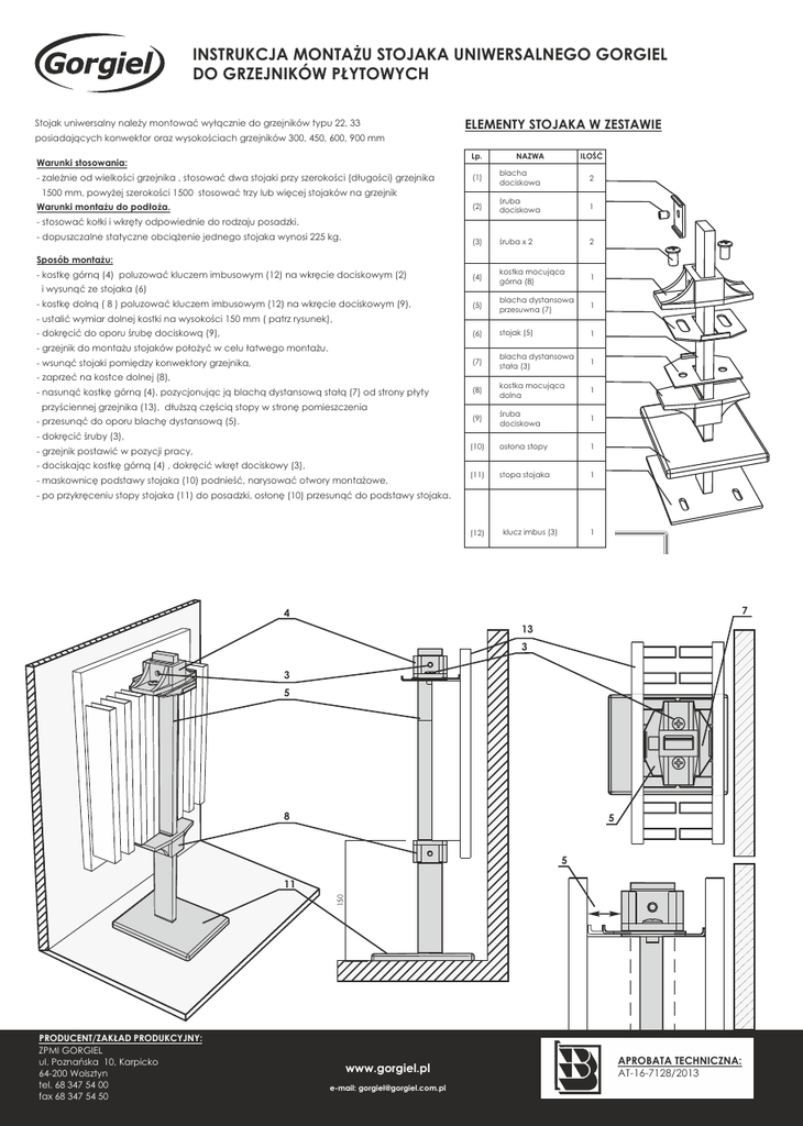 INSTRUKCJA MONTAŻU STOJAKA UNIWERSALNEGO GORGIEL DO GRZEJNIKÓW PŁYTOWYCH Stojak uniwersalny należy montować wyłącznie do grzejników typu 22, 33 ELEMENTY STOJAKA W ZESTAWIE posiadających konwektor oraz wysokościach grzejników 300, 450, 600, 900 mm Lp. Warunki stosowania: - zależnie od wielkości grzejnika , stosować dwa stojaki przy szerokości (długości) grzejnika NAZWA ILOŚĆ (1) blacha dociskowa 2 (2) śruba dociskowa 1 (3) śruba x 2 2 (4) kostka mocująca górna (8) 1 (5) blacha dystansowa przesuwna (7) 1 (6) stojak (5) 1 (7) blacha dystansowa stała (3) 1 (8) kostka mocująca dolna 1 (9) śruba dociskowa 1 (10) osłona stopy 1 (11) stopa stojaka 1 1500 mm, powyżej szerokości 1500 stosować trzy lub więcej stojaków na grzejnik Warunki montażu do podłoża. - stosować kołki i wkręty odpowiednie do rodzaju posadzki. - dopuszczalne statyczne obciążenie jednego stojaka wynosi 225 kg. Sposób montażu: - kostkę górną (4) poluzować kluczem imbusowym (12) na wkręcie dociskowym (2) i wysunąć ze stojaka (6) - kostkę dolną ( 8 ) poluzować kluczem imbusowym (12) na wkręcie dociskowym (9), - ustalić wymiar dolnej kostki na wysokości 150 mm ( patrz rysunek), - dokręcić do oporu śrubę dociskową (9), - grzejnik do montażu stojaków położyć w celu łatwego montażu. - wsunąć stojaki pomiędzy konwektory grzejnika, - zaprzeć na kostce dolnej (8), - nasunąć kostkę górną (4), pozycjonując ją blachą dystansową stałą (7) od strony płyty przyściennej grzejnika (13), dłuższą częścią stopy w stronę pomieszczenia - przesunąć do oporu blachę dystansową (5). - dokręcić śruby (3), - grzejnik postawić w pozycji pracy, - dociskając kostkę górną (4) , dokręcić wkręt dociskowy (3), - maskownicę podstawy stojaka (10) podnieść, narysować otwory montażowe, - po przykręceniu stopy stojaka (11) do posadzki, osłonę (10) przesunąć do podstawy stojaka. (12) klucz imbus (3) 1 7 4 13 3 3 5 8 5 5 150 11 PRODUCENT/ZAKŁAD PRODUKCYJNY: ZPMI GORGIEL ul. Poznańska 10, Karpicko 64-200 Wolsztyn tel. 68 347 54 00 fax 68 347 54 50 www.gorgiel.pl e-mail: [email protected] APROBATA TECHNICZNA: AT-16-7128/2013 KARTA GWARANCYJNA Warunki gwarancji: 1) Uszkodzenia mechaniczne powstałe poza zakładem producenta lub w wyniku nieprawidłowego montażu i użytkowania nie podlegają gwarancji i mogą być usunięte odpłatnie. 2) Uszkodzenia powstałe z winy producenta będą usuwane nieodpłatnie w terminie 14 dni od daty dostarczenia wyrobu do producenta. 3) Podstawą rozpatrzenia gwarancji jest poprawne wypełnienie zgłoszenia reklamacyjnego ( plik do pobrania ze strony www.gorgiel.pl) z dołączoną kopią (skanem) faktury zakupu. 4) Gwarancja producenta obejmuje okres 2 lat od daty zakupu, nie dłużej jednak niż 3 lata od daty produkcji. Data sprzedaży i pieczęć sprzedawcy Pieczęć KJ 300 450 600 900 TYP PRODUCENT/ZAKŁAD PRODUKCYJNY: ZPMI GORGIEL ul. Poznańska 10, Karpicko 64-200 Wolsztyn tel. 68 347 54 00 fax 68 347 54 50 www.gorgiel.pl e-mail: [email protected] APROBATA TECHNICZNA: AT-16-7128/2013