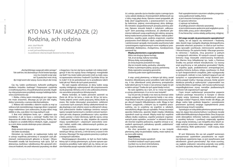 tekst: Józef Wasilik tel. 032 4316310 e-mail: [email protected] na podstawie własnej książki Bastard na łonie Macochy „Kochaj bliźniego swego jak siebie samego”. Tak rzekł ten, kto doświadczyć chciał świata lepszego, Lecz mu instynkt wciąż szeptał: Ty posłuchać mnie chciej, Byś mógł swoim dać więcej, musisz obcym dać mniej. Czy my, ludzie cywilizowani, kulturalni podlegamy działaniu instynktu stadnego? Przepraszam czytelnika o wrażliwej psychice, chcę jednak poznać prawdę. Osądźmy niżej przytoczone przykłady naszego ludzkiego behawioru (zachowania się): 1. Matka, z którą razem mieszkają jej syn i jego żona, nie może zrozumieć, dlaczego jej syn jest taki mądry, dobry i pracowity, a synowa taka beznadziejna. 2. Wdowa lub rozwódka z dziećmi wyszła za mąż za wdowca lub rozwiedzionego mającego dzieci z poprzedniego małżeństwa i jest zaskoczona, że jego dzieci mają źdźbło w oku, a jej dzieci nie mają żadnych wad. 3. Brat mści zabójstwo brata, syn – zabójstwo ojca (wendeta). A jak to bywa u zwierząt? Stadko hien nie dopuszcza do siebie obcej samotnej hieny. Królica, która dopiero co urodziła kilkoro młodych, nagle „wygryza” to z nich, które zostało dotknięte przez człowieka. Plemię Kiedy wreszcie mój szczepie Od ciebie się odczepię. Ośmielam się twierdzić, że najdawniejsi ludzie żyli w ustroju wspólnoty pierwotnej w szczepach czyli plemionach rozmieszczonych głównie w Eurazji i Afryce. Prowadzili osiadły lub koczowniczy tryb życia. Żyli ze zbieractwa, myślistwa i rybołówstwa. Nie uprawiali rolnictwa ani hodowli, nie znali własności prywatnej, nie dbali „Zielone Brygady. Pismo Ekologów” nr 5 (226) / 2007 o bogactwo. Czy ten styl życia wynikał z ich niskiej inteligencji? A kto ma wyższy iloraz inteligencji: mongoloidzi czy biali? Czy może ludzie pierwotni mieli za mało czasu na opanowanie rolnictwa i hodowli? Czy blisko 30 tys. lat to mało? A ile lat potrzebowali na to przodkowie takich ludzi jak my? Warto do tych pytań powrócić. Na razie wypada odnotować, że dzicy ludzie swoją wysoką inteligencję wykorzystywali dla przystosowania się do przyrody i klimatu a nie w celu usiłowania zmieniania warunków przyrodniczo-klimatycznych. Można twierdzić, że ludzie pierwotni zaistnieli na Ziemi ok. 40 tys. lat temu, a może ok. 38 tys. lat temu. Trzeba jedynie umieć ustalić przyczynę, której skutki są znane. Nie trzeba lekceważyć pracowitości, solidności i uczciwości tych uczonych, którzy udokumentowali nagłą eksplozję w tym właśnie czasie na olbrzymich obszarach jednocześnie śladów ludzkiego istnienia: nowych typów narzędzi kamiennych z cienkimi wiórami kamiennymi jak noże, drapacze, przekłuwacze i rylce, wyrobów z kości, poroży i z kości słoniowej, igieł do szycia, ostrzy z zadziorami, haczyków na ryby, stojaków do suszenia mięsa; wyrzeźbionych i ulepionych wizerunków zwierząt i kobiet, ozdób ciała, udekorowanych grobów; paciorków, wisiorków. Czasami możemy usłyszeć lub przeczytać, że ludzie istnieli już 100 tys. lat temu, 2 mln lat temu a nawet 5 mln lat temu. Dlaczego? Do tego pytania powrócę w jednym z następnych odcinków. Rozstrzygającym dowodem, że byli na Ziemi ludzie, którzy żyli w ustroju plemiennym, są licznie opisane spostrzeżenia przodków ludzi takich jak my, którzy od czasów Kolumba zaczęli wyzwalać dzikich z ich ziem, wolno- A więc ustrój plemienny, w którym żyli dzicy, został brutalnie zlikwidowany przez przodków ludzi takich jak my. A kto zlikwidował ustrój plemienny protoplastów ludzi takich jak my? A może ci nasi antenaci nigdy nie żyli w takim ustroju? Trzeba do tych pytań kiedyś wrócić. Na razie zgódźmy się z tym, że tu i teraz nie żyjemy w ustroju plemiennym. A co na to nasz instynkt? Czy nie jest tak, że każdy z nas stara się stworzyć sobie szczep zastępczy? Na ogół przecież każdy z nas utrzymuje bliższe stosunki z grupą (zwykle rozrzuconą nawet po obcych krajach) kilkudziesięciu osób. Mogą to być krewni i przyjaciele, z którymi czy to wspólnie pracowaliśmy, czy to uczyliśmy się wspólnie w szkołach, mieszkaliśmy długie lata po sąsiedzku. Proszę zauważyć zjawisko blokersów, zjawisko bójek między młodzieżą sąsiednich osad czy wiosek. Więzią może być wspólnie odbyta służba wojskowa, wspólne przeżycie organizowanych przez sąsiadów „wczasów” w obozach śmierci, ale również wspólne polowania, wspólne emocje w zawodach sportowych, jednakowy sposób „uzdatniania” ciała, wspólny żargon. Kto chce sprawdzić, czy drzemie w nas instynkt plemienny, żeby nie powiedzieć stadny, może wybrać się na mecz piłki nożnej. Superplemię Dwaj historycy krajów sąsiednich O wielkich wodzach swych spory wiedli. Czy kłaść mu na skroń nimb bohatera, Czy jest to zbrodniarz, zbir et cetera. Od czego zaczęło się powstawanie superplemion? Sądzę, że od zajęcia się rolnictwem i hodowlą. Jako skutek tego nastąpiła eksplozja demograficzna, powstała własność prywatna i w ślad za tym technologia (początki cywilizacji), różnicowanie społeczne i hierarchizacja. Do pytania kiedy i dlaczego powstało rolnictwo i hodowla, chcę powrócić w jednym z następnych odcinków. W naszych czasach superplemiona mają niezwykle zróżnicowaną liczebność. San Marino liczy kilkadziesiąt tys. ludzi, a Państwo Środka ma ponad miliard mieszkańców. Co tworzy więź psychiczną w tak pokaźnej gromadzie? Myślę, że wspólny język, podobieństwo antropologiczne, wspólna historia, kultura, religia, cywilizacja i in. Brak tu tych bezpośrednich związków, jakie występowały w szczepach. Jednak i w nas, ludziach żyjących już od tysiącleci w superplemionach, wciąż drzemie pierwotny popęd stadny i bywają sytuacje, kiedy sprytni działacze potrafią je wykorzystać i poprowadzić nas na bój dla dobra wspólnego. Jak inaczej wytłumaczy