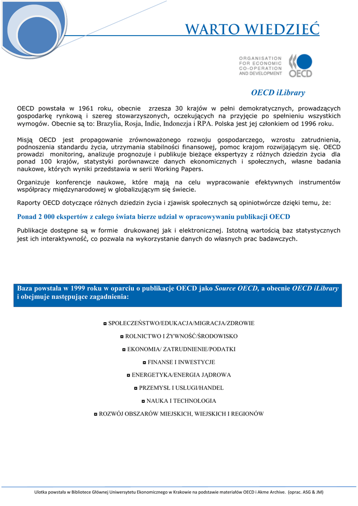 OECD iLibrary OECD powstała w 1961 roku, obecnie zrzesza 30 krajów w pełni demokratycznych, prowadzących gospodarkę rynkową i szereg stowarzyszonych, oczekujących na przyjęcie po spełnieniu wszystkich wymogów. Obecnie są to: Brazylia, Rosja, Indie, Indonezja i RPA. Polska jest jej członkiem od 1996 roku. Misją OECD jest propagowanie zrównoważonego rozwoju gospodarczego, wzrostu zatrudnienia, podnoszenia standardu życia, utrzymania stabilności finansowej, pomoc krajom rozwijającym się. OECD prowadzi monitoring, analizuje prognozuje i publikuje bieżące ekspertyzy z różnych dziedzin życia dla ponad 100 krajów, statystyki porównawcze danych ekonomicznych i społecznych, własne badania naukowe, których wyniki przedstawia w serii Working Papers. Organizuje konferencje naukowe, które mają na celu współpracy międzynarodowej w globalizującym się świecie. wypracowanie efektywnych instrumentów Raporty OECD dotyczące różnych dziedzin życia i zjawisk społecznych są opiniotwórcze dzięki temu, że: Ponad 2 000 ekspertów z całego świata bierze udział w opracowywaniu publikacji OECD Publikacje dostępne są w formie drukowanej jak i elektronicznej. Istotną wartością baz statystycznych jest ich interaktywność, co pozwala na wykorzystanie danych do własnych prac badawczych. Baza powstała w 1999 roku w oparciu o publikacje OECD jako Source OECD, a obecnie OECD iLibrary i obejmuje następujące zagadnienia: ◘ SPOŁECZEŃSTWO/EDUKACJA/MIGRACJA/ZDROWIE ◘ ROLNICTWO I ŻYWNOŚĆ/ŚRODOWISKO ◘ EKONOMIA/ ZATRUDNIENIE/PODATKI ◘ FINANSE I INWESTYCJE ◘ ENERGETYKA/ENERGIA JĄDROWA ◘ PRZEMYSŁ I USŁUGI/HANDEL ◘ NAUKA I TECHNOLOGIA ◘ ROZWÓJ OBSZARÓW MIEJSKICH, WIEJSKICH I REGIONÓW Ulotka powstała w Bibliotece Głównej Uniwersytetu Ekonomicznego w Krakowie na podstawie materiałów OECD i Akme Archive. (oprac. ASG & JM) Oferuje dostęp do różnorodnych typów publikacji – książki, periodyki, bazy danych i umożliwia jednoczesne przeszukiwanie: 5 000 książek (co roku dodawanych jest ok. 250 tytułów) 14 tytułów czasopism 96 periodyków: roczników i analiz, opracowań typu working papers 2 500 dokumentów roboczych (ok. 250 dodawanych każdego roku) 23 baz statystycznych OECD (niektóre dane od 1955 r.) Najważniejsze tytuły: Książki: OECD Transfer Pricing Guidelines for Multinational Enterprises and Tax Administration 2009 Model Tax Convention on Income and Capital: condensed version 2008 OECD Communication Outlook 2009 OECD-FAO Agricultural Outlook Periodyki: OECD Economic Outlook OECD Economic Surveys OECD Economic Indicators OECD Journal Bazy statystyczne: Main Economic Indicators International Trade by Commodity Statistics OECD Banking Statistics OECD Health Data OECD Tax Statistics OECD Structural Analysis Statistics Dane statystyczne pochodzą od: krajów członkowskich, krajów kandydujących i wielu innych zaprasza do korzystania z bazy OECD iLibrary Ulotka powstała w Bibliotece Głównej Uniwersytetu Ekonomicznego w Krakowie na podstawie materiałów OECD i Akme Archive. (oprac. ASG & JM)