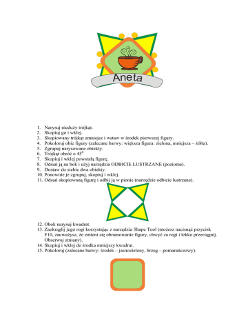 Aneta 1. Narysuj nieduży trójkąt. 2. Skopiuj go i wklej. 3. Skopiowany trójkąt zmniejsz i wstaw w środek pierwszej figury. 4. Pokoloruj obie figury (zalecane barwy: większa figura: zielona, mniejsza – żółta). 5. Zgrupuj narysowane obiekty. 6. Trójkąt obróć o 450 7. Skopiuj i wklej powstałą figurę. 8. Odsuń ją na bok i użyj narzędzia ODBICIE LUSTRZANE (poziome). 9. Dostaw do siebie dwa obiekty. 10. Ponownie je zgrupuj, skopiuj i wklej. 11. Odsuń skopiowaną figurę i odbij ją w pionie (narzędzie odbicie lustrzane). 12. Obok narysuj kwadrat. 13. Zaokrąglij jego rogi korzystając z narzędzia Shape Tool (możesz nacisnąć przycisk F10, zauważysz, że zmieni się obramowanie figury, chwyć za rogi i lekko przeciągnij. Obserwuj zmiany). 14. Skopiuj i wklej do środka mniejszy kwadrat. 15. Pokoloruj (zalecane barwy: środek – jasnozielony, brzeg – pomarańczowy). 16. Zgrupuj powstałe obiekty. 17. Przenieś kwadrat na środek trójkątów. 18. Obróć go i ewentualnie przeskaluj (czyli dostosuj jego wielkość). 19. Narysuj niewielki okrąg. Pokoloruj go (zalecany kolor – żółty). 20. Skopiuj stworzony okrąg i umieść go w pobliżu rogów kwadratu. 21. Wstawiamy rysunek w środek naszego logo. W tym celu wybieramy z paska menu: File\Import\Dysk lokalny\Program Files\Corel\ CorelDRAW Graphics Suite 13\ Languages\EN\ Tutorials\ Sample Files\cup.cdr. Klikamy Import 22. Wskazujemy pozycję, w której chcemy wstawić grafikę,w tym przypadku to środek kwadratu. (Klikamy lewy przycisk myszy i przeciągamy.) 23. Wkleimy baner, na którym napiszemy swoje imię. W tym celu wybieramy z paska menu: File\Import\Dysk lokalny\Program Files\Corel\ CorelDRAW Graphics Suite 13\ Languages\EN\ Tutorials\ Sample Files\banner.cdr. Importujemy go do naszego obrazka, wskazujemy miejsce. Zastosujemy odbicie lustrzane w pionie. Przenosimy baner na nasz obraz. Tworzymy tekst do logo W tym celu: Rysujemy elipsę Naciskamy narzędzie tekstu Gdy narzędzie tekstu jest zaznaczone z paska menu wybieramy: Tekst\Fit text to Path i piszemy imię. Aneta Aby zlikwidować elipsę, zaznaczamy elipsę, na pasku narzędzi trzecie narzędzie od dołu jest Outline Tool (narzędzie do krawędzi). Rozwijamy je i wybieramy No Outline (bez linii). Przeciągamy nasze imię na logo. BANER JEST GOTOWY. Aneta Zadanie 2 Na podstawie wzoru stwórz reklamę kawiarni.