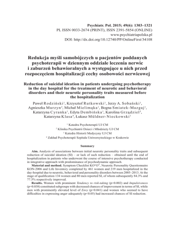 Psychiatr. Pol. 2015; 49(6): 1303–1321 PL ISSN 0033-2674 (PRINT), ISSN 2391-5854 (ONLINE) www.psychiatriapolska.pl DOI: http://dx.doi.org/10.12740/PP/OnlineFirst/34108 Redukcja myśli samobójczych u pacjentów poddanych psychoterapii w dziennym oddziale leczenia nerwic i zaburzeń behawioralnych a występujące u nich przed rozpoczęciem hospitalizacji cechy osobowości nerwicowej Reduction of suicidal ideation in patients undergoing psychotherapy in the day hospital for the treatment of neurotic and behavioral disorders and their neurotic personality traits measured before the hospitalization Paweł Rodz iński 1, Krzysztof Rutko w s k i 1, Jerzy A. S o b ań s k i 1, Agnieszka Murzyn 2, Michał M ielimąk a 1, Bogna S m i at ek -M azg aj 1, Katarzyna Cyrank a 1, Edyta Dembiń s k a 1, Karolina Gr ząd ziel 3, Katarzyna Klas a 4, Łukasz Mül d n er-Ni eck o ws k i 1 Katedra Psychoterapii UJ CM Klinika Psychiatrii Dzieci i Młodzieży UJ CM 3 Katedra Historii Medycyny UJ CM 4 Zakład Psychoterapii Szpitala Uniwersyteckiego w Krakowie 1 2 Summary Aim. Analysis of associations between initial neurotic personality traits and subsequent reduction of suicidal ideation (SI) – or lack of such reduction – obtained until the end of hospitalization in patients who underwent the course of intensive psychotherapy conducted in integrative approach with predominance of psychodynamic approach. Material and method. Symptom Checklist KO“O”, Neurotic Personality Questionnaire KON-2006 and Life Inventory completed by 461 women and 219 men hospitalized in the day-hospital due to neurotic, behavioral and personality disorders between 2005–2013. At the stage of qualification 134 women and 80 men reported SI, of whom subsequently 84.3% and 77.5% respectively improved. Results. Women with prominent Tendency to risk-taking (p=0.002) and Impulsiveness (p=0.038) constituted subgroups with decreased chances of improvement in terms of SI, while men with prominently elevated level of Envy (p=0.041) and women who seemed to have difficulties in expressing anger adequately (p<0.05) had increased chances of SI reduction. 1304 Paweł Rodziński i wsp. Conclusions. Initially prominent Tendency to risk-taking and Impulsiveness may coexist with SI of increased resistance to psychotherapy. Thus, those subgroups require special attention and diligent selection of therapeutic methods. Also, it is probable that focusing therapy at the above-mentioned personality components may increase effectiveness of SI treatment. Reducing SI during psychotherapy appears to be highly effective especially in women with difficulties in expressing anger adequately and in men with prominently elevated level of Envy, which suggests adequacy of this treatment choice and of targeting those difficulties during psychotherapy. Słowa klucze: myśli samobójcze, osobowość nerwicowa, psychoterapia Key words: suicidal ideations, neurotic personality, psychotherapy Wstęp Myśli samobójcze (MS) są częstym objawem napotykanym przez terapeutów u pacjentów z zaburzeniami nerwicowymi, behawioralnymi i zaburzeniami osobowości. Są one obecne u około jednej trzeciej pacjentów z tego rodzaju zaburzeniami kierowanych do leczenia w dziennym oddziale psychoterapeutycznym [1, 2]. Ich występowanie wiąże się z różnorodnymi, problematycznymi sytuacjami niosącymi zagrożenie dla zdrowia i życia pacjentów. Nierzadko w praktyce klinicznej przebieg terapii wymienionych pacjentów z MS komplikowany jest autoagresywnymi zachowaniami, takimi jak samouszkodzenia, prowokowanie sytuacji ryzykownych dla ich zdrowia [3, 4], nadużywanie substancji psychoaktywnych [5], zaniedbywanie leczenia poważnych chorób somatycznych, a także podejmowanie prób samobójczych [6, 7]. Ich terapii często towarzyszą również akty agresji, naruszania zasad obowiązujących w placówkach leczniczych i tendencje do zrywania kontaktu z terapeutami, typowe dla pacjentów z poważnymi zaburzeniami osobowości (takimi jak np. osobowość impulsywna, z pogranicza, dyssocjalna, narcystyczna) [8]. Etiologia MS oraz powiązanych z nimi problemów nie jest całkowicie klarowna. W przypadku MS z pewnością mamy do czynienia ze złożonym objawem o zróżnicowanej intensywności, przybierającym różne formy oraz posiadającym wielopłaszczyznowe biopsychospołeczne pochodzenie. Część czynników, którym przypisuje się udział w etiopatogenezie MS, pokrywa się z dobrze znanymi każdemu klinicyście czynnikami ryzyka samobójczego. Warto wymienić te spośród nich, które w ostatnich latach budziły szczególne zainteresowanie badaczy. Stwierdzono obecność biologicznych i genetycznych czynników ryzyka wystąpienia MS, takich jak polimorfizm genu kodującego transporter serotoniny (5-HTTLPR) [9] oraz wysoki stopień metylacji promotora genu kodującego neurotropowy czynnik pochodzenia mózgowego [10, 11]. Ponadto potwierdzono, że traumatyczne wydarzenia z okresu dzieciństwa, takie jak wykorzystywanie seksualne i maltretowanie, predysponują do wystąpienia MS, jak również prób samobójczych i samouszkodzeń [12]. Także badania nad zespołem stresu pourazowego potwierdziły istnienie związku pomiędzy traumatycznymi doświadczeniami a późniejszym ryzykiem samobójczym [13, 14]. Pośród wielu opisywanych w literaturze medycznej determinantów występowania MS praktyka psychoterapeutyczna bez wątpienia skłania do zwrócenia uwagi na Redukcja myśli samobójczych u pacjentów poddanych psychoterapii 1305 czynniki osobowościowe. Swoją złożonością nie ustępują one czynnikom biologicznym czy środowiskowym. Jak wskazuje wielu badaczy, do zaburzeń osobowości, w przebiegu których najczęściej spotykane są MS, należy osobowość typu borderline [8, 15]. Obserwacje te wydają się współbrzmieć z badaniami, według których takie cechy jak wysoka skłonność do niepokoju oraz impulsywność mogą stanowić istotny czynnik ryzyka MS [16]. Wykazano r
