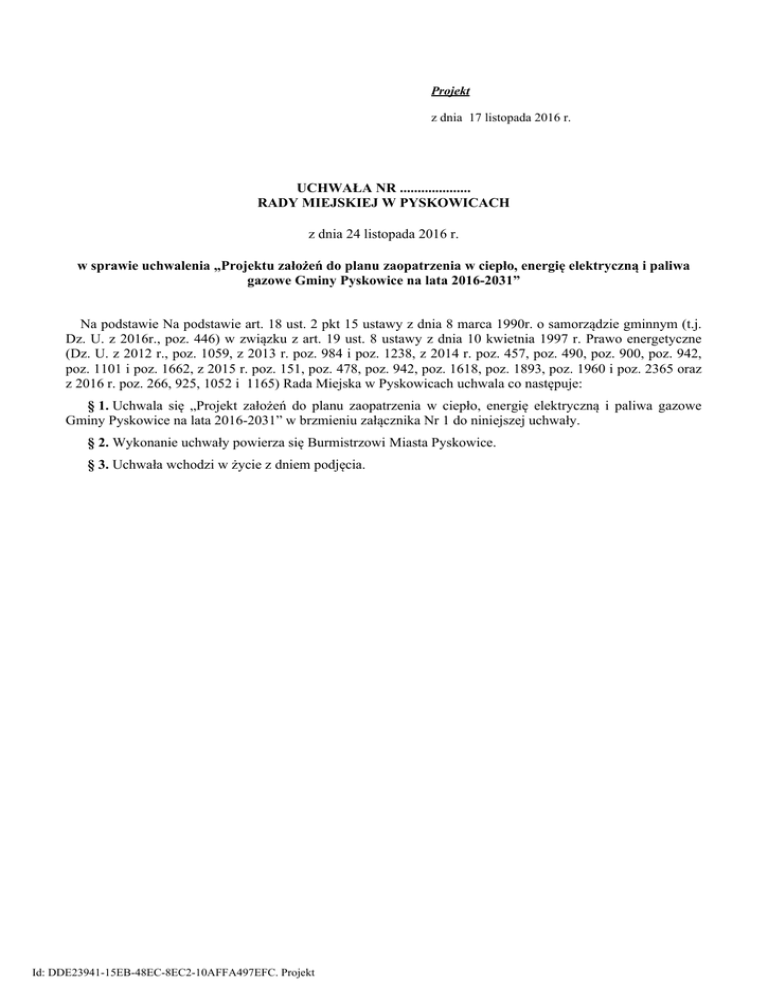 Projekt z dnia 17 listopada 2016 r. UCHWAŁA NR .................... RADY MIEJSKIEJ W PYSKOWICACH z dnia 24 listopada 2016 r. w sprawie uchwalenia „Projektu założeń do planu zaopatrzenia w ciepło, energię elektryczną i paliwa gazowe Gminy Pyskowice na lata 2016-2031” Na podstawie Na podstawie art. 18 ust. 2 pkt 15 ustawy z dnia 8 marca 1990r. o samorządzie gminnym (t.j. Dz. U. z 2016r., poz. 446) w związku z art. 19 ust. 8 ustawy z dnia 10 kwietnia 1997 r. Prawo energetyczne (Dz. U. z 2012 r., poz. 1059, z 2013 r. poz. 984 i poz. 1238, z 2014 r. poz. 457, poz. 490, poz. 900, poz. 942, poz. 1101 i poz. 1662, z 2015 r. poz. 151, poz. 478, poz. 942, poz. 1618, poz. 1893, poz. 1960 i poz. 2365 oraz z 2016 r. poz. 266, 925, 1052 i 1165) Rada Miejska w Pyskowicach uchwala co następuje: § 1. Uchwala się „Projekt założeń do planu zaopatrzenia w ciepło, energię elektryczną i paliwa gazowe Gminy Pyskowice na lata 2016-2031” w brzmieniu załącznika Nr 1 do niniejszej uchwały. § 2. Wykonanie uchwały powierza się Burmistrzowi Miasta Pyskowice. § 3. Uchwała wchodzi w życie z dniem podjęcia. Id: DDE23941-15EB-48EC-8EC2-10AFFA497EFC. Projekt Załącznik Nr 1 do Uchwały Nr .................... Rady Miejskiej w Pyskowicach z dnia 24 listopada 2016 r. ECOEN CONSULT Sp. z o.o. ul. Centralna 5 42-625 Pyrzowice Inwestor: Gmina Pyskowice ul. Strzelców Bytomskich 3 44-120 Pyskowice Temat opracowania: PROJEKT ZAŁOŻEŃ DO PLANU ZAOPTRZENIA W CIEPŁO, ENERGIĘ ELEKTRYCZNA I PALIWA GAZOWE GMINY PYSKOWICE NA LATA 2016-2031 Zespół autorski: Mateusz Jaruszowiec Justyna Zastrzeżyńska WRZESIEŃ 2016 0 Id: DDE23941-15EB-48EC-8EC2-10AFFA497EFC. Projekt Spis treści 1 ZADANIA WŁASNE GMINY W ZAKRESIE ZARZĄDZANIA ENERGIĄ ......................... 5 1.1 Krajowa polityka energetyczna ............................................................................. 9 1.2 Regionalna polityka energetyczna ....................................................................... 13 2 CEL I ZAKRS OPRACOWANIA ............................................................................................ 15 3 OGÓLNA CHARAKTERYSTYKA GMINY.......................................................................... 17 4 GOSPODARKA CIEPLNA ..................................................................................................... 24 5 6 4.1 Bilans potrzeb cieplnych - stan istniejący ........................................................... 24 4.2 Prognoza zapotrzebowania na ciepło .................................................................. 30 4.3 Zapotrzebowanie na ciepło - przewidywane zmiany ........................................... 35 4.4 Ocena stanu zaopatrzenia w ciepło ...................................................................... 38 STAN ZAOPATRZENIA GMINY W GAZ ............................................................................ 40 5.1 Prognoza zapotrzebowania na gaz ....................................................................... 46 5.2 System gazowniczy – przewidywane zmiany ..................................................... 48 5.3 Ocena stanu zaopatrzenia w paliwa gazowe ........................................................ 49 STAN ZAOPATRZENIA GMINY W ENERGIĘ ELEKTRYCZNĄ ..................................... 50 6.1 Zapotrzebowanie na energię elektryczną - stan istniejący .................................. 50 Za rok 2015 wskaźniki jakościowe wynoszą: ................................................................. 59 Objaśnienia: .................................................................................................................... 59 6.2 Oświetlenie uliczne ............................................................................................. 60 6.3 Prognoza zapotrzebowania na energię elektryczną ............................................. 61 6.4 System elektroenergetyczny – przewidywane zmiany ........................................ 62 6.5 Zapotrzebowanie na energię elektryczną terenów rozwojowych ........................ 63 7 PRZEDSIĘWZIĘCIA RACJONALIZUJĄCE UŻYTKOWANIE CIEPŁA, ENERGII ELEKTRYCZNEJ I PALIW GAZOWYCH ................................................................................... 66 8 MOŻLIWOŚĆ WYKORZYSTANIA ISTNIEJĄCYCH NADWYŻEK I LOKALNYCH ZASOBÓW PALIW ORAZ ENERGII ZE ŹRÓDEŁ ODNAWIALNYCH ................................... 82 8.1 Gospodarka cieplna ............................................................................................. 82 8.2 Gospodarka elektroenergetyczna ......................................................................... 82 8.3 Gospodarka paliw gazowych ............................................................................... 83 8.4 Odnawialne źródła energii................................................................................... 83 8.4.1 Energia słoneczna ......................................................................................................... 84 8.4.2 Energia wodna .............................................................................................................. 86 1 Id: DDE23941-15EB-48EC-8EC2-10AFFA497EFC. Projekt 9 8.4.3 Energia wiatru .............................................................................................................. 88 8.4.4 Energia geotermalna ..................................................................................................... 89 8.4.5 Pompy ciepła ................................................................................................................ 91 8.4.6 Biomasa ........................................................................................................................ 96 8.4.7 Biopaliwa stałe ............................................................................................................. 97 8.4.8 Biopaliwa płynne ...............................................................................