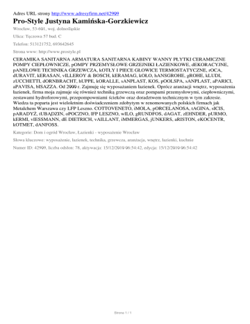Adres URL strony http://www.adresyfirm.net/42909 Pro-Style Justyna Kamińska-Gorzkiewicz Wrocław, 53-601, woj. dolnośląskie Ulica: Tęczowa 57 bud. C Telefon: 513121752, 693642645 Strona www: http://www.prostyle.pl CERAMIKA SANITARNA ARMATURA SANITARNA KABINY WANNY PŁYTKI CERAMICZNE POMPY CIEPŁOWNICZE, pOMPY PRZEMYSŁOWE GRZEJNIKI ŁAZIENKOWE, dEKORACYJNE, pANELOWE TECHNIKA GRZEWCZA, kOTŁY I PIECE GŁOWICE TERMOSTATYCZNE, rOCA, dURAVIT, kERASAN, vILLEROY & BOSCH, kERAMAG, kOŁO, hANSGROHE, gROHE, kLUDI, zUCCHETTI, dORNBRACHT, hUPPE, kORALLE, sANPLAST, KOS, pOOLSPA, sANPLAST, aPARICI, aPAVISA, bISAZZA. Od 2000 r. Zajmuję się wyposażaniem łazienek. Oprócz aranżacji wnętrz, wyposażenia łazienek, firma moja zajmuje się również techniką grzewczą oraz pompami przemysłowymi, ciepłowniczymi, zestawami hydroforowymi, przepompowniami ścieków oraz doradztwem technicznym w tym zakresie. Wiedza ta poparta jest wieloletnim doświadczeniem zdobytym w renomowanych polskich firmach jak Metalchem Warszawa czy LFP Leszno. COTTOVENETO, iMOLA, pORCELANOSA, tAGINA, sICIS, pARADYŻ, tUBĄDZIN, oPOCZNO, lFP LESZNO, wILO, gRUNDFOS, dAGAT, zEHNDER, pURMO, kERMI, vIESSMANN, dE DIETRICH, vAILLANT, iMMERGAS, jUNKERS, aRISTON, eKOCENTR, kOTMET, dANFOSS. Kategorie: Dom i ogród Wrocław, Łazienki - wyposażenie Wrocław Słowa kluczowe: wyposażenie, łazienek, technika, grzewcza, aranżacja, wnętrz, łazienki, kuchnie Numer ID: 42909, liczba odsłon: 78, aktywacja: 15/12/2010 06:54:42, edycja: 15/12/2010 06:54:42 Strona 1 / 1