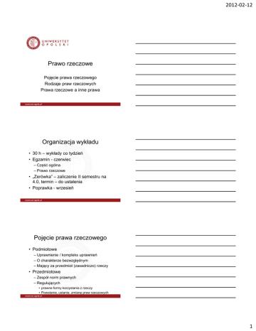 2012-02-12 Prawo rzeczowe Pojęcie prawa rzeczowego Rodzaje praw rzeczowych Prawa rzeczowe a inne prawa Organizacja wykładu • 30 h – wykłady co tydzień • Egzamin - czerwiec – Część ogólna – Prawo rzeczowe • „Zerówka” – zaliczenie II semestru na 4.0, termin – do ustalenia • Poprawka - wrzesień Pojęcie prawa rzeczowego • Podmiotowe – Uprawnienie / kompleks uprawnień – O charakterze bezwzględnym – Mający za przedmiot (zasadniczo) rzeczy • Przedmiotowe – Zespół norm prawnych – Regulujących • prawne formy korzystania z rzeczy • Powstanie, ustanie, zmianę praw rzeczowych 1 2012-02-12 Rola praw rzeczowych • Emanacja konstytucyjnej zasady własności prywatnej jako podstawy gospodarki wolnorynkowej • Reguluje – Przyporządkowanie poszczególnych dóbr – Granice korzystania ze składników majątkowych – Odpowiedzialność majątkową • Czy najważniejszy składnik majątku? Przedmiot praw rzeczowych • Rzecz – Przedmiot materialny (część przyrody) – Mający charakter samoistny (może stanowić samoistny przedmiot obrotu) – Nie zdereifikowany • Prawa – Nie są rzeczami – Niektóre mogą być przedmiotem ograniczonych praw rzeczowych Klasyfikacja rzeczy • • • • • Ruchomości i nieruchomości Rzeczy istniejące i przyszłe Rzeczy proste i złożone Rzeczy w obrocie i wyłączone z obrotu Rzeczy podlegające szczególnemu rezymowi • Oznaczone co do tożsamości i gatunku 2 2012-02-12 Nieruchomości i ruchomości • Nieruchomość – Część powierzchni ziemskiej (grunt) – Z mocy przepisów szczególnych: • Budynek trwale z gruntem związany • Część budynku stanowią nieruchomości odrębne od gruntu • Ruchomość – Rzecz, która nie jest nieruchomością Rzeczy proste i złożone • Rzecz prosta – Jednorodna – Bez części składowych • Rzecz złożona – Składa się z wielu rzeczy – Są części składowe • Problem przynależności Rzeczy w obrocie i wyłączone z obrotu • Rzecz w obrocie – Może być przedmiotem obrotu – Zdecydowana większość rzeczy • Rzecz wyłączona z obrotu – Nie może być przedmiotem obrotu – O wyłączeniu decyduje ustawa • Zabytki archeologiczne • Narządy do przeszczepów 3 2012-02-12 Rzeczy podlegające szczególnemu reżymowi • Lasy – Państwowe i prywatne – Zarząd PGL Lasy Państwowe • Zabytki – Ograniczenia prawa własności – Ograniczenia obrotu • Statki: szczególna reg Rzeczy oznaczone co do tożsamości i gatunku • Rzecz oznaczona co do tożsamości – Unikatowa – Zindywidualizowana w obrocie • Rzecz oznaczona co do gatunku – Jedna z wielu takich samych – Brak indywidualizacji • Klasyfikacja zależy od okoliczności • Podział ma znaczenie praktyczne Przedmioty praw podobnych do własności • • • • • Zwierzęta Wody Kopaliny (złoża) Energia Dobra niematerialne o charakterze intelektualnym • Pieniądze 4 2012-02-12 Masy majątkowe • Universitas rerum nie jest przedmiotem praw • Problem majątków odrębnych • Przedsiębiorstwo – Zbiór składników – Służących do prowadzenia działalności gospodarczej • Gospodarstwo rolne – podobnie Przedsiębiorstwo - cd • Pojęcie niejednoznaczne • Znaczenia – Przedmiotowe – Funkcjonalne – Podmiotowe • Problem charakteru prawnego – Zbiór rzeczy i praw – Prawo na dobru niematerialnym (klienteli) Podmiotowe prawa rzeczowe • Czy istnieje stosunek prawny prawa rzeczowego? • Koncepcje – Obligacja generalna – Stosunek wielostronny między podmiotami obciążonymi obowiązkami odpowiadającymi prawu rzeczowemu 5 2012-02-12 Krytyka • Konstrukcja sztuczna • Obejmuje osoby nie mające ze sobą kontaktu de facto ani de iure • „wypaczone odbicie faktu, że pewne normy prawne nakładają na ogół powszechne obowiązki” (Dybowski) • Stosunek prawny = norma nakłada obowiązki /prawa na oznaczone osoby Cechy konstrukcyjne praw rzeczowych • Prawa podmiotowe o charakterze bezwzględnym skuteczne względem – Podmiotu zakłócającego korzystanie – Innego prawa w trakcie jego wykonywania – Nabywcy rzeczy • Wyodrębnione w drodze ustawy • Mają charakter majątkowy • Są jawne Prawa rzeczowe jako prawa podmiotowe • Bezterminowe (własność) / terminowe (użytkowanie) • Wolne (własność) / związane (służebność gruntowa) • Samoistne / niesamoistne (zastaw, hipoteka) • Zbywalne / niezbywalne (użytkowanie, służebność osobista) 6 2012-02-12 Klasyfikacja praw rzeczowych • Własność • Użytkowanie wieczyste • Ograniczone prawa rzeczowe – Kodeksowe – pozakodeksowe • Numerus clausus praw rzeczowych 7