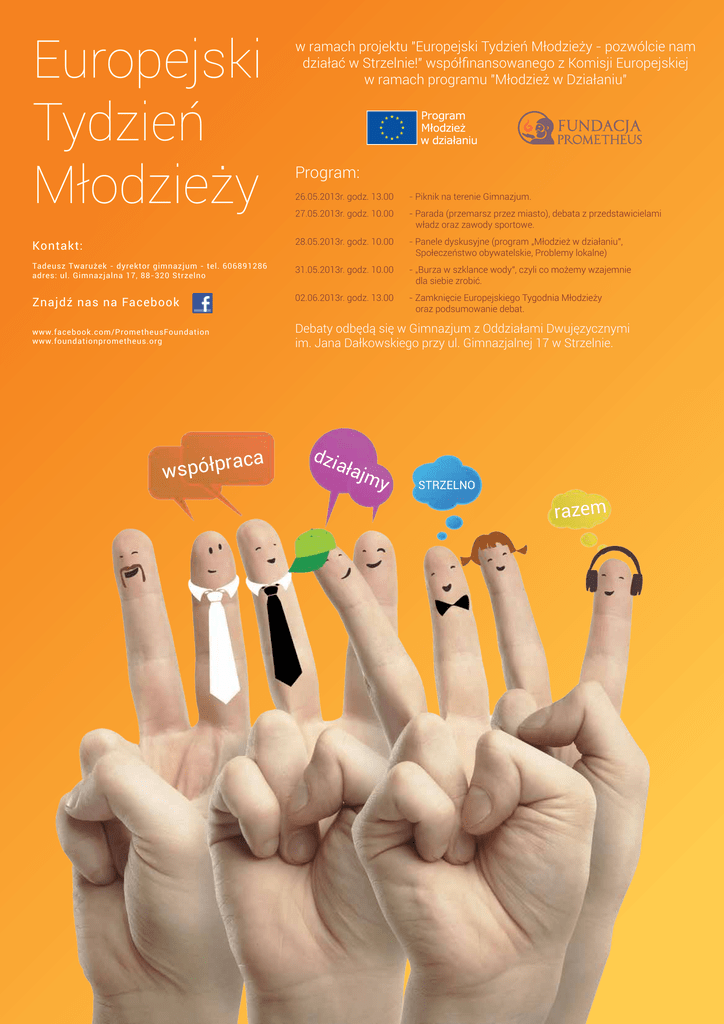 Europejski Tydzień Młodzieży w ramach projektu "Europejski Tydzień Młodzieży - pozwólcie nam działać w Strzelnie!" współfinansowanego z Komisji Europejskiej w ramach programu "Młodzież w Działaniu" Program: 26.05.2013r. godz. 13.00 - Piknik na terenie Gimnazjum. 27.05.2013r. godz. 10.00 - Parada (przemarsz przez miasto), debata z przedstawicielami władz oraz zawody sportowe. Kontakt: 28.05.2013r. godz. 10.00 - Panele dyskusyjne (program „Młodzież w działaniu”, Społeczeństwo obywatelskie, Problemy lokalne) Tadeusz Twarużek - dyrektor gimnazjum - tel. 606891286 adres: ul. Gimnazjalna 17, 88-320 Strzelno 31.05.2013r. godz. 10.00 - „Burza w szklance wody”, czyli co możemy wzajemnie dla siebie zrobić. Znajdź nas na Facebook 02.06.2013r. godz. 13.00 - Zamknięcie Europejskiego Tygodnia Młodzieży oraz podsumowanie debat. www.facebook.com/PrometheusFoundation www.foundationprometheus.org aca r p ł ó p s w Debaty odbędą się w Gimnazjum z Oddziałami Dwujęzycznymi im. Jana Dałkowskiego przy ul. Gimnazjalnej 17 w Strzelnie. dzi ała jmy STRZELNO razem