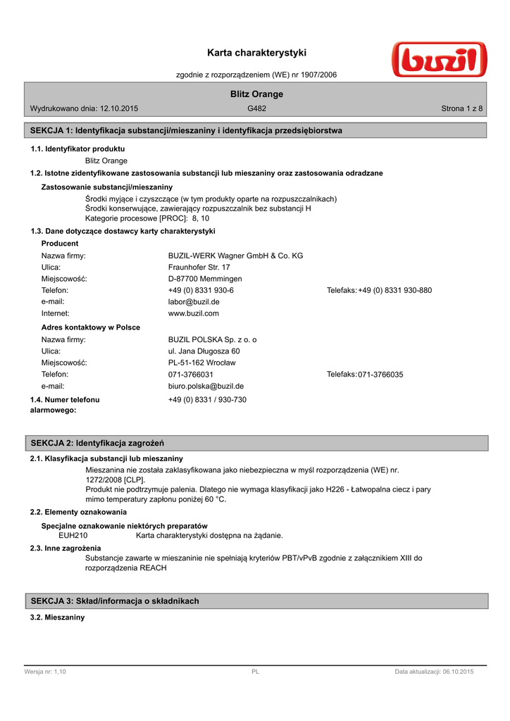 Karta charakterystyki zgodnie z rozporządzeniem (WE) nr 1907/2006 Blitz Orange Wydrukowano dnia: 12.10.2015 Strona 1 z 8 G482 SEKCJA 1: Identyfikacja substancji/mieszaniny i identyfikacja przedsiębiorstwa 1.1. Identyfikator produktu Blitz Orange 1.2. Istotne zidentyfikowane zastosowania substancji lub mieszaniny oraz zastosowania odradzane Zastosowanie substancji/mieszaniny Środki myjące i czyszczące (w tym produkty oparte na rozpuszczalnikach) Środki konserwujące, zawierający rozpuszczalnik bez substancji H Kategorie procesowe [PROC]: 8, 10 1.3. Dane dotyczące dostawcy karty charakterystyki Producent Nazwa firmy: Ulica: Miejscowość: Telefon: e-mail: BUZIL-WERK Wagner GmbH & Co. KG Fraunhofer Str. 17 D-87700 Memmingen +49 (0) 8331 930-6 [email protected] Internet: www.buzil.com Telefaks: +49 (0) 8331 930-880 Adres kontaktowy w Polsce Nazwa firmy: Ulica: BUZIL POLSKA Sp. z o. o ul. Jana Długosza 60 Miejscowość: PL-51-162 Wrocław Telefon: 071-3766031 e-mail: [email protected] 1.4. Numer telefonu alarmowego: Telefaks: 071-3766035 +49 (0) 8331 / 930-730 SEKCJA 2: Identyfikacja zagrożeń 2.1. Klasyfikacja substancji lub mieszaniny Mieszanina nie została zaklasyfikowana jako niebezpieczna w myśl rozporządzenia (WE) nr. 1272/2008 [CLP]. Produkt nie podtrzymuje palenia. Dlatego nie wymaga klasyfikacji jako H226 - Łatwopalna ciecz i pary mimo temperatury zapłonu poniżej 60 °C. 2.2. Elementy oznakowania Specjalne oznakowanie niektórych preparatów EUH210 Karta charakterystyki dostępna na żądanie. 2.3. Inne zagrożenia Substancje zawarte w mieszaninie nie spełniają kryteriów PBT/vPvB zgodnie z załącznikiem XIII do rozporządzenia REACH SEKCJA 3: Skład/informacja o składnikach 3.2. Mieszaniny Wersja nr: 1,10 PL Data aktualizacji: 06.10.2015 Karta charakterystyki zgodnie z rozporządzeniem (WE) nr 1907/2006 Blitz Orange Wydrukowano dnia: 12.10.2015 Strona 2 z 8 G482 Składniki niebezpieczne Nr CAS Nazwa chemiczna Nr WE Ilość Nr Index Nr REACH Klasyfikacja zgodnie z rozporządzeniem (WE) nr 1272/2008 [CLP] 64-17-5 etanol; alkohol etylowy 200-578-6 10 - < 15 % 603-002-00-5 01-2119457610-43 Flam. Liq. 2, Eye Irrit. 2; H225 H319 26183-52-8 etoksylowany alkohol tłuszczowy 1-<5% Acute Tox. 4, Eye Irrit. 2; H302 H319 Wydźwięk zwroty H i EUH: patrz sekcja 16. Oznakowanie dotyczące zawartości zgodnie z rozporządzeniem (WE) nr 648/2004 < 5 % niejonowe środki powierzchniowo czynne, kompozycje zapachowe (Limonene, Citral, Hexyl cinnamal, Linalool). SEKCJA 4: Środki pierwszej pomocy 4.1. Opis środków pierwszej pomocy W przypadku wdychania Należy zadbać o należytą wentylację. W przypadku kontaktu ze skórą Zanieczyszczoną skórę natychmiast przemyć dużą ilością woda i mydło. Zanieczyszczoną odzież zdjąć i wyprać przed ponownym użyciem. W przypadku kontaktu z oczami Należy natychmiast ostrożnie, ale gruntownie przepłukać oczy zalecanymi preparatami lub wodą. W przypadku połknięcia Natychmiast przepłukać jamę ustną i obficie popić wodą. NIE wywoływać wymiotów. 4.2. Najważniejsze ostre i opóźnione objawy oraz skutki narażenia Nie istnieją żadne informacje. 4.3. Wskazania dotyczące wszelkiej natychmiastowej pomocy lekarskiej i szczególnego postępowania z poszkodowanym Badanie symptomatyczne. SEKCJA 5: Postępowanie w przypadku pożaru 5.1. Środki gaśnicze Odpowiednie środki gaśnicze Strumień wody piana na bazie alkoholi Dwutlenek węgla Suchy środek gaśniczy Niewłaściwe środki gaśnicze Pełny strumień wody 5.2. Szczególne zagrożenia związane z substancją lub mieszaniną Niebezpieczne produkty spalania: Dwutlenek węgla Wersja nr: 1,10 PL Data aktualizacji: 06.10.2015 Karta charakterystyki zgodnie z rozporządzeniem (WE) nr 1907/2006 Blitz Orange Wydrukowano dnia: 12.10.2015 Strona 3 z 8 G482 Tlenek węgla. 5.3. Informacje dla straży pożarnej Środki gaśnicze należy dostosować do otoczenia. Informacja uzupełniająca Zanieczyszczoną wodę zbierać osobno. Nie powinna się ona dostać do kanalizacji lub zbiorników wodnych. SEKCJA 6: Postępowanie w przypadku niezamierzonego uwolnienia do środowiska 6.1. Indywidualne środki ostrożności, wyposażenie ochronne i procedury w sytuacjach awaryjnych Używać osobistego wyposażenia ochronnego (patrz sekcja 8). Unikać kontaktu ze skórą, oczami i odzieżą. 6.2. Środki ostrożności w zakresie ochrony środowiska Nie odprowadzać do kanalizacji i zbiorników wodnych. Nie dopuścić do przedostania się do gruntu/gleby. 6.3. Metody i materiały zapobiegające rozprzestrzenianiu się skażenia i służące do usuwania skażenia Należy zebrać przy pomocy materiałów wiążących płyny (piasek, ziemia okrzemkowa, uniwersalny środek wiążący). Zebrany materiał traktować zgodnie z ustępem usunięcie. 6.4. Odniesienia do innych sekcji Środki ochrony indywidualnej: patrz Dział 8 Usunięcie odpadów: patrz Dział 13 SEKCJA 7: Postępowanie z substancjami i mieszaninami oraz ich magazynowanie 7.1. Środki ostrożności dotyczące bezpiecznego postępowania Wskazówki odnośnie bezpiecznego obchodzenia się z substancją Unikać kontaktu ze skórą, oczami i odzieżą. Nie mieszać z inne chemikalia. Używać osobistego wyposażenia ochronnego (patrz sekcja 8). Nie jeść i nie pić oraz nie palić tytoniu podczas stosowania produktu. Nie wdychać gazu/dymu/pary/rozpylonej cieczy. Stosować wyłącznie w dobrze wentylowanych pomieszczeniach. Wskazówki na wypadek pożaru i wybuchu Nie są wymagane żadne dodatkowe urządzenia. 7.2. Warunki bezpiecznego magazynowania, łącznie z informacjami dotyczącymi wszelkich wzajemnych niezgodności Wymagania względem pomieszczeń i pojemników magazynowych Przechowywać pojemnik szczelnie zamknięty. Wskazówki dotyczące wspólnego magazynowania Nie są wymagane żadne dodatkowe środki ostrożności. 7.3. Szczególne zastosowanie(-a) końcowe SEKCJA 8: Kontrola narażenia/środki ochrony indywidualnej 8.1. Parametr