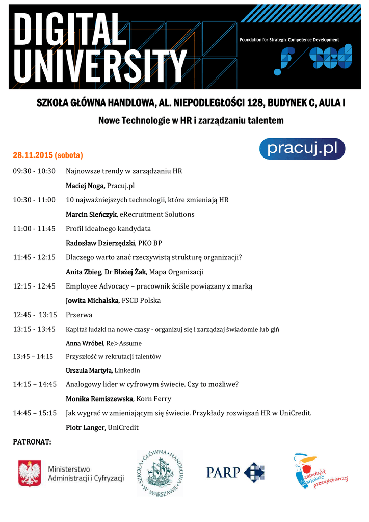 SZKOŁA GŁÓWNA HANDLOWA, AL. NIEPODLEGŁOŚCI 128, BUDYNEK C, AULA I Nowe Technologie w HR i zarządzaniu talentem 28.11.2015 (sobota) 09:30 - 10:30 Najnowsze trendy w zarządzaniu HR Maciej Noga, Pracuj.pl 10:30 - 11:00 10 najważniejszych technologii, które zmieniają HR Marcin Sieńczyk, Sieńczyk eRecruitment Solutions 11:00 - 11:45 Profil idealnego kandydata Radosław Dzierzędzki Dzierzędzki, dzki PKO BP 11:45 - 12:15 Dlaczego warto znać rzeczywistą strukturę organizacji? Anita Zbieg, Zbieg Dr Błażej Żak, Żak Mapa Organizacji 12:15 - 12:45 Employee Advocacy – pracownik ściśle powiązany z marką Jowita Michalska, Michalska FSCD Polska 12:45 - 13:15 Przerwa 13:15 - 13:45 Kapitał ludzki na nowe czasy - organizuj się i zarządzaj świadomie lub giń Anna Wróbel, Wróbel Re>Assume 13:45 – 14:15 Przyszłość w rekrutacji talentów Urszula Martyła Martyła, Linkedin 14:15 – 14:45 Analogowy lider w cyfrowym świecie. Czy to możliwe? Monika Remiszewska, Remiszewska Korn Ferry 14:45 – 15:15 Jak wygrać w zmieniającym się świecie. Przykłady rozwiązań HR w UniCredit. Piotr Langer, UniCredit PATRONAT: