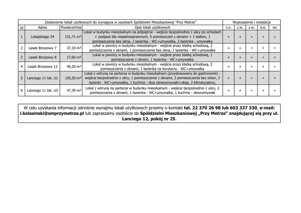 Lp 1 2 3 4 5 6 Zestawienie lokali użytkowych do wynajęcia w zasobach Spółdzielni Mieszkaniowej "Przy Metrze" Adres Powierzchnia Opis lokali użytkowych Lokal w budynku mieszkalnym na półpiętrze - wejście bezpośrednio z ulicy po schodach + podjazd dla niepełnosprawnych, 5 pomieszczeń z oknami + 1 balkon, 1 Lokajskiego 24 131,71 m² pomieszczenie bez okna, 1 łazienka - WC+umywalka, 2 łazienka - umywalka Lokal w piwnicy w budynku mieszkalnym - wejście przez klatkę schodową, 2 Lasek Brzozowy 7 37,10 m² pomieszczenia z oknami, 1 pomieszczenie bez okna, 1 łazienka - WC+umywalka Lokal w piwnicy w budynku mieszkalnym - wejście przez klatkę schodową, 1 Lasek Brzozowy 8 17,60 m² pomieszczenie z oknem, 1 łazienka - WC+umywalka Lokal w piwnicy w budynku mieszkalnym - wejście przez klatkę schodową, 2 Lasek Brzozowy 12 45,20 m² pomieszczenia z oknami, 1 łazienka na korytarzu - WC+umywalka Lokal z witryną na parterze w budynku mieszkalnym (przystosowany do gastronomii) Lanciego 11 lok. U1 105,50 m² wejście bezpośrednio z ulicy, 1 pomieszczenie z oknami, 2 pomieszczenia bez okien, 2 łazienki - WC+umywalka, 1 kuchnia - dwa zlewozmywaki+okap, 2 klimatyzatory, Lanciego 11 lok. U3 47,39 m² Lokal z witryną na parterze w budynku mieszkalnym - wejście bezpośrednio z ulicy, 2 pomieszczenia z oknami, 1 łazienka - WC+umywalka, 1 kuchnia - zlewozmywak Wyposażenie i instalacje c.o. c.w. z.w. e.e. wc + + + + + + + + + + + + + + + + + + + + + + + + + + + + + + W celu uzyskania informacji odnośnie wynajmu lokali użytkowych prosimy o kontakt tel. 22 370 26 98 lub 603 337 330, e-mail: [email protected] lub zapraszamy osobiście do Spółdzielni Mieszkaniowej „Przy Metrze” znajdującej się przy ul. Lanciego 12, pokój nr 25.