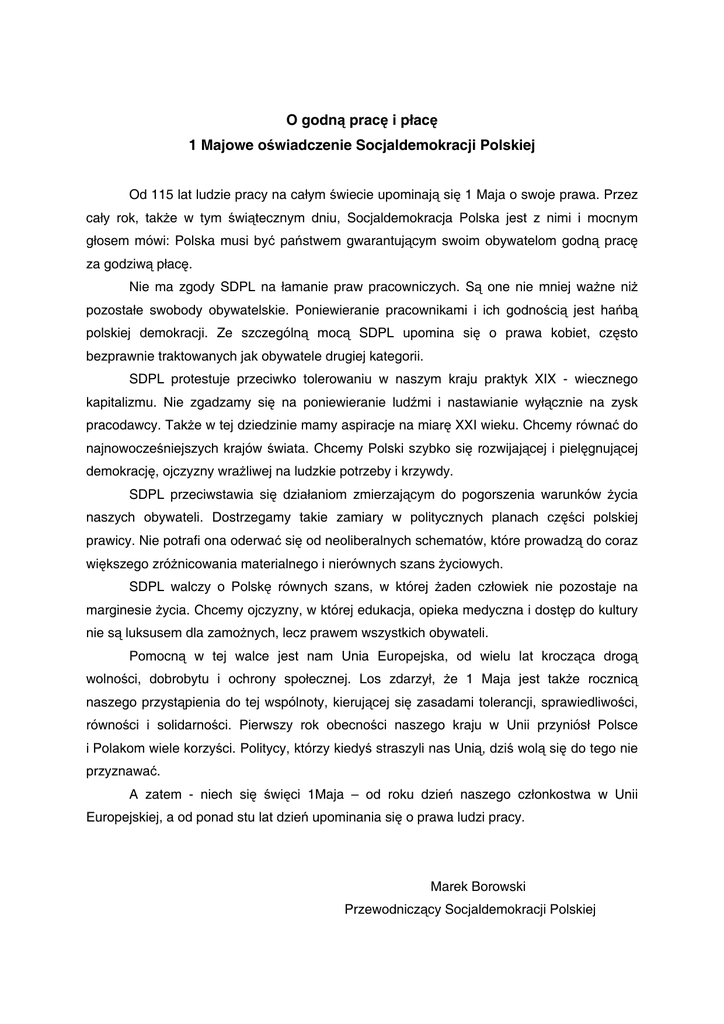 O godną pracę i płacę 1 Majowe oświadczenie Socjaldemokracji Polskiej Od 115 lat ludzie pracy na całym świecie upominają się 1 Maja o swoje prawa. Przez cały rok, także w tym świątecznym dniu, Socjaldemokracja Polska jest z nimi i mocnym głosem mówi: Polska musi być państwem gwarantującym swoim obywatelom godną pracę za godziwą płacę. Nie ma zgody SDPL na łamanie praw pracowniczych. Są one nie mniej ważne niż pozostałe swobody obywatelskie. Poniewieranie pracownikami i ich godnością jest hańbą polskiej demokracji. Ze szczególną mocą SDPL upomina się o prawa kobiet, często bezprawnie traktowanych jak obywatele drugiej kategorii. SDPL protestuje przeciwko tolerowaniu w naszym kraju praktyk XIX - wiecznego kapitalizmu. Nie zgadzamy się na poniewieranie ludźmi i nastawianie wyłącznie na zysk pracodawcy. Także w tej dziedzinie mamy aspiracje na miarę XXI wieku. Chcemy równać do najnowocześniejszych krajów świata. Chcemy Polski szybko się rozwijającej i pielęgnującej demokrację, ojczyzny wrażliwej na ludzkie potrzeby i krzywdy. SDPL przeciwstawia się działaniom zmierzającym do pogorszenia warunków życia naszych obywateli. Dostrzegamy takie zamiary w politycznych planach części polskiej prawicy. Nie potrafi ona oderwać się od neoliberalnych schematów, które prowadzą do coraz większego zróżnicowania materialnego i nierównych szans życiowych. SDPL walczy o Polskę równych szans, w której żaden człowiek nie pozostaje na marginesie życia. Chcemy ojczyzny, w której edukacja, opieka medyczna i dostęp do kultury nie są luksusem dla zamożnych, lecz prawem wszystkich obywateli. Pomocną w tej walce jest nam Unia Europejska, od wielu lat krocząca drogą wolności, dobrobytu i ochrony społecznej. Los zdarzył, że 1 Maja jest także rocznicą naszego przystąpienia do tej wspólnoty, kierującej się zasadami tolerancji, sprawiedliwości, równości i solidarności. Pierwszy rok obecności naszego kraju w Unii przyniósł Polsce i Polakom wiele korzyści. Politycy, którzy kiedyś straszyli nas Unią, dziś wolą się do tego nie przyznawać. A zatem - niech się święci 1Maja – od roku dzień naszego członkostwa w Unii Europejskiej, a od ponad stu lat dzień upominania się o prawa ludzi pracy. Marek Borowski Przewodniczący Socjaldemokracji Polskiej