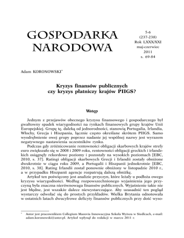 GOSPODARKA NARODOWA 5-6 (237-238) Rok LXXX/XXI maj-czerwiec 2011 s. 69-84 Adam KORONOWSKI* Kryzys finansów publicznych czy kryzys płatniczy krajów PIIGS? Wstęp Jednym z przejawów obecnego kryzysu finansowego i gospodarczego był gwałtowny spadek wiarygodności na rynkach finansowych grupy krajów Unii Europejskiej. Grupę tę, daleką od jednorodności, stanowią Portugalia, Irlandia, Włochy, Grecja i Hiszpania, łącznie często określane skrótem PIIGS. Samo wyodrębnienie owej grupy poprzez nadanie jej wspólnej nazwy jest wyrazem negatywnego nastawienia uczestników rynku. Podczas gdy zróżnicowanie rentowności obligacji skarbowych krajów strefy euro zwiększało się w 2008 i 2009 roku, rentowności obligacji greckich i irlandzkich osiągnęły rekordowe poziomy i pozostały na wysokich poziomach [EBC, 2010, s. 37]. Ratingi obligacji skarbowych Grecji i Irlandii zostały obniżone dwukrotnie w ciągu roku 2009, a Portugalii i Hiszpanii jednokrotnie [EBC, 2010, s. 38]. Rating Irlandii został ponownie obniżony w listopadzie 2010 r., a w przypadku Hiszpanii agencje rozpatrują dalszą obniżkę. Artykuł ten poświęcony jest analizie przyczyn, które leżały u podłoża owego kryzysu wiarygodności. Według rozpowszechnionego wyjaśnienia jego przyczyną była znaczna nierównowaga finansów publicznych. Wyjaśnienie takie nie jest błędne, jest wszakże dalece niewystarczające. Aby uzasadnić ten pogląd wystarczy odwołać się do prostych przykładów. Wielka Brytania odnotowała w ostatnich latach dwucyfrowe deficyty finansów publicznych przy dość wyso- * Autor jest pracownikiem Collegium Mazovia Innowacyjna Szkoła Wyższa w Siedlcach, e-mail: [email protected]. Artykuł wpłynął do redakcji w marcu 2011 r. 70 GOSPODARKA NARODOWA Nr 5-6/2011 kim poziomie długu publicznego. Belgia miała stosunkowo znaczne deficyty przy jednoczesnym długu publicznym bliskim poziomu 100% PKB. Żaden z tych krajów nie doświadczył takiej presji rynkowej, w szczególności wyrażającej się wzrostem rentowności obligacji skarbowych czy obniżeniem ratingów, jak kraje grupy PIIGS, spośród których bynajmniej nie wszystkie miały gorsze wskaźniki sytuacji fiskalnej. Pierwsza część niniejszego artykułu stanowi krótki przegląd przyczyn kryzysu przeprowadzony pod kątem wyjaśnienia jego asymetrycznego oddziaływania na gospodarki poszczególnych krajów Unii Europejskiej. W tej części artykułu przedstawiona jest także sytuacja sektora finansów publicznych wybranych krajów Unii Europejskiej. Chociaż kraje PIIGS odnotowały wysokie deficyty finansów publicznych (z pewnym wyjątkiem Włoch), a także niekiedy cechował je szczególnie wysoki poziom długu publicznego, bynajmniej nie były one odosobnione. Kryzys wiarygodności musi mieć więc jeszcze inny aspekt niezwiązany bezpośrednio z sytuacją finansów publicznych. Druga część artykułu wskazuje – bez umniejszania znaczenia sytuacji fiskalnej – na znaczenie, jakie dla kryzysu wiarygodności miała nierównowaga zewnętrzna. Wysokie deficyty obrotów bieżących odzwierciedlały nie tylko niezbilansowane budżety sektora finansów publicznych, lecz także wydatki sektora prywatnego. Nierównowaga zewnętrzna pozwala lepiej wyjaśnić przesłanki spadku wiarygodności na rynkach finansowych, który – jak powyżej stwierdziłem – nie był prostą funkcją sytuacji fiskalnej. Oznacza to, że kraje PIIGS, a przynajmniej niektóre spośród nich, doświadczyły kryzysu płatniczego, którego przejawy są zaciemnione przez uczestnictwo tych krajów w strefie euro. Posługiwanie się wspólną walutą wyklucza też wykorzystanie zmiany kursu walutowego jako narzędzia pozwalającego bezpośrednio oddziaływać na problemy płatnicze. Pod tym względem kraje PIIGS istotnie różnią się np. od Wielkiej Brytanii, w której przypadku kurs walutowy stanowił ważny mechanizm dostosowawczy w czasie obecnego kryzysu. Trzecia część artykułu poświęcona jest omówieniu polityki gospodarczej w obliczu asymetrycznych skutków kryzysu. Część tę rozpoczyna przedstawienie kosztów fiskalnych kryzysu i wykorzystania ekspansywnej polityki fiskalnej w celu ograniczenia skutków kryzysu. W warunkach wysokich deficytów finansów publicznych i kryzysu wiarygodności prowadzenie antycyklicznej polityki fiskalnej było niemożliwe, konieczna zaś okazała się polityka równoważenia finansów publicznych. Podejmowane w tej mierze działania nie mogą jednak stanowić rozwiązania bieżących problemów krajów doświadczających nierównowagi płatniczej oraz dotkliwych skutków kryzysu gospodarczego. Wobec braku indywidualnej polityki pieniężnej i kursowej kraje te nie dysponują narzędziami pozwalającymi przezwyciężyć trudności, wobec których stanęły. Pozostają zależne od pomocy ze strony Europejskiego Banku Centralnego, Komisji Europejskiej oraz pozostałych państw członkowskich Unii Europejskiej. Adam Koronowski, Kryzys finansów publicznych czy kryzys płatniczy krajów PIIGS? 71 Asymetryczne skutki kryzysu w krajach Unii Europejskiej Przyczyny obecnego kryzysu walutowego, choć złożone, zostały dobrze rozpoznane i obszernie przedstawione w literaturze przedmiotu. Obejmują one m.in. pochopną liberalizację rynków finansowych, słaby nadzór nad instytucjami finansowymi, nieprawidłowe bodźce na szczeblu tych instytucji i błędną politykę pieniężną. Także początki kryzysu w Stanach Zjednoczonych oraz jego rozprzestrzenienie się na kraje europejskie jest przedmiotem wyczerpujących opracowań. W tym miejscu chciałbym ograniczyć się zatem do wskazania czynników, które przesądziły o asymetrycznym oddziaływaniu pierwotnego wstrząsu na rynkach finansowych na rozwój zjawisk kryzysowych w krajach Unii Europejskiej. Poszczególne państwa członkowskie Unii Europejskiej w różnym stopniu doświadczyły skutków kryzysu w kategoriach zmian PKB. Wśród krajów, gdzie spadek