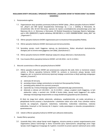 REGULAMIN OFERTY SPECJALNEJ / SPRZEDAŻY PREMIOWEJ „KULINARNE SHOW! W TWOIM DOMU” DLA MARKI GAGGENAU 1. Postanowienia ogólne. 1.1. Organizatorem akcji sprzedaży premiowej Kulinarne SHOW! (dalej: „Oferta specjalna Kulinarne SHOW!” lub „Akcja”) jest BSH Sprzęt Gospodarstwa Domowego Sp. z o.o. z siedzibą w Warszawie, Al. Jerozolimskie 183, 02-222 Warszawa, wpisana do rejestru przedsiębiorców prowadzonego przez Sąd Rejonowy dla m. st. Warszawy w Warszawie, XII Wydział Gospodarczy Krajowego Rejestru Sądowego, pod nr KRS: 0000023973, kapitał zakładowy 300 000 000 zł, nr GIOŚ: E0000887WZBW (dalej „BSH” lub „Organizator”). 1.2. Oferta specjalna Kulinarne SHOW! organizowana jest na terytorium Rzeczpospolitej Polskiej. 1.3. Oferta specjalna Kulinarne SHOW! skierowana jest do konsumentów. 1.4. Sprzedażą sprzętu marki Gaggenau zajmują się dystrybutorzy. Wykaz aktualnych dystrybutorów dostępny jest na stronie www.gaggenau.com (dalej „Dystrybutorzy”). 1.5. Oferta specjalna Kulinarne SHOW! obejmuje wyłącznie zakupy dokonane u Dystrybutorów. 1.6. Czas trwania Oferty specjalnej Kulinarne SHOW!: od 3.02.2016 r. do 31.12.2016 r. 2. Warunki uczestnictwa w Ofercie specjalnej Kulinarne SHOW! 2.1. Oferta specjalna Kulinarne SHOW! jest przeznaczona wyłącznie dla osób, które w momencie wzięcia udziału w Ofercie specjalnej Kulinarne SHOW! (tj. zarówno w momencie zakupu Sprzętu marki Gaggenau, jak i w momencie technicznej rejestracji swojego uczestnictwa w Akcji) spełniają następujące warunki („Uczestnik”): a) b) c) d) e) ukończyły 18 rok życia, posiadają miejsce stałego zamieszkania na terytorium Rzeczpospolitej Polskiej, posiadają pełną zdolność do czynności prawnych, zapoznały się z treścią niniejszego regulaminu i zaakceptowały jego postanowienia, dokonały w okresie od 3.02.2016 r. do 31.12.2016 r. zakupu urządzeń marki Gaggenau, w tym piekarnika i płyty, o wartości min. 50 000 zł brutto (dalej „Sprzęt marki Gaggenau”) do użytku własnego niezwiązanego bezpośrednio ze swoją działalnością gospodarczą lub zawodową. W Akcji nie mogą brać udziału właściciele, udziałowcy, współwłaściciele, ani osoby zatrudnione w jakiejkolwiek formie prawnej u Dystrybutorów i członkowie rodzin w/w osób. Przez członków rodziny rozumie się wstępnych, zstępnych, rodzeństwo, małżonków, małżonków rodzeństwa, rodziców małżonków, krewnych w linii bocznej do II stopnia i osoby pozostające w stosunku przysposobienia i spowinowacone. 2.2. Udział w Ofercie specjalnej Kulinarne SHOW! jest całkowicie dobrowolny. 3. Zasady Oferty specjalnej: 3.1. Uczestnik Akcji, który zakupi Sprzęt marki Gaggenau, otrzyma premię w postaci zorganizowania przez Organizatora pokazu kulinarnego w domu Uczestnika (przy wykorzystaniu zakupionego przez niego Sprzętu marki Gaggenau) trwającego do 3 godzin; Uczestnik ma prawo zaprosić wybranych przez siebie 1 dodatkowych uczestników pokazu – maksymalna liczba osób mogących wziąć udział w pokazie to 6 osób („Premia”). 3.2. Organizator zapewnia ze swojej strony: obecność kucharza, pokaz kulinarny, produkty spożywcze niezbędne do przygotowania 3-daniowego menu, jedną butelkę wina. 3.3. Uczestnik ma prawo do skorzystania z Oferty Specjalnej Kulinarne SHOW! jeśli w terminie 3 miesięcy od daty zakupu dokonanego w czasie trwania Akcji Sprzętu marki Gaggenau (decyduje data zakupu, tj. data wskazana np. na rachunku lub na fakturze VAT) zadeklaruje chęć udziału w Ofercie Specjalnej Kulinarne SHOW!, tj. dokona zgłoszenia zgodnie z procedurą określoną w punkcie 3.4 i następnych regulaminu. Rejestracja jest wymogiem technicznym wzięcia udziału w Akcji. 3.4. Zgłoszenia należy dokonać poprzez wypełnienie formularza zgłoszeniowego i złożenie go u Dystrybutora lub przesłanie go drogą mailową na adres: [email protected] (dalej „Zgłoszenie”). Formularze zgłoszeniowe są dostępne u Dystrybutorów i na stronie internetowej: www.gaggenau.com. Uczestnik może wziąć udział w Akcji jednokrotnie. 3.5. Wypełniony formularz zgłoszeniowy powinien zawierać dane osobowe Uczestnika w postaci imienia i nazwiska, adresu zamieszkania wraz z kodem pocztowym, numeru telefonu kontaktowego, adresu email, daty wypełnienia formularza i własnoręcznego podpisu, a także informacje dotyczące preferencji w zakresie pokazu, tj. preferowanego rodzaju kuchni, preferowanego terminu pokazu i liczby osób, które będą brały udział w pokazie kulinarnym. Uczestnik podaje preferowany termin pokazu kulinarnego z co najmniej 14-dniowym wyprzedzeniem od dnia złożenia formularza u Dystrybutora lub przesłania formularza drogą mailową. Organizator w terminie 7 dni od dnia otrzymania Zgłoszenia od Uczestnika kontaktuje się z Uczestnikiem w celu potwierdzenia wskazanego przez Uczestnika terminu pokazu kulinarnego. W przypadku, gdy w/w termin zaproponowany przez Uczestnika nie jest dostępny, Organizator ustala z Uczestnikiem inny odpowiadający Uczestnikowi termin pokazu kulinarnego. 3.6. Uczestnikowi nie przysługuje prawo do otrzymania ekwiwalentu pieniężnego ani rzeczowego w zamian za Premię. 3.7. Wartość Premii wynosi do 4500 zł brutto i jest ustalana każdorazowo indywidualnie (w zależności od następujących kosztów: rodzaj wybranej kuchni, liczba osób, koszty dojazdu kucharza). 3.8. Do każdej Premii zostanie przyznana dodatkowa premia pieniężna w wysokości 11,11% wartości brutto Premii (w zaokrągleniu do pełnych PLN). 3.9. Dodatkowa premia, o której mowa w punkcie 3.8 nie zostanie wydana Uczestnikowi tylko zostanie przeznaczona w całości na zapłatę zryczałtowanego podatku dochodowego od nagród zgodnie z obowiązującymi przepisami Ustawy o podatku dochodowym od osób fizycznych. 4. Dane osobowe 4.1. Administratorem danych osobowych przekazywanych przez Uczestników jest Organizator, tj. BSH Sprzęt Gospodarstwa Domowego Sp. z o.o. z siedzibą w 