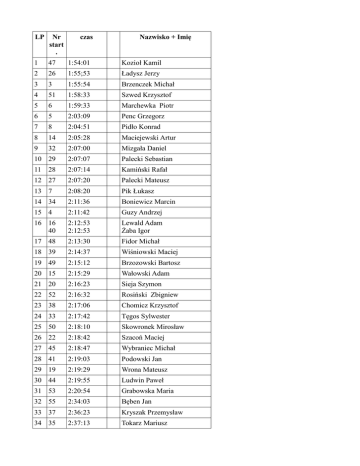 czas Nazwisko + Imię LP Nr start . 1 47 1:54:01 Kozioł Kamil 2 26 1:55;53 Ładysz Jerzy 3 3 1:55:54 Brzenczek Michał 4 51 1:58:33 Szwed Krzysztof 5 6 1:59:33 Marchewka Piotr 6 5 2:03:09 Penc Grzegorz 7 8 2:04:51 Pidło Konrad 8 14 2:05:28 Maciejewski Artur 9 32 2:07:00 Mizgała Daniel 10 29 2:07:07 Palecki Sebastian 11 28 2:07:14 Kamiński Rafał 12 27 2:07:20 Palecki Mateusz 13 7 2:08:20 Pik Łukasz 14 34 2:11:36 Boniewicz Marcin 15 4 2:11:42 Guzy Andrzej 16 16 40 2:12:53 2:12:53 Lewald Adam Żaba Igor 17 48 2:13:30 Fidor Michał 18 39 2:14:37 Wiśniowski Maciej 19 49 2:15:12 Brzozowski Bartosz 20 15 2:15:29 Wałowski Adam 21 20 2:16:23 Sieja Szymon 22 52 2:16:32 Rosiński Zbigniew 23 38 2:17:06 Chomicz Krzysztof 24 33 2:17:42 Tęgos Sylwester 25 50 2:18:10 Skowronek Mirosław 26 22 2:18:42 Szacoń Maciej 27 45 2:18:47 Wybraniec Michał 28 41 2:19:03 Podowski Jan 29 19 2:19:29 Wrona Mateusz 30 44 2:19:55 Ludwin Paweł 31 53 2:20:54 Grabowska Maria 32 55 2:34:03 Bęben Jan 33 37 2:36:23 Kryszak Przemysław 34 35 2:37:13 Tokarz Mariusz 35 17 2:37:15 Kurek Łukasz 36 13 2:37:19 Chlewicki Remigiusz 37 46 2:40:39 Drumowicz Sławomir 38 24 2:44:30 Schmidt Paweł 39 21 2:44:44 Landowski Michał 40 10 2:45:50 Salij Dominik 41 42 2:46:48 Kazimierczak Michał 42 2 2:46:49 Pietrzyk Marek 43 11 2:47:21 Sitko Tomasz 44 12 2:49:06 Wiśniewski Paweł 45 54 2:49:24 Wrzos Bartosz 46 43 2:53:09 Szymaniak Adam 47 9 2:57:28 Filo Grzegorz 48 30 3:09:32 Pudło Paweł 49 1 18 25 36 3:32:41 Olszewski Fabian Wieczorek Bartosz Markiewicz Daniel Jursza Piotr 50 31 3:57:46 Sporek Sławomir 51 23 3:57:47 Koselski Krzysztof 52 53 54 55 56 nkl 57 nkl 58 nkl 59 nkl