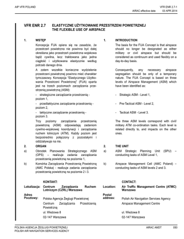 AIP VFR POLAND AIRAC effective date VFR ENR 2.7 1. VFR ENR 2.7-1 03 APR 2014 ELASTYCZNE UŻYTKOWANIE PRZESTRZENI POWIETRZNEJ THE FLEXIBLE USE OF AIRSPACE WSTĘP 1. INTRODUCTION Koncepcja FUA opiera się na zasadzie, że przestrzeń powietrzna nie powinna być dalej określana jako przestrzeń powietrzna wojskowa bądź cywilna, lecz traktowana jako jedna ciągłość i użytkowana elastycznie według potrzeb danego dnia. The basis for the FUA Concept is that airspace should no longer be designated as either military or civil airspace but should be considered as continuum and used flexibly on a day-to-day basis. A zatem wszelkie konieczne wydzielenie przestrzeni powietrznej powinno mieć charakter tymczasowy. Koncepcja “Elastycznego Użytkowania Przestrzeni Powietrznej” (FUA) oparta jest na trzech poziomach zarządzania przestrzenią powietrzną (ASM): Consequently, any necessary airspace segregation should be only of a temporary nature. The FUA Concept is based on three levels of Airspace Management (ASM) which have been identified as: - strategiczne zarządzanie przestrzenią poziom 1, - Strategic ASM - Level 1, - przedtaktyczne zarządzanie przestrzenią poziom 2, - Pre-Tactical ASM - Level 2, - taktyczne zarządzanie przestrzenią poziom 3. - Tactical ASM - Level 3. Trzy poziomy zarządzania przestrzenią powietrzną (ASM) odpowiadają zadaniom cywilno-wojskowej koordynacji i zarządzania ruchem lotniczym (ATM). Każdy poziom jest bezpośrednio połączony z pozostałymi i oddziaływuje na nie. The three ASM levels correspond with civil/ military ATM co-ordination tasks. Each level is related directly to, and impacts on the other ones. 2. ORGAN 2. THE UNIT a) Ośrodek Planowania Strategicznego ASM (OPS) – realizuje zadania zarządzania przestrzenią powietrzną na poziomie 1, a) ASM Strategic Planning Unit conducting tasks of ASM Level 1, b) Komórka Zarządzania Przestrzenią Powietrzną (AMC Polska) - realizuje zadania zarządzania przestrzenią powietrzną na poziomie 2 i 3. b) Airspace Management Cell (AMC Poland) – conducting tasks of ASM levels 2 and 3. KONTAKT: Location: Adres Pocztowy: Postal address: Polska Agencja Żeglugi Powietrznej Przestrzenią Air Traffic Management Centre (ATMC) Warszawa Polish Air Navigation Services Agency Airspace Management Centre ul. Wieżowa 8 ul. Wieżowa 8 02-147 Warszawa 02-147 Warszawa POLSKA AGENCJA ŻEGLUGI POWIETRZNEJ POLISH AIR NAVIGATION SERVICES AGENCY – CONTACT: Lokalizacja: Centrum Zarządzania Ruchem Lotniczym (CZRL) Warszawa Centrum Zarządzania Powietrzną (SPU) AIRAC AMDT 050 AIP VFR POLAND VFR ENR 2.7-2 AIRAC effective date 05 MAR 2015 AFTN: EPWWZAMC AFTN: EPWWZAMC E-mail: [email protected] E-mail: [email protected] www: http://www.amc.pansa.pl www: http://www.amc.pansa.pl Ośrodek Planowania Strategicznego (OPS ASM-1) Godziny pracy: MON - FRI: 0600-1400 (0500-1300) UTC Telefon: +48-22-574-5720 do 5723 Strategic Planning Unit (SPU ASM-1) Hours of service: (z wyjątkiem świąt państwowych) (excluding national holidays) Phone: +48-22-574-5720 to 5723 Fax: +48-22-574-5729 +48-261-828-515 Faks: +48-22-574-5729 MON - FRI: 0600-1400 (0500-1300) UTC +48-261-828-515 1) - patrz VFR GEN 2.1 1) - see VFR GEN 2.1 AMC (ASM-2) AMC (ASM-2) Godziny pracy: MON - FRI: 0600-1400 (0500-1300) UTC Hours of service: Telefon: +48-22-574-5732, +48-261-828-129 Phone: Faks: +48-22-574-5738, +48-261-828-473 Fax: (z wyjątkiem świąt państwowych) MON - FRI: 0600-1400 (0500-1300) UTC (excluding national holidays) 1) - patrz VFR GEN 2.1 +48-22-574-5732, +48-261-828-129 +48-22-574-5738, +48-261-828-473 1) - see VFR GEN 2.1 AMC (ASM-3) AMC (ASM-3) Godziny pracy: H24 Hours of service: H24 Telefon: +48-22-574-5733 do 5735 Phone: +48-22-574-5733 to 5735 +48-261-828-229, +48-261-828-130 Faks: 3. +48-22-574-5737, +48-261-828-529 ZADANIA +48-261-828-229, +48-261-828-130 Fax: 3. ASM POZIOM 1 – OŚRODEK PLANOWANIA STRATEGICZNEGO +48-22-574-5737, +48-261-828-529 TASKS ASM LEVEL 1 – STRATEGIC PLANNING UNIT a) Coroczna analiza efektywności wykorzystania przestrzeni powietrznej. a) Annual review of the efficiency of airspace utilisation. b) Opracowywanie propozycji ustanowienia nowych lub modyfikacji istniejących struktur przestrzeni powietrznej. b) Planning the establishment or modifications of existing airspace structures. c) Opracowywanie propozycji wprowadzenia zmian procedur przydzielania i użytkowania przestrzeni powietrznej. c) Enforcing proposal of changes of procedures concerning airspace assignment and utilisation. d) Opracowywanie propozycji wprowadzenia zmian w klasyfikacji przestrzeni powietrznej ATS. d) Enforcing proposal of changes to the ATS airspace classification. AIRAC AMDT 062 POLSKA AGENCJA ŻEGLUGI POWIETRZNEJ POLISH AIR NAVIGATION SERVICES AGENCY AIP VFR POLAND AIRAC effective date VFR ENR 2.7-3 08 JAN 2015 e) Udział w planowaniu wielkich przedsięwzięć na długo przed dniem ich przeprowadzenia (ćwiczenia lotnictwa wojskowego, zawody, pokazy). e) Coordination planning of major events long before the day of operation (large scale military exercises, air shows, competitions). f) Okresowy przegląd procedur i sprawności przebiegu operacji na poziomie ASM-2. f) Periodical review of procedures and operations efficiency at ASM Level 2. g) Okresowy przegląd przebiegu operacji na poziomie ASM-3. g) Periodical review of procedures at ASM Level 3. h) Udział w pracach międzynarodowych grup roboczych. h) Participation in international workshops. ASM POZIOM 2 – KOMÓRKA ZARZĄDZANIA PRZESTRZENIĄ POWIETRZNĄ ASM LEVEL 2 – AIRSPACE MANAGEMENT CELL a) Zbieranie i analiza zamówień na przestrzeń powietrzną. a) Collection and analysis of airspace requests. b) Rozstrzyganie kolidujących próśb o przydział TSA/TRA. b) Resolving TSA/TRA requests being in conflict. c) Rozstrzyganie konfliktów wynikających z nie dających się pogodzić lub kolidujących próśb o przydział przestrzeni powietrznej przez stosowanie zatwierdzonych pr