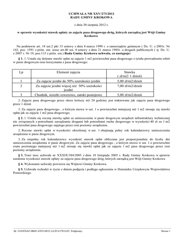 UCHWAŁA NR XXV/273/2012 RADY GMINY KROKOWA z dnia 30 sierpnia 2012 r. w sprawie wysokości stawek opłaty za zajęcie pasa drogowego dróg, których zarządcą jest Wójt Gminy Krokowa Na podstawie art. 18 ust.2 pkt 15 ustawy z dnia 8 marca 1990 r. o samorządzie gminnym ( Dz. U. z 2001r. Nr 142, poz. 1591 z późn. zm. )oraz art.40 ust. 8 ustawy z dnia 21 marca 1985r. o drogach publicznych ( tj. Dz. U. z 2007 r. Nr 19, poz.115 z późn. zm.) Rada Gminy Krokowa uchwala, co następuje: § 1. 1. Ustala się dzienne stawki opłat za zajęcie 1 m2 powierzchni pasa drogowego z tytułu prowadzenia robót w pasie drogowym oraz korzystania z pasa drogowego: Lp Element zajęcia 1 2 Za zajęcie jezdni do 50% szerokości jezdni Za zajęcie jezdni więcej niż 50% szerokości jezdni Chodnik, ścieżki rowerowe, zatoki postojowe 3 Stawka ( zł/m2/ 1 dzień) 5,00 zł/m2/dzień 7,00 zł/m2/dzień 5,00 zł/m2/dzień 2. Zajęcie pasa drogowego przez okres krótszy niż 24 godziny jest traktowane jak zajęcie pasa drogowego przez 1 dzień 3. Za zajęcie pasa drogowego , o którym mowa w ust. 1 o powierzchni mniejszej niż 1 m2 stosuje się stawki opłat jak za zajęcie 1 m2 pasa drogowego. § 2. 1. Ustala się roczną stawkę opłat za umieszczenie w pasie drogowym urządzeń infrastruktury technicznej nie związanych z potrzebami zarządzania drogami lub potrzebami ruchu drogowego w wysokości 40 zł za 1 m2 powierzchni pasa drogowego zajętego przez rzut poziomy urządzenia. 2. Roczne stawki opłat w wysokości określonej w ust. 1 obejmują pełny rok kalendarzowy umieszczenia urządzenia w pasie drogowym. 3. Za niepełny rok kalendarzowy wysokość stawek opłat obliczana jest proporcjonalnie do liczby dni umieszczenia urządzenia w pasie drogowym. Za zajęcie pasa drogowego , o którym mowa w ust. 1 o powierzchni rzutu poziomego mniejszej niż 1 m2 stosuje się stawki opłat jak za zajęcie 1 m2 pasa drogowego przez rzut poziomy urządzenia. § 3. Traci moc uchwała nr XXXIX/384/2005 z dnia 18 listopada 2005 r. Rady Gminy Krokowa w sprawie ustalenia wysokości stawek opłaty za zajęcie pasa drogowego dróg, których zarządcą jest Wójt Gminy Krokowa § 4. Wykonanie uchwały powierza się Wójtowi Gminy Krokowa. § 5. Uchwała wchodzi w życie z dniem podjęcia i podlega ogłoszeniu w Dzienniku Urzędowym Województwa Pomorskiego. ————————————————————————————————————————————————————————— Id: 3343FDAF-0B45-43F9-8852-2A5FA3783A92. Podpisany Strona 1 Uzasadnienie Spółka G.EN. GAZ Energia S.A. wniosła w dniu 18 czerwca 2012 r. do Rady Gminy Krokowa wezwanie do usunięcia naruszenia przepisów prawa poprzez zmianę uchwały Nr XXXIX/384/2005 z dnia 18 listopada 2005 r. w sprawie ustalenia wysokości stawek za zajecie pasa drogowego. W świetle obecnie obowiązujących przepisów prawa zwolnienie z opłat z tytułu zajmowania pasa drogowego przez urządzenia, których właścicielem jest Gmina Krokowa narusza zasadę równego traktowania podmiotów gospodarczych. W związku z powyższym podjęcie uchwały jest zasadne. ————————————————————————————————————————————————————————— Id: 3343FDAF-0B45-43F9-8852-2A5FA3783A92. Podpisany Strona 1