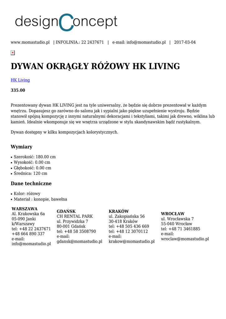 www.momastudio.pl | INFOLINIA.: 22 2437671 | e-mail: [email protected] | 2017-03-04 DYWAN OKRĄGŁY RÓŻOWY HK LIVING HK Living 335.00 Prezentowany dywan HK LIVING jest na tyle uniwersalny, że będzie się dobrze prezentował w każdym wnętrzu. Dopasujesz go zarówno do salonu jak i sypialni jako piękne uzupełnienie wystroju. Będzie stanowił spójną kompozycję z innymi naturalnymi dekoracjami i tekstyliami, takimi jak drewno, wiklina lub kamień. Idealnie wkomponuje się we wnętrza urządzone w stylu skandynawskim bądź rustykalnym. Dywan dostępny w kilku kompozycjach kolorystycznych. Wymiary ● ● ● ● Szerokość: 180.00 cm Wysokość: 0.00 cm Głębokość: 0.00 cm Średnica: 120 cm Dane techniczne ● ● Kolor: różowy Materiał : konopie, bawełna WARSZAWA Al. Krakowska 6a 05-090 Janki k/Warszawy tel: +48 22 2437671 +48 664 890 337 e-mail: [email protected] GDAŃSK CH RENTAL PARK ul. Przywidzka 7 80-001 Gdańsk tel: +48 58 3508790 e-mail: [email protected] KRAKÓW ul. Zakopiańska 56 30-418 Kraków tel: +48 505 436 669 tel: +48 12 3070112 e-mail: [email protected] WROCŁAW ul. Wrocławska 7 55-040 Wrocław tel: +48 71 3461885 e-mail: [email protected]