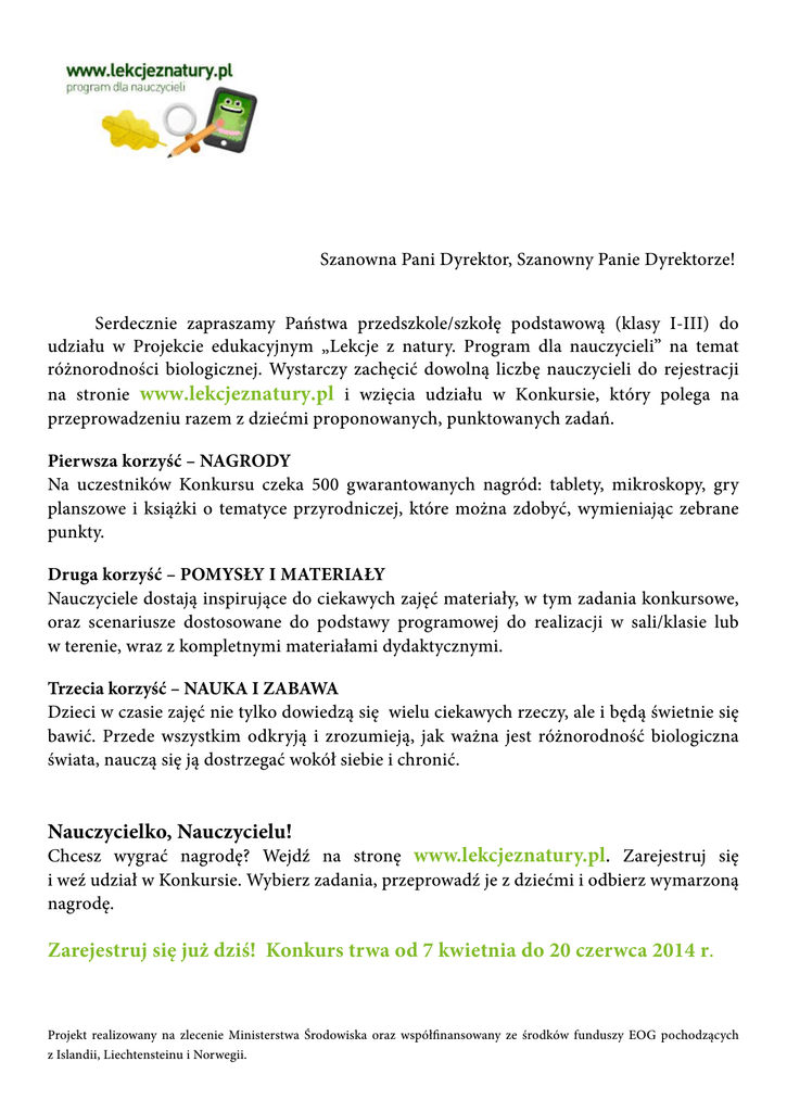 Szanowna Pani Dyrektor, Szanowny Panie Dyrektorze! Serdecznie zapraszamy Państwa przedszkole/szkołę podstawową (klasy I-III) do udziału w Projekcie edukacyjnym „Lekcje z natury. Program dla nauczycieli” na temat różnorodności biologicznej. Wystarczy zachęcić dowolną liczbę nauczycieli do rejestracji na stronie www.lekcjeznatury.pl i wzięcia udziału w Konkursie, który polega na przeprowadzeniu razem z dziećmi proponowanych, punktowanych zadań. Pierwsza korzyść – NAGRODY Na uczestników Konkursu czeka 500 gwarantowanych nagród: tablety, mikroskopy, gry planszowe i książki o tematyce przyrodniczej, które można zdobyć, wymieniając zebrane punkty. Druga korzyść – POMYSŁY I MATERIAŁY Nauczyciele dostają inspirujące do ciekawych zajęć materiały, w tym zadania konkursowe, oraz scenariusze dostosowane do podstawy programowej do realizacji w sali/klasie lub w terenie, wraz z kompletnymi materiałami dydaktycznymi. Trzecia korzyść – NAUKA I ZABAWA Dzieci w czasie zajęć nie tylko dowiedzą się wielu ciekawych rzeczy, ale i będą świetnie się bawić. Przede wszystkim odkryją i zrozumieją, jak ważna jest różnorodność biologiczna świata, nauczą się ją dostrzegać wokół siebie i chronić. Nauczycielko, Nauczycielu! Chcesz wygrać nagrodę? Wejdź na stronę www.lekcjeznatury.pl. Zarejestruj się i weź udział w Konkursie. Wybierz zadania, przeprowadź je z dziećmi i odbierz wymarzoną nagrodę. Zarejestruj się już dziś! Konkurs trwa od 7 kwietnia do 20 czerwca 2014 r. Projekt realizowany na zlecenie Ministerstwa Środowiska oraz współfinansowany ze środków funduszy EOG pochodzących z Islandii, Liechtensteinu i Norwegii. Kto wie lepiej od Ciebie, że o różnorodności biologicznej warto, a nawet trzeba rozmawiać już z małymi dziećmi? Dziecko interesuje się wszystkim. Taka jest jego natura. Zadaje niekończące się pytania: „a co to?”, „a dlaczego?”, „a po co?” Mamy więc niepowtarzalną szansę, by potraktować je jak partnera i mądrze, inspirująco zaspokoić jego ciekawość. Różnorodność biologiczna jest idealnym tematem, by zaciekawić nim dziecko. Gdy zainteresuje się choćby ptakami, a my pomożemy mu dotrzeć do wartościowych źródeł, zanim się spostrzeżemy, będzie w tej dziedzinie ekspertem. Taka nauka to radość rozwój, przygoda. Bez przymusu. Jedno dziecko zafascynują ptaki, inne drzewa, a jeszcze inne egzotyczne gady. Każdy wybór jest dobry. Warto wspierać w rozwoju i sprawić, by odkrywanie świata było niezwykłym przeżyciem. Różnorodność biologiczna wokół nas, czyli gdzie dziecko styka się z nią na co dzień Każda codzienna sytuacja może być pretekstem do podjęcia tematu różnorodności biologicznej. Kwiaciarnia – kwiaty i rośliny zielne o fantastycznych barwach – piękne w swojej odmienności. Rodzime i egzotyczne, z różnych zakątków świata. Wizyta w zoo – ptaki, ssaki, gady, płazy. Każde zwierzę jest inne. Możemy rozmawiać o różnorodności gatunków zwierząt. Piekarnia – chleb z pszenicy, z żyta, ze słonecznikiem, z kminkiem. Można rozmawiać o wadze różnorodności biologicznej dla wyżywienia ludności na całym świecie. Wycieczka do lasu, na łąkę – mnogość gatunków drzew, kwiatów, motyli, owadów… Można tu poszukiwać różnych gatunków, analizować różnice w budowie, przystosowaniu do warunków życia. Sklep zoologiczny – jest tu wiele gatunków ptaków, żółwi, chomików… Można bliżej się przyjrzeć egzotycznym zwierzętom, które hodujemy w domach. Stoisko z rybami w supermarkecie – każda ryba jest inna, to doskonały punkt wyjścia do rozmowy o gatunkach ryb zagrożonych wyginięciem. Spacer w parku – ludzie spacerują z psami różnych ras. Każdy pies jest inny. Są psy małe i duże, różnią się umaszczeniem, temperamentem. Zakupy na targu – różne odmiany jabłek, pomidorów, sałaty… Można porównywać ich wygląd, próbować smaków, zastanawiać się nad zróżnicowaniem odmian. Ogród botaniczny – rośliny, często chronione, których nie zobaczymy na co dzień w parku ani w lesie. Wyjątkowa możliwość obserwacji gatunków egzotycznych, chronionych, odtworzonych. Wyjazd poza miejsce zamieszkania – w góry, nad morze, do innego kraju – doskonała okazja do poszukiwania różnic pomiędzy nowym miejscem a okolicą, w której się mieszka. Edukacja na rzecz różnorodności biologicznej, gdy rozpoczniemy ją możliwie wcześnie, będzie kształtować u dzieci ciekawość, wrażliwość oraz umiejętność rozumowania naukowego – z jednej strony analitycznego i badawczego, z drugiej otwartego na nowe doznania, kreatywne rozwiązania. Będzie doskonałym pretekstem do twórczej pracy z dziećmi – poprzez rozmowę, obserwację, wspólne działanie, tworzenie. Nauczycielu, zapraszamy Cię do udziału w programie dla przedszkoli i klas I-III szkoły podstawowej. Uczestnictwo jest proste i bezpłatne. Gwarantowane cenne nagrody czekają na Ciebie! Zabierzmy dzieci w fascynującą podróż w świat różnorodności biologicznej. Czy chcesz zabrać dzieci w fascynującą podróż w świat różnorodności biologicznej? TAK! 1. Wejdź na stronę internetową www.lekcjeznatury.pl 2. Weź udział w Konkursie 3. Przeprowadź ciekawe zajęcia z dziećmi 4. Wygraj wartościową nagrodę Wybierz i zdobądź jedną z 500 gwarantowanych nagród, w tym tablety, mikroskopy, gry planszowe, płyty edukacyjne i wiele innych. Konkurs trwa od 7 kwietnia do 20 czerwca 2014 r. Wejdź na stronę Konkursu już dziś! Będziecie dobrze się bawić! Projekt realizowany na zlecenie Ministerstwa Środowiska oraz współfinansowany ze środków funduszy EOG pochodzących z Islandii, Liechtensteinu i Norwegii.