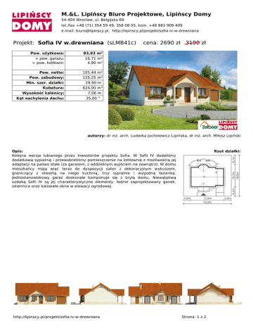 M.&L. Lipińscy Biuro Projektowe, Lipińscy Domy 54-404 Wrocław, ul. Belgijska 69 tel./fax +48 (71) 354 59 49, 358 08 55, kom. +48 883 909 409 e-mail: [email protected], http://lipinscy.pl/projekt/sofia-iv-w-drewniana Projekt: Sofia IV w.drewniana (sLMB41c) Pow. użytkowa: + pow. garażu: + pow. kotłowni: 83,83 m² 16,71 m² 4,90 m² Pow. netto: Pow. zabudowy: Min. szer. działki: Kubatura: Wysokość kalenicy: Kąt nachylenia dachu: 105,44 m² 125,25 m² 19,90 m 624,00 m³ 7,06 m 35,00 ° cena: 2690 zł 3190 zł autorzy: dr inż. arch. Ludwika Juchniewicz-Lipińska, dr inż. arch. Miłosz Lipiński Opis: Kolejna wersja lubianego przez Inwestorów projektu Sofia. W Sofii IV dodaliśmy dodatkową sypialnię i przewidzieliśmy pomieszczenie na kotłownię z możliwością jej adaptacji na paliwo stałe (za garażem, z oddzielnym wyjściem na zewnątrz). W domu mieszkańcy mają więc teraz do dyspozycji salon z dekoracyjnym wykuszem, graniczący z otwartą na niego kuchnią, trzy sypialnie i wygodną łazienkę. Jednostanowiskowy garaż doskonale komponuje się z bryłą domu. Niewątpliwą ozdobą Sofii IV są jej charakterystyczne elementy: ładnie zaprojektowany ganek, okiennice oraz łukowate okna w elewacji ogrodowej. http://lipinscy.pl/projekt/sofia-iv-w-drewniana Rzut działki: Strona: 1 z 2 Powered by TCPDF (www.tcpdf.org) Projekt: Sofia IV w.drewniana (sLMB41c) Parter: 105,44 m² Powierzchnia łączna: 105,44 m² 1.1 Wiatrołap 1.2 Pom.gosp. 1.3 Łazienka 1.4 Pokój 1.5 Pokój 1.6 Salon 1.7 Kuchnia 1.8 Pokój 1.9 Komunikacja 1.10 Garaż 1.11 Kotłownia 5,11 m² 0,86 m² 6,30 m² 10,97 m² 11,89 m² 21,50 m² 10,97 m² 10,48 m² 5,75 m² 16,71 m² 4,90 m² oraz: 1.12 Podest 1.13 Taras http://lipinscy.pl/projekt/sofia-iv-w-drewniana 7,59 m² 22,64 m² Strona: 2 z 2
