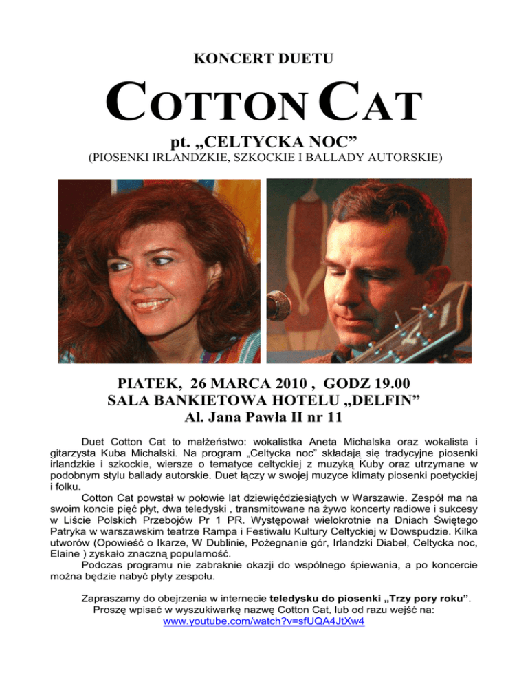 KONCERT DUETU COTTON CAT pt. „CELTYCKA NOC” (PIOSENKI IRLANDZKIE, SZKOCKIE I BALLADY AUTORSKIE) PIATEK, 26 MARCA 2010 , GODZ 19.00 SALA BANKIETOWA HOTELU „DELFIN” Al. Jana Pawła II nr 11 Duet Cotton Cat to małżeństwo: wokalistka Aneta Michalska oraz wokalista i gitarzysta Kuba Michalski. Na program „Celtycka noc” składają się tradycyjne piosenki irlandzkie i szkockie, wiersze o tematyce celtyckiej z muzyką Kuby oraz utrzymane w podobnym stylu ballady autorskie. Duet łączy w swojej muzyce klimaty piosenki poetyckiej i folku. Cotton Cat powstał w połowie lat dziewięćdziesiątych w Warszawie. Zespół ma na swoim koncie pięć płyt, dwa teledyski , transmitowane na żywo koncerty radiowe i sukcesy w Liście Polskich Przebojów Pr 1 PR. Występował wielokrotnie na Dniach Świętego Patryka w warszawskim teatrze Rampa i Festiwalu Kultury Celtyckiej w Dowspudzie. Kilka utworów (Opowieść o Ikarze, W Dublinie, Pożegnanie gór, Irlandzki Diabeł, Celtycka noc, Elaine ) zyskało znaczną popularność. Podczas programu nie zabraknie okazji do wspólnego śpiewania, a po koncercie można będzie nabyć płyty zespołu. Zapraszamy do obejrzenia w internecie teledysku do piosenki „Trzy pory roku”. Proszę wpisać w wyszukiwarkę nazwę Cotton Cat, lub od razu wejść na: www.youtube.com/watch?v=sfUQA4JtXw4