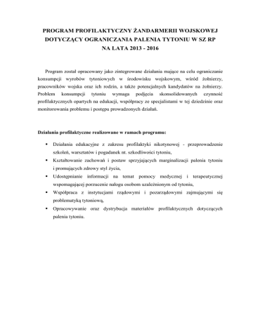 PROGRAM PROFILAKTYCZNY ŻANDARMERII WOJSKOWEJ DOTYCZĄCY OGRANICZANIA PALENIA TYTONIU W SZ RP NA LATA 2013 - 2016 Program został opracowany jako zintegrowane działania mające na celu ograniczanie konsumpcji wyrobów tytoniowych w środowisku wojskowym, wśród żołnierzy, pracowników wojska oraz ich rodzin, a także potencjalnych kandydatów na żołnierzy. Problem konsumpcji tytoniu wymaga podjęcia skonsolidowanych czynność profilaktycznych opartych na edukacji, współpracy ze specjalistami w tej dziedzinie oraz monitorowania problemu i postępu prowadzonych działań. Działania profilaktyczne realizowane w ramach programu: Działania edukacyjne z zakresu profilaktyki nikotynowej - przeprowadzenie szkoleń, warsztatów i pogadanek nt. szkodliwości tytoniu, Kształtowanie zachowań i postaw sprzyjających marginalizacji palenia tytoniu i promujących zdrowy styl życia, Udostępnianie informacji na temat pomocy medycznej i terapeutycznej wspomagającej porzucenie nałogu osobom uzależnionym od tytoniu, Współpraca z instytucjami rządowymi i pozarządowymi zajmującymi się problematyką tytoniową, Opracowywanie oraz dystrybucja materiałów profilaktycznych dotyczących palenia tytoniu.