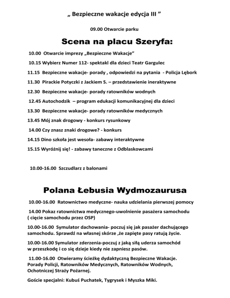 „ Bezpieczne wakacje edycja III ” 09.00 Otwarcie parku Scena na placu Szeryfa: 10.00 Otwarcie imprezy „Bezpieczne Wakacje” 10.15 Wybierz Numer 112- spektakl dla dzieci Teatr Gargulec 11.15 Bezpieczne wakacje- porady , odpowiedzi na pytania - Policja Lębork 11.30 Pirackie Potyczki z Jackiem S. – przedstawienie ineraktywne 12.30 Bezpieczne wakacje- porady ratowników wodnych 12.45 Autochodzik – program edukacji komunikacyjnej dla dzieci 13.30 Bezpieczne wakacje- porady ratowników medycznych 13.45 Mój znak drogowy - konkurs rysunkowy 14.00 Czy znasz znaki drogowe? - konkurs 14.15 Dino szkoła jest wesoła- zabawy interaktywne 15.15 Wyróżnij się! - zabawy taneczne z Odblaskowcami 10.00-16.00 Szczudlarz z balonami Polana Łebusia Wydmozaurusa 10.00-16.00 Ratownictwo medyczne- nauka udzielania pierwszej pomocy 14.00 Pokaz ratownictwa medycznego-uwolnienie pasażera samochodu ( cięcie samochodu przez OSP) 10.00-16.00 Symulator dachowania- poczuj się jak pasażer dachującego samochodu. Sprawdź na własnej skórze ,że zapięte pasy ratują życie. 10.00-16.00 Symulator zderzenia-poczuj z jaką siłą uderza samochód w przeszkodę i co się dzieje kiedy nie zapniesz pasów. 11.00-16.00 Otwieramy ścieżkę dydaktyczną Bezpieczne Wakacje. Porady Policji, Ratowników Medycznych, Ratowników Wodnych, Ochotniczej Straży Pożarnej. Goście specjalni: Kubuś Puchatek, Tygrysek i Myszka Miki. Wszystkie dzieci , które przejdą przez ścieżkę edukacyjną Dinuś obdaruje lodami. 11.00, 12.00.13.00,14.00 Pokazy ratownictwa wodnego- pokazy na wodzie WOPR Lębork Autochodzik- drogowe miasteczko dla najmłodszych . Za właściwe pokonanie trasy „ samochodzikiem” dzieci otrzymają swoje pierwsze prawo jazdy . Chata: Dinozaurowe rzemiosło 11.00-16.00- malowanie tęczowym piaskiem 800 zł Wioska indiańska: 12.00-16.00 Spotkanie z wodzem Kamienna Stopa Zabawy indiańskie z szamanką Szemrzący Strumień Mistrzostwa w Płukaniu Złota